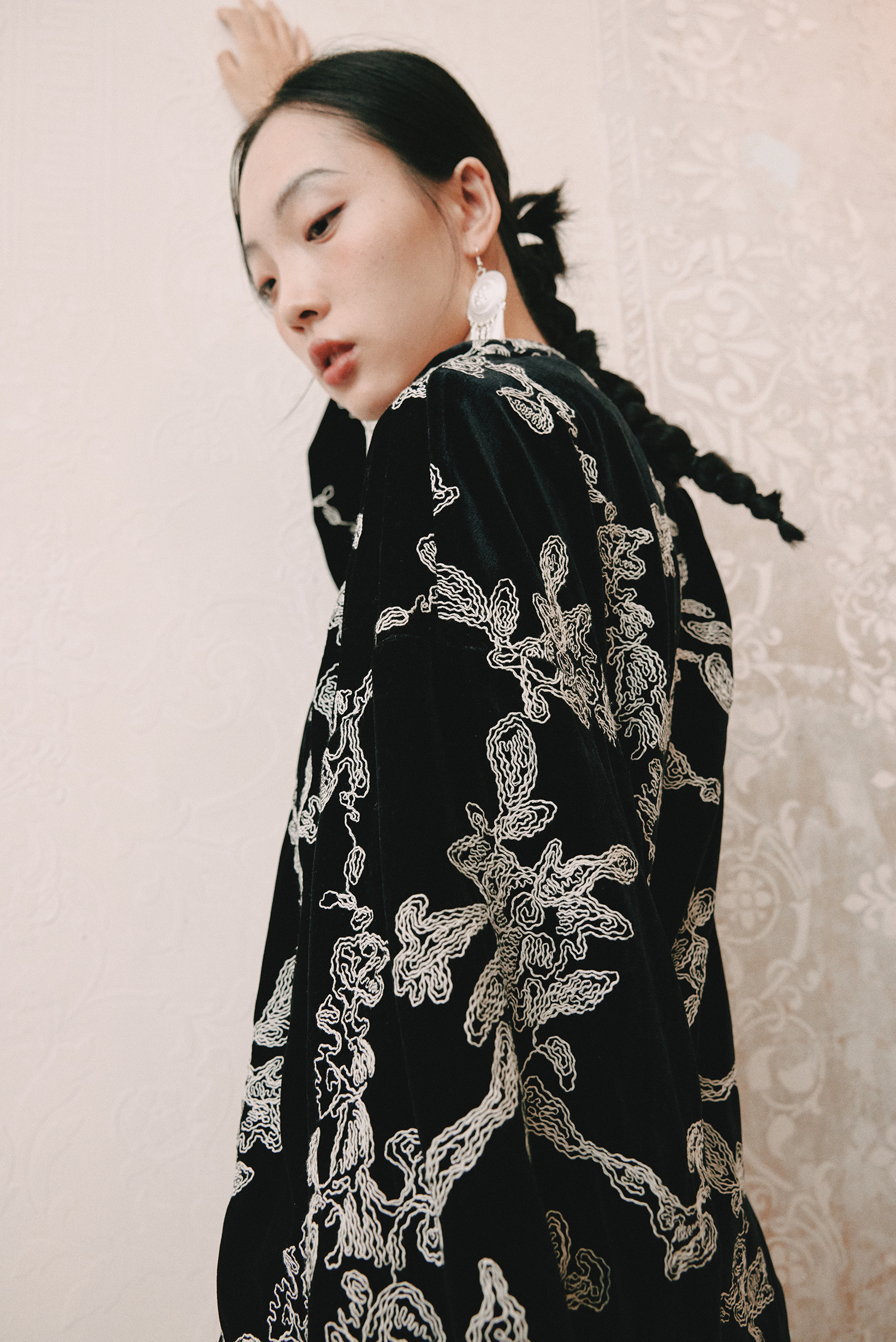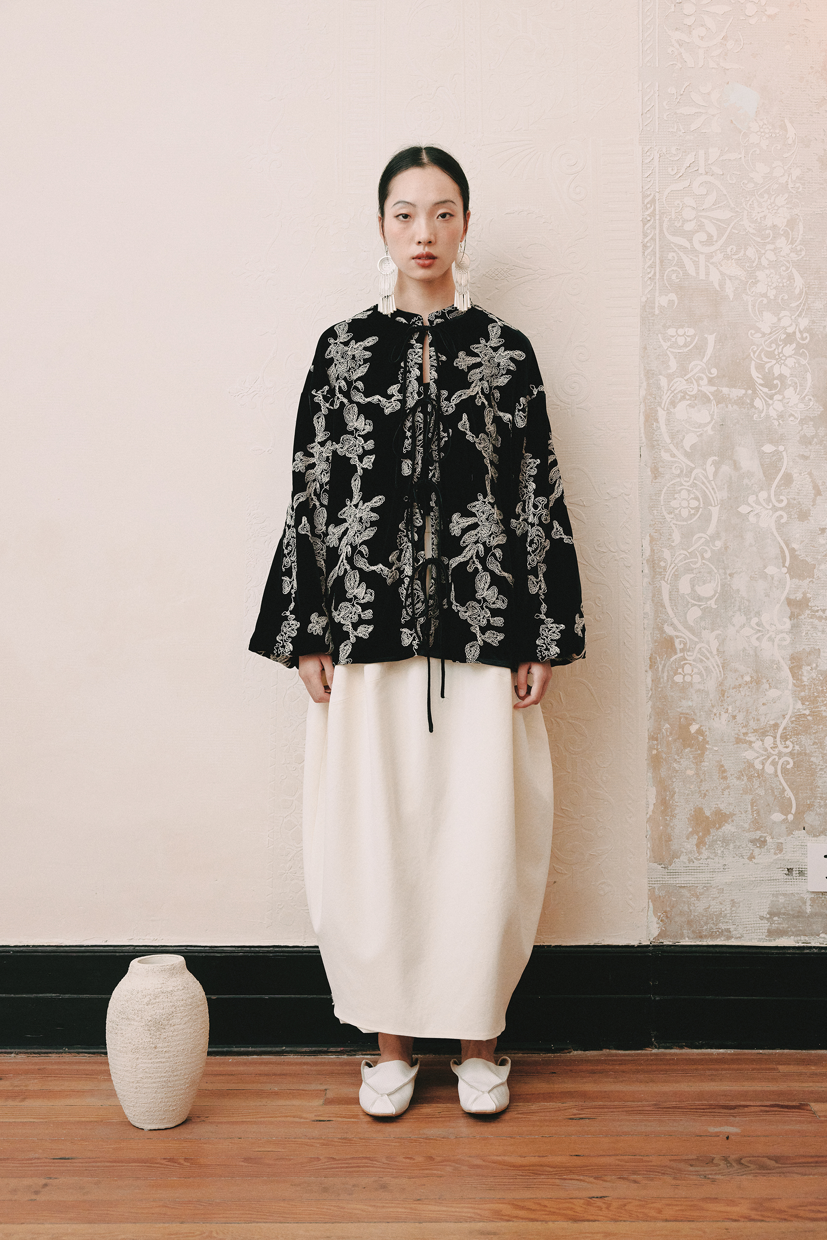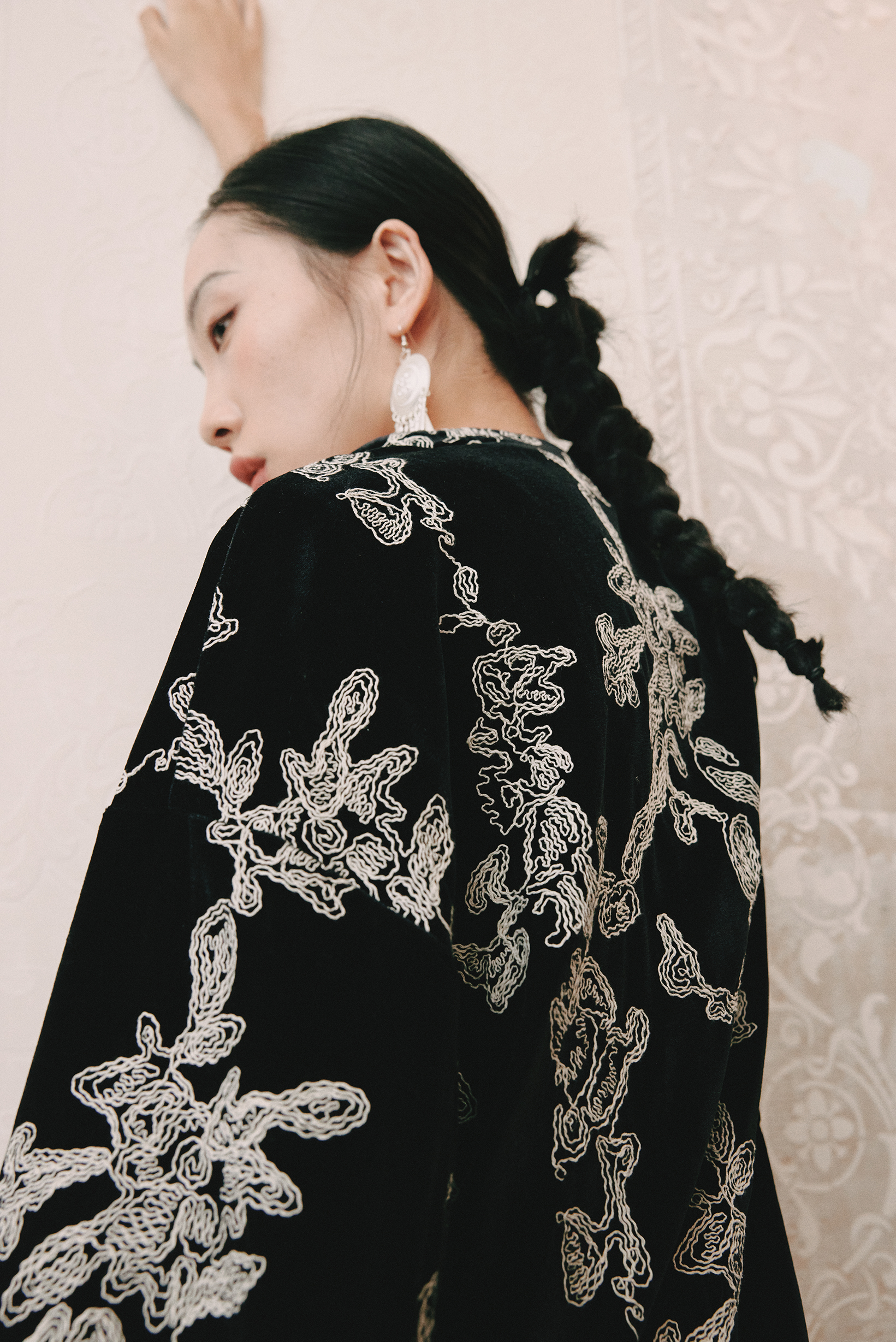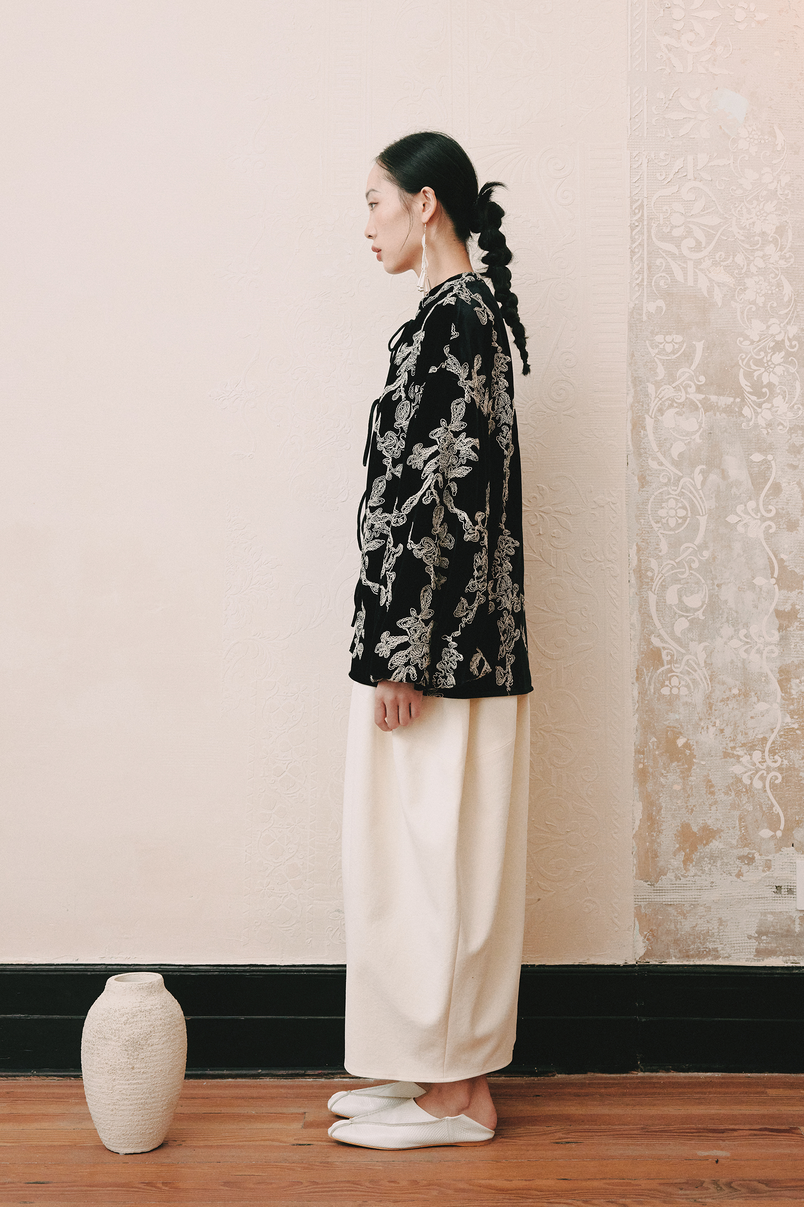 Yuanye Original New Chinese-Style Black Velvet Embroidered Stand-Up Collar Tie Lantern Sleeve Jacket