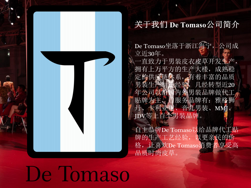 De Tomaso(德托马索)同名诞生于1959年的意大利超跑汽车品牌,是公司主理人早年留学法国时所创立,并取得了国内正规授权以及商标使用权。品牌定位于高端潮流品牌,原创设计,风格独特,强调时尚与奢华的融合。致力于为消费者提供高品质的穿着体验。品牌注重细节以及个性化为消费者提供多样化的选择,已满足不同的需求。