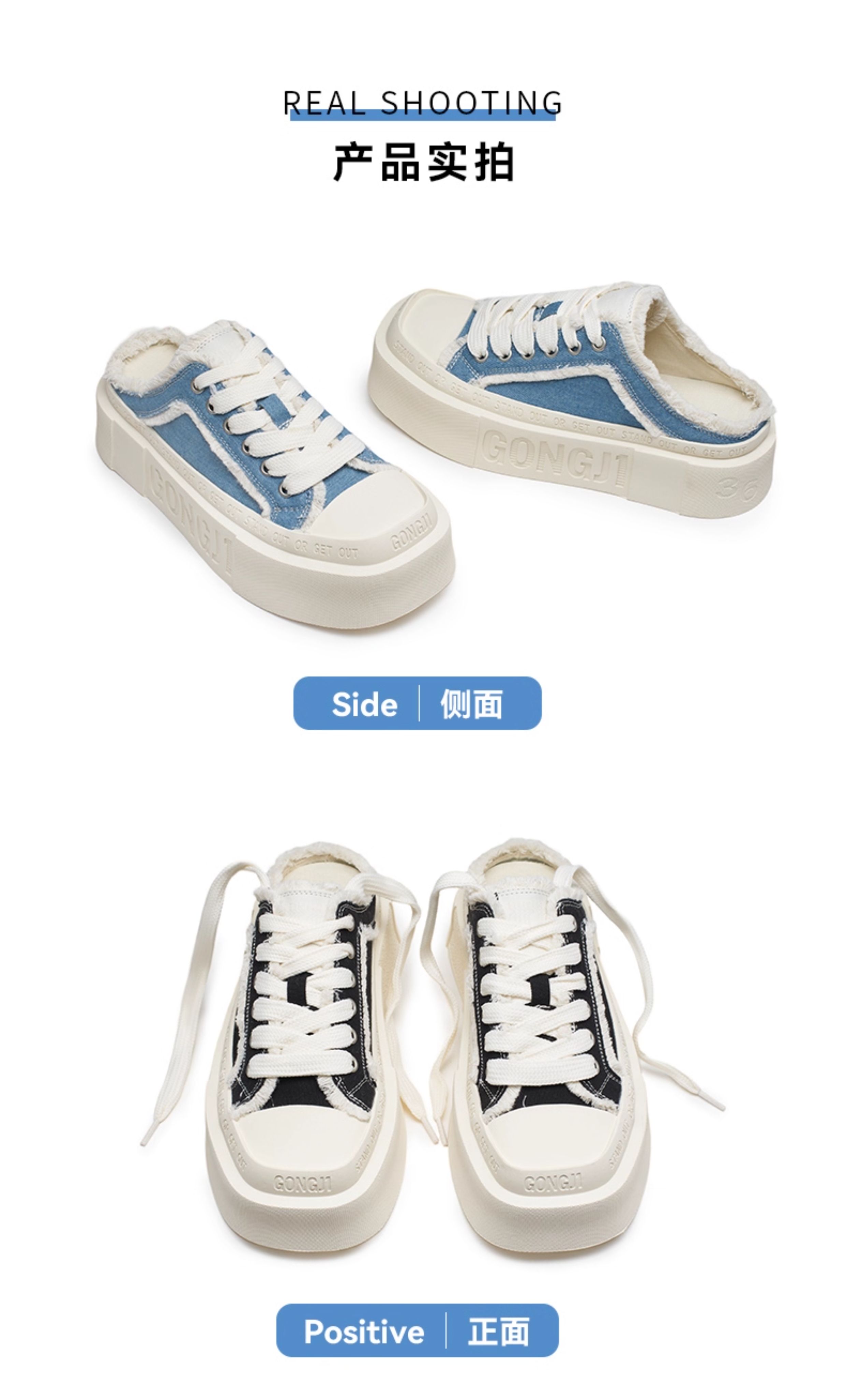 Meng Zi's Same Style Gongji Half-Slip Canvas Shoes for Women, Slip-On Thick-Soled Sneakers, Niche Casual Height-Increasing White Shoes