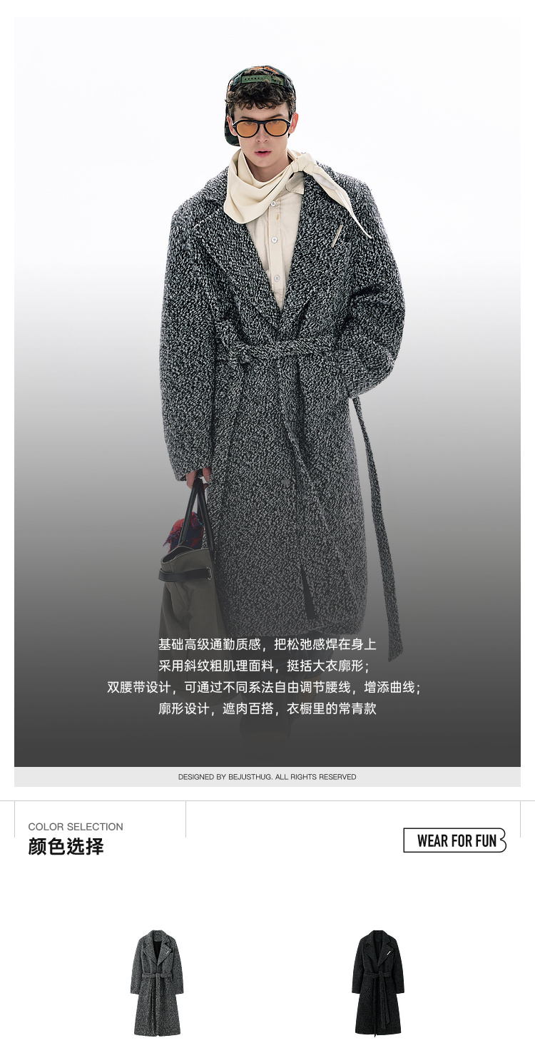 Bjhg Reckless Woolen Overcoat for Men, Winter Double-Belted, Knee-Length, High-End, Loose-Fitting Long Coat