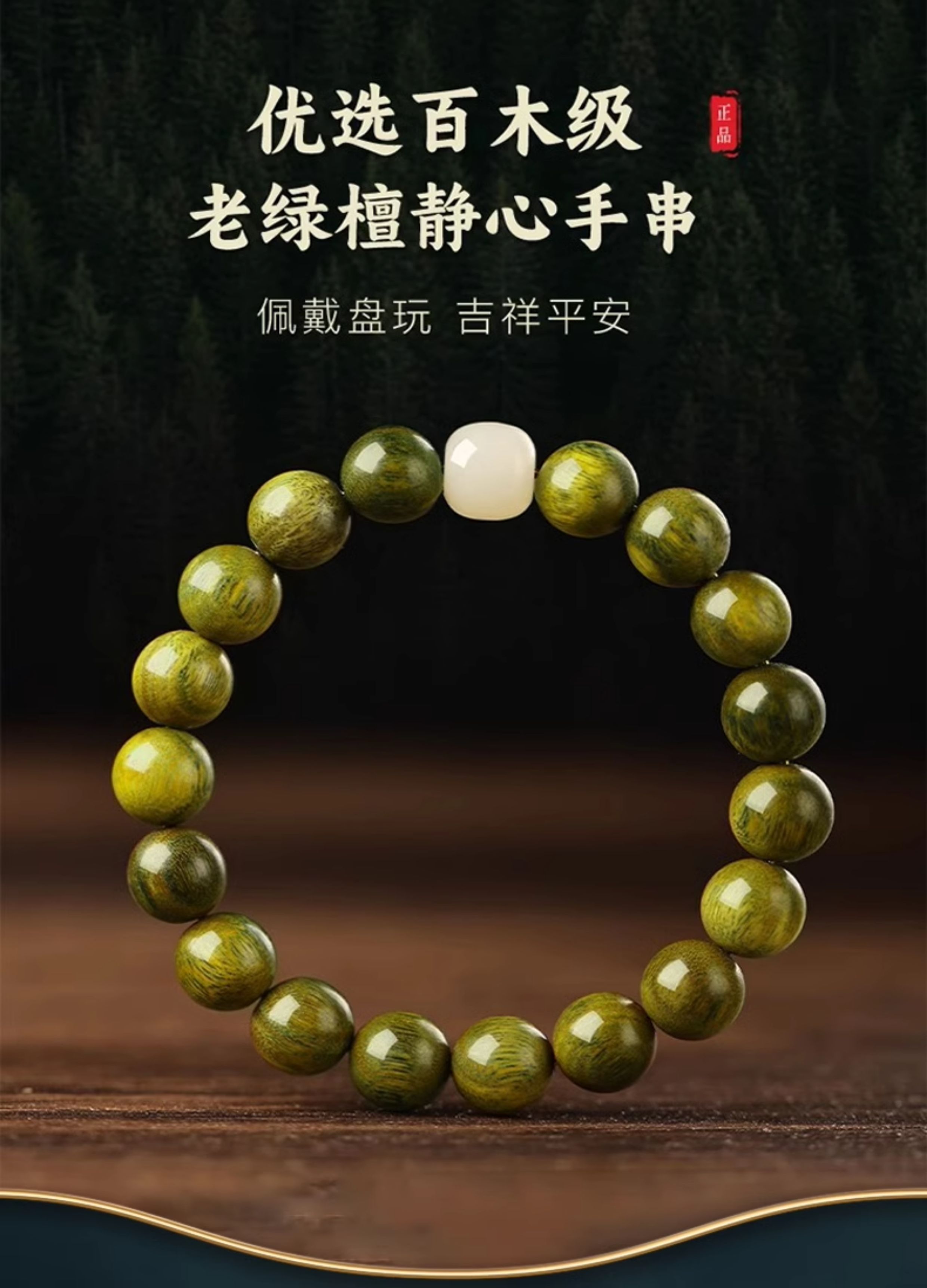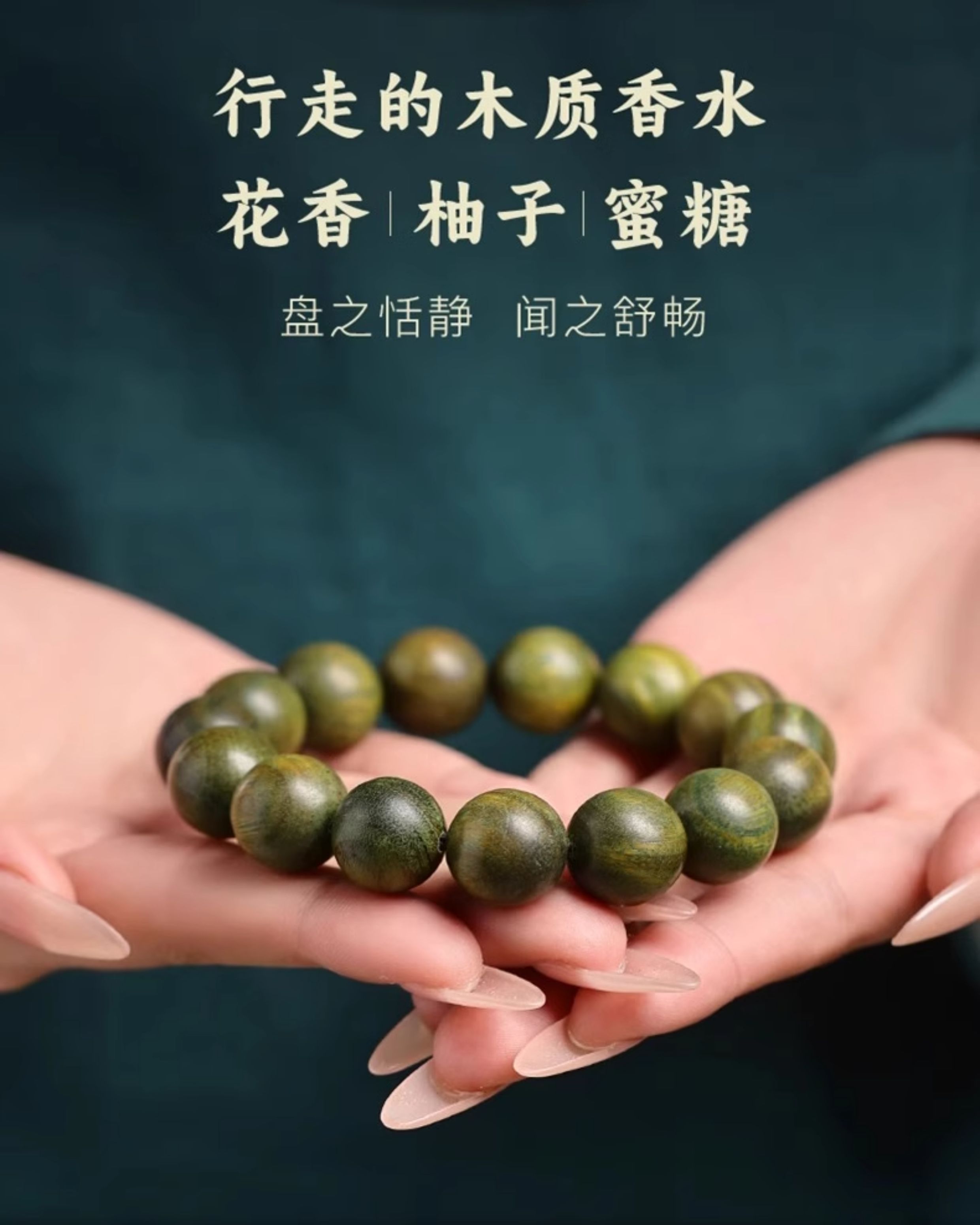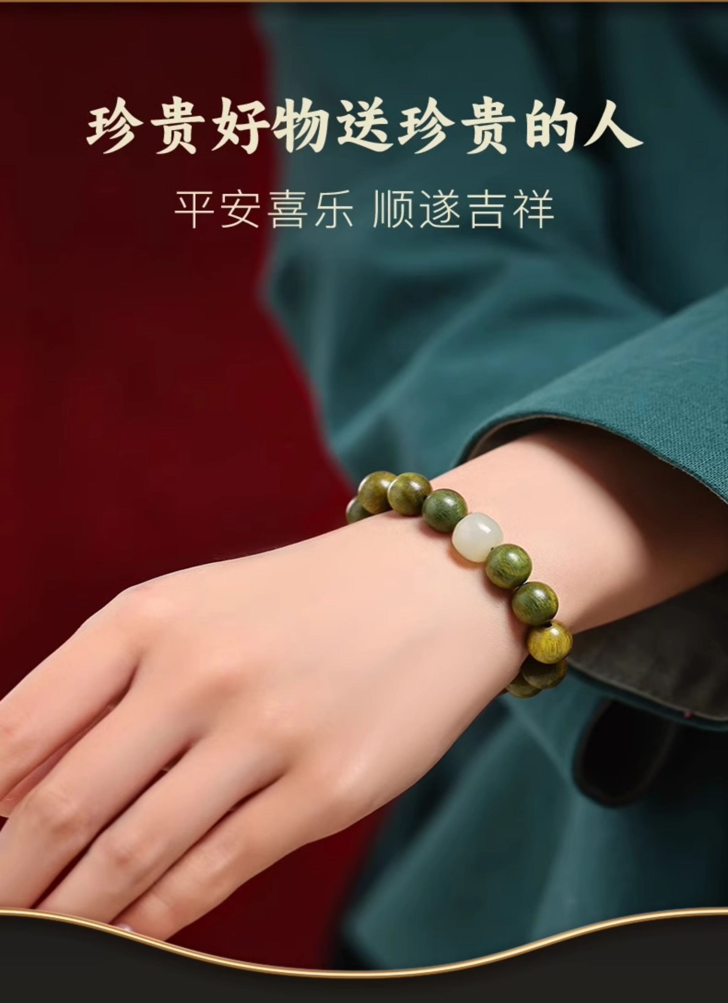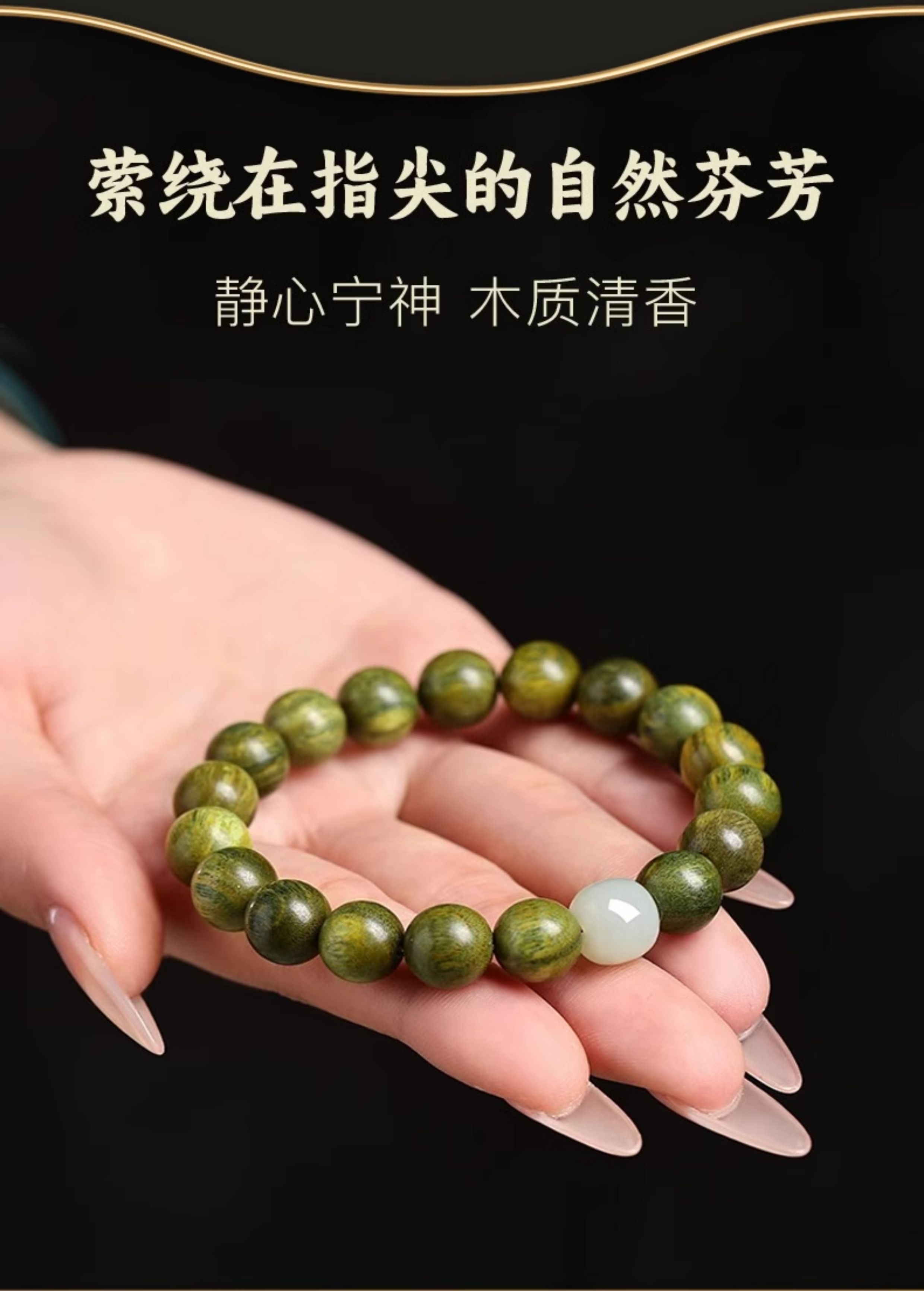 Putuo Mountain Natural Green Sandalwood Bracelet for Women, Sandalwood Beads for Play, Buddhist Prayer Beads, New Chinese Style National Poetry