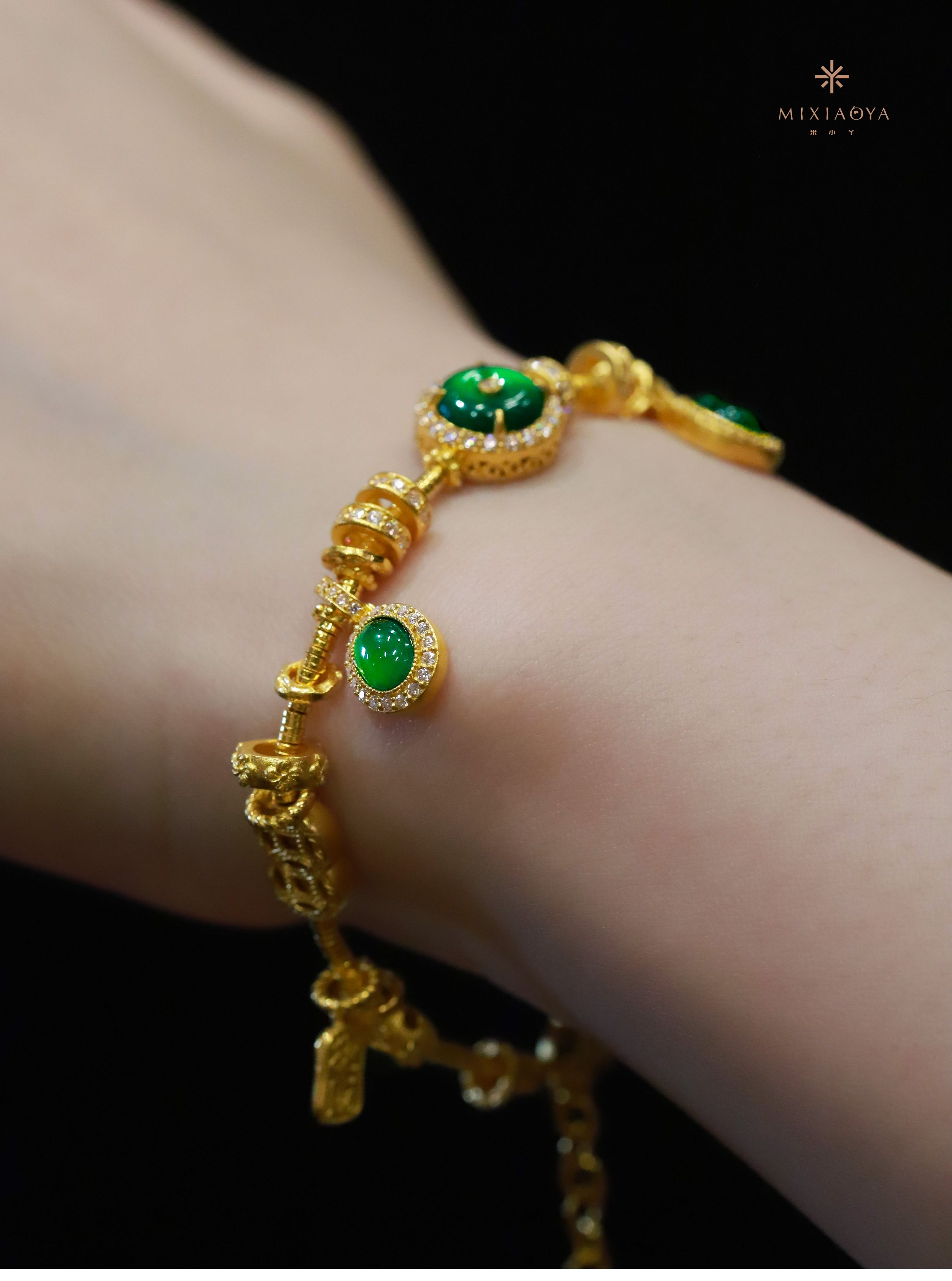 Mi Xiaoya Jewelry Pure Gold 999 Natural Jade Peace Pendant Bracelet with Diamond Inlay and Traditional Gold Gourd Twist Design