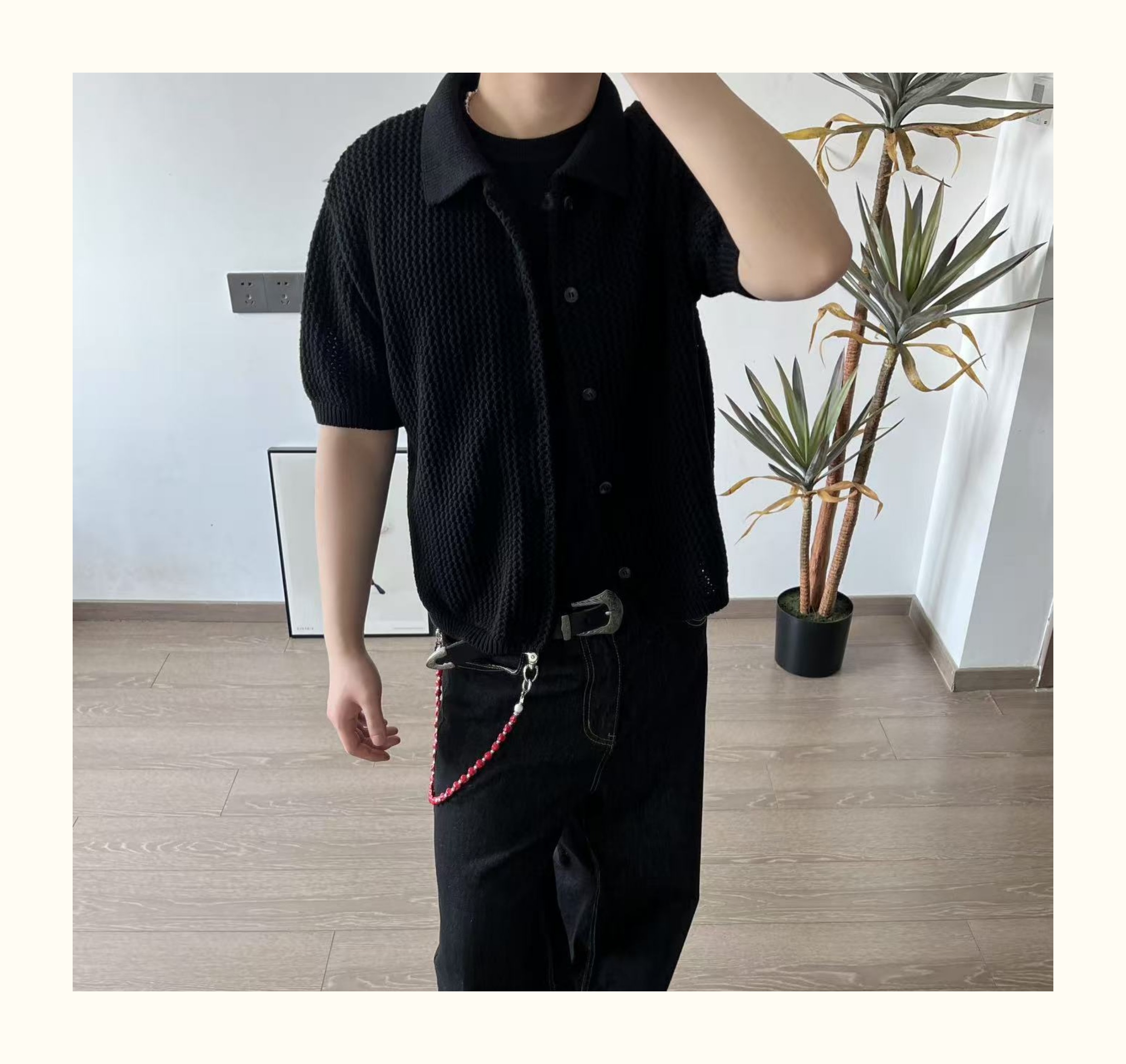 7Ac Spring and Summer Pure Cotton Cardigan Knitted Lapel Short-Sleeved Hollow Design Short Wide Fit Cleanfit