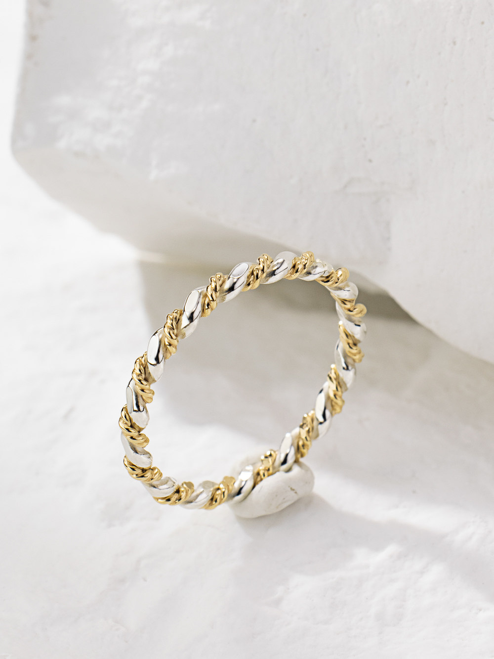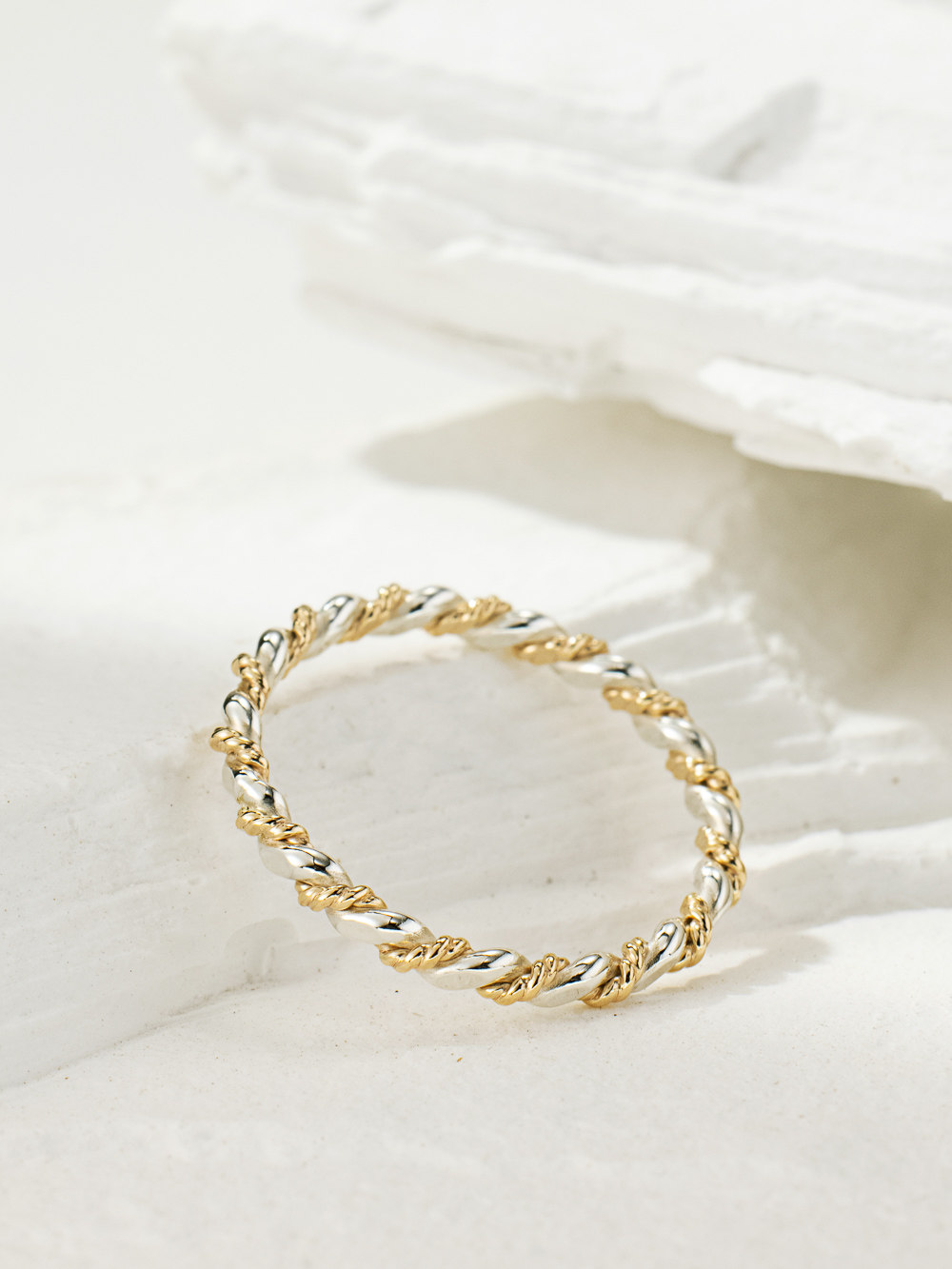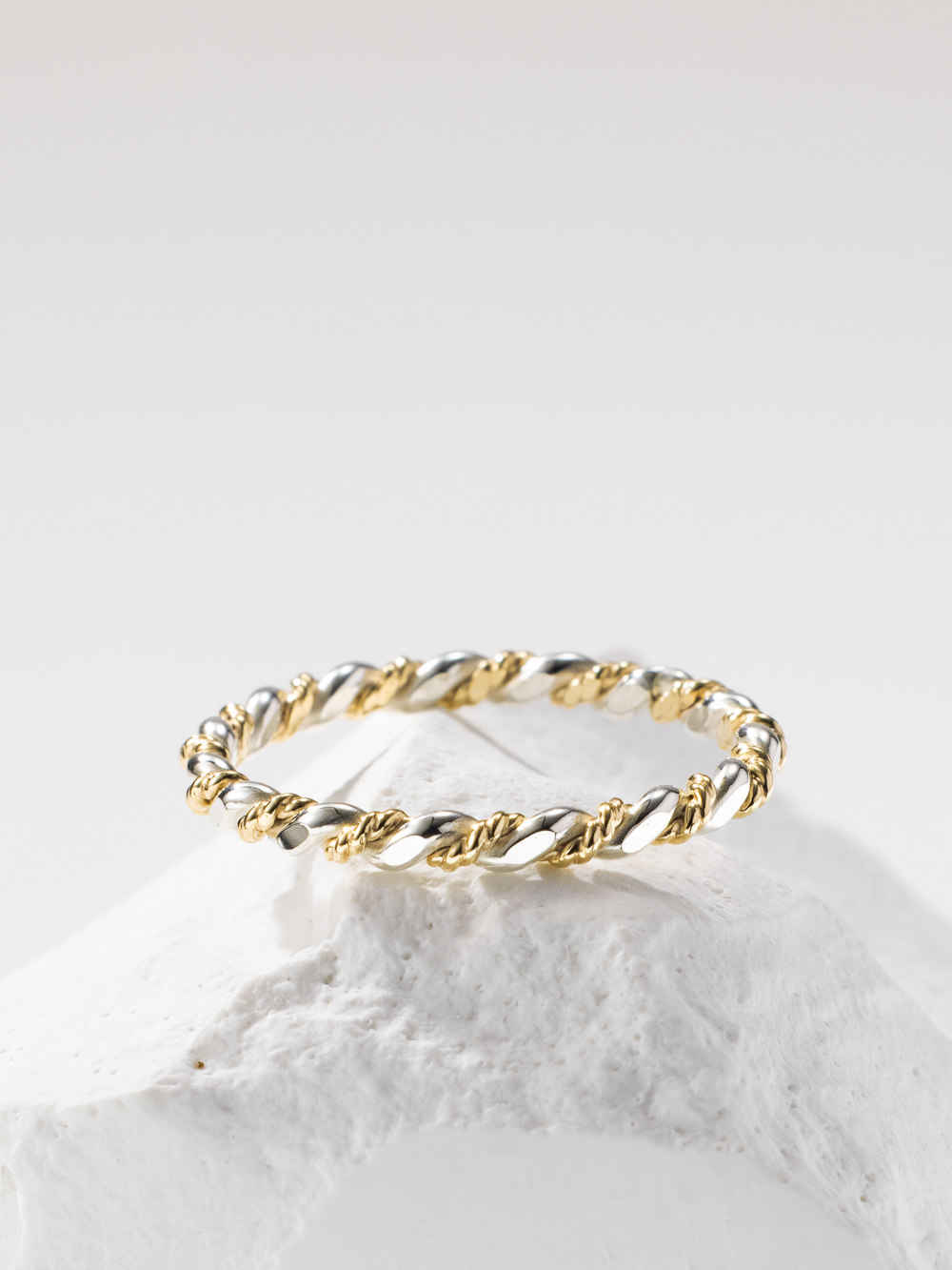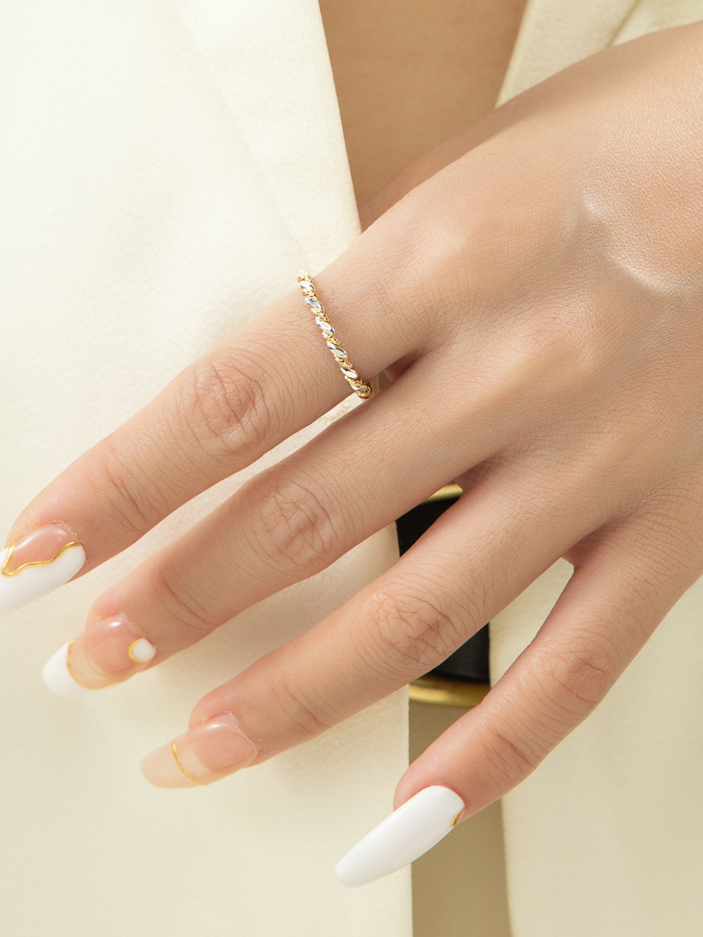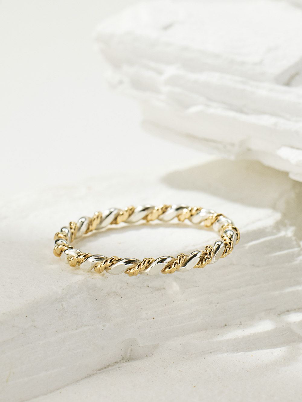 小众设计感满满的一款的金银结合的麻花戒指 别出新意的把纯银光面和包金扭纹的线材相结合 手工编织出麻花纹理后,纯银光面部分经过切割压光处理 使得整个戒指对比更加强烈,切面部分也非常闪亮抢眼 戴上戒指在指间转动瞬间都能看到bulingbuling的金属光泽 简直棒呆了,金银撞色设计感满满,时尚又精致 搭配度极高的一款戒指,上班通勤首选~单戴都很好看 跟店里其他金银撞色系列的戒指一起叠戴很有feel~ 姐妹们这款真的绝美,值得冲鸭~~