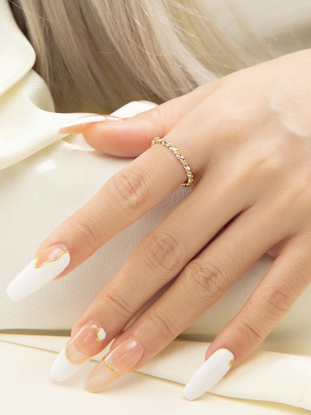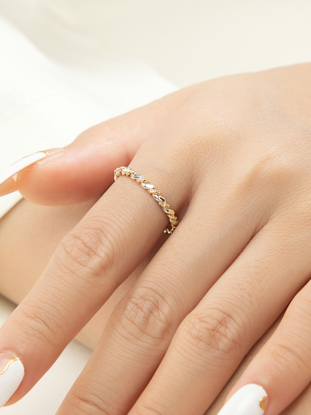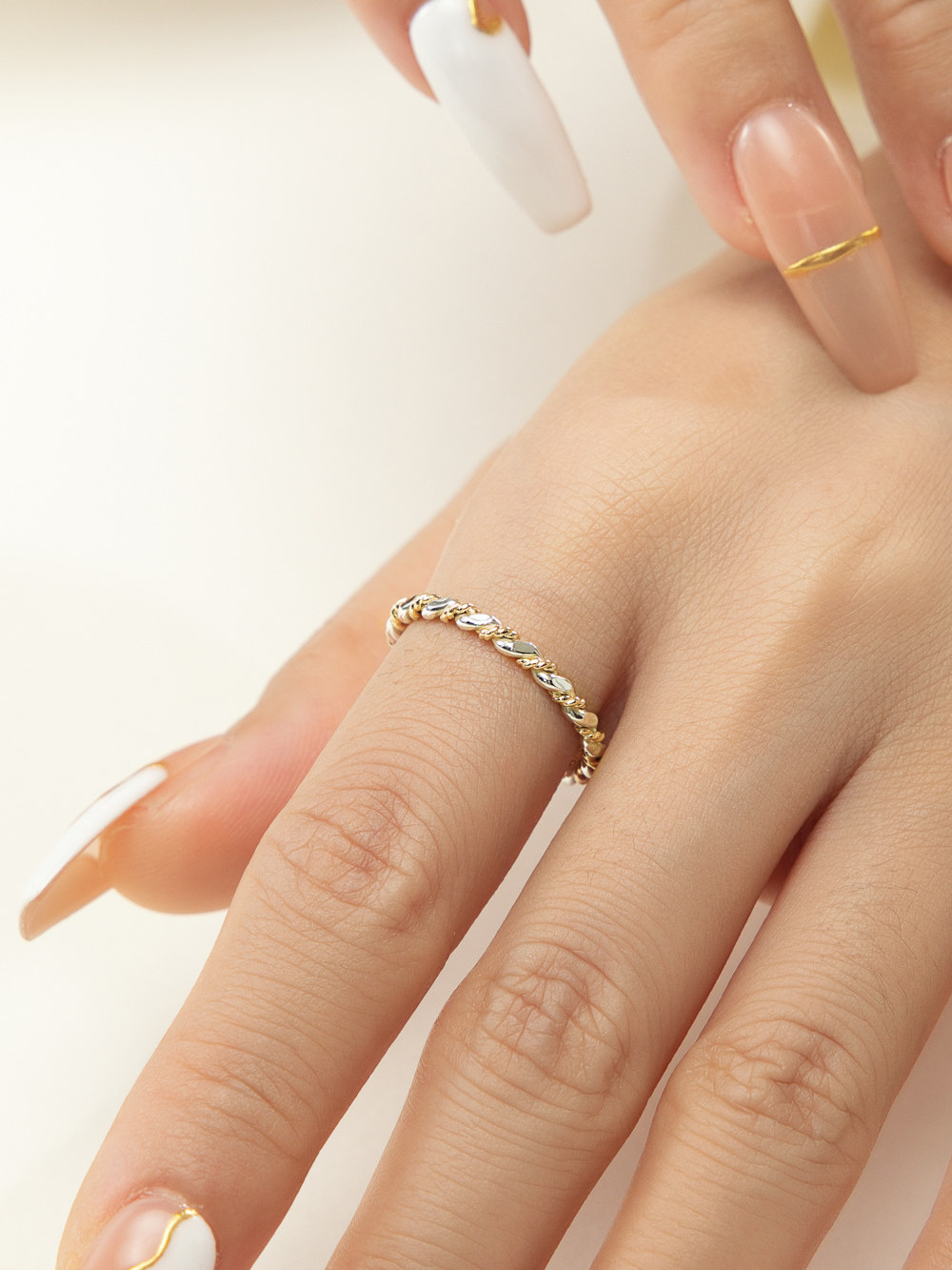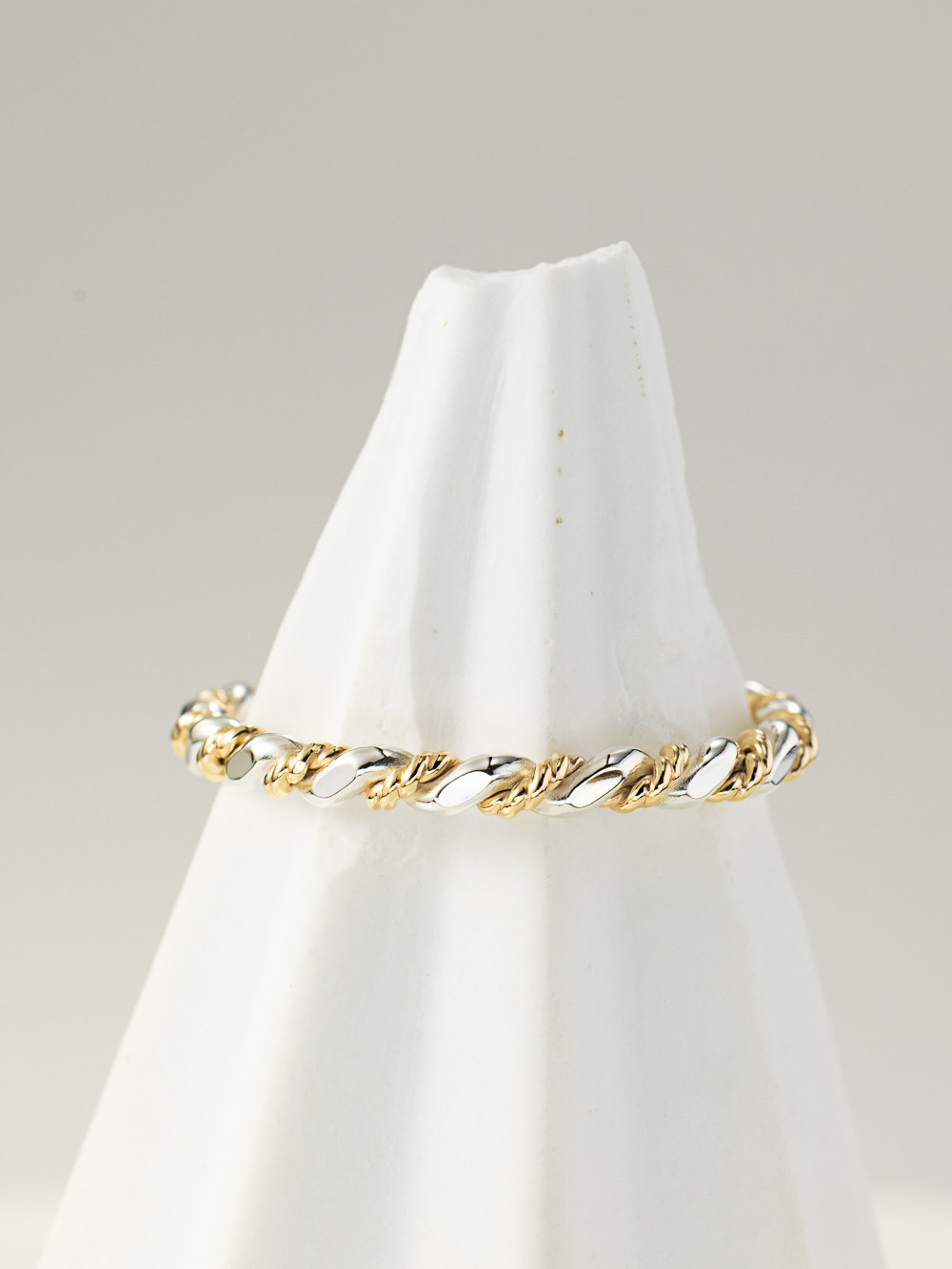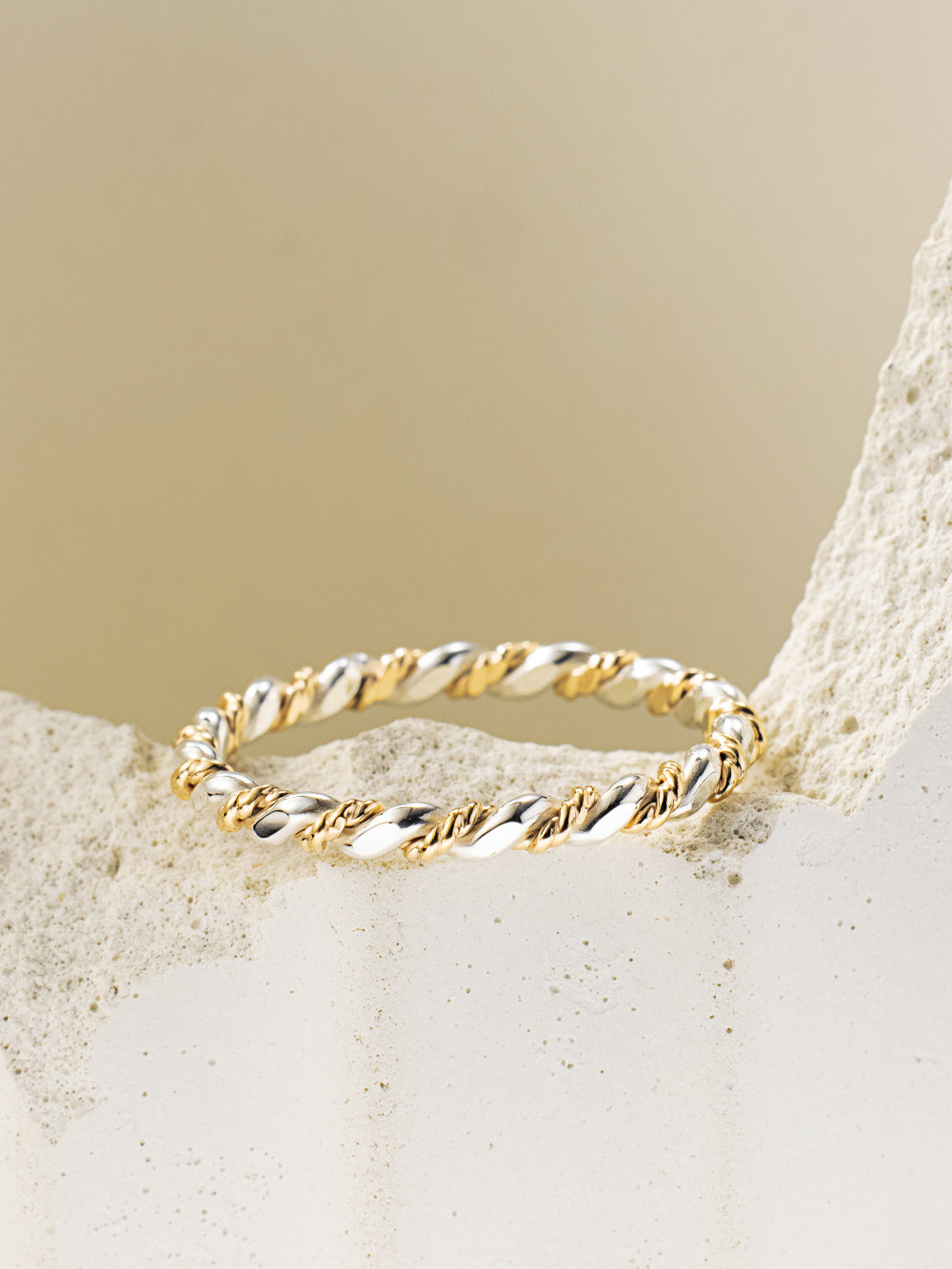 小众设计感满满的一款的金银结合的麻花戒指 别出新意的把纯银光面和包金扭纹的线材相结合 手工编织出麻花纹理后,纯银光面部分经过切割压光处理 使得整个戒指对比更加强烈,切面部分也非常闪亮抢眼 戴上戒指在指间转动瞬间都能看到bulingbuling的金属光泽 简直棒呆了,金银撞色设计感满满,时尚又精致 搭配度极高的一款戒指,上班通勤首选~单戴都很好看 跟店里其他金银撞色系列的戒指一起叠戴很有feel~ 姐妹们这款真的绝美,值得冲鸭~~