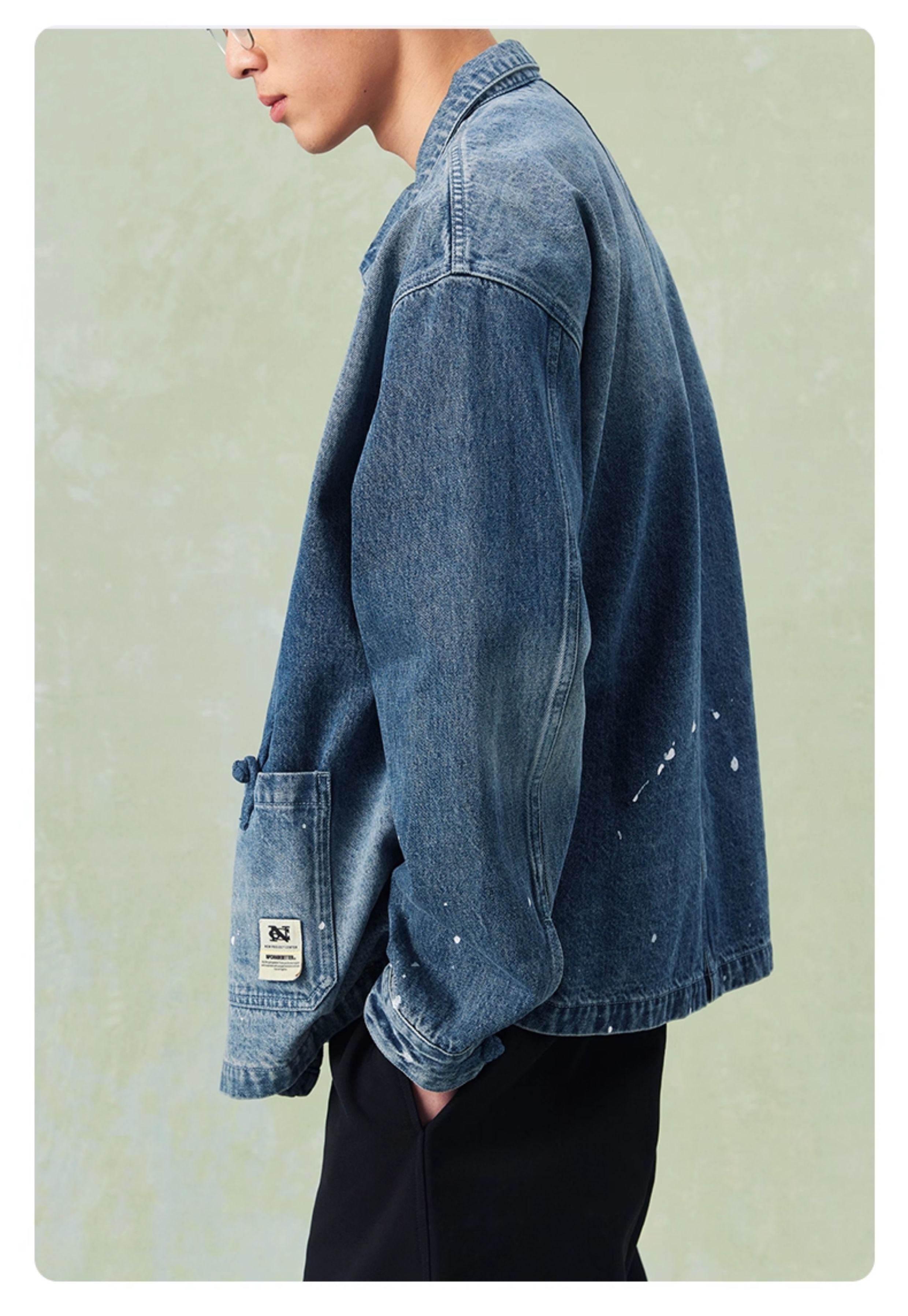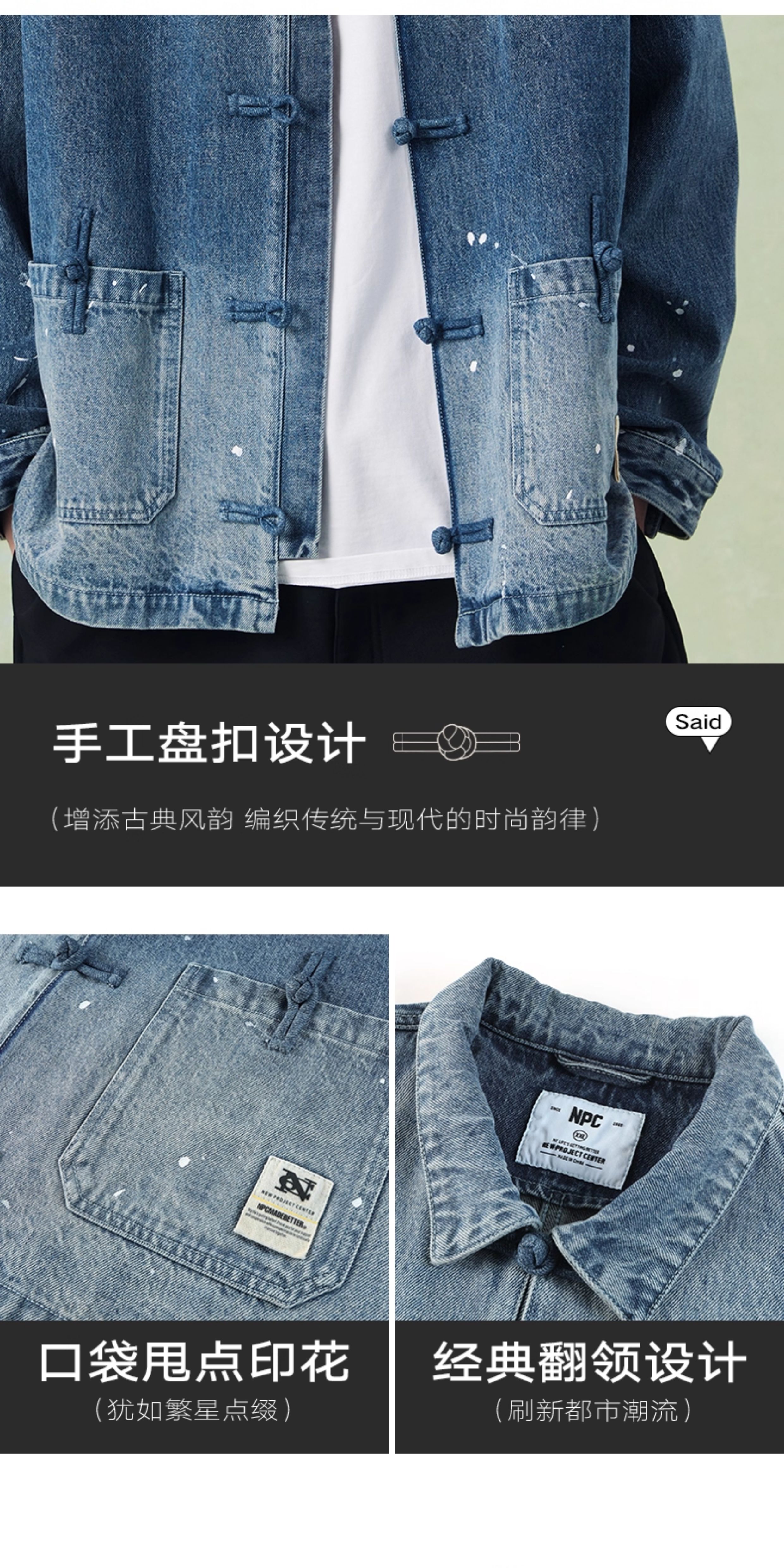 Npc Trendy Brand National Style Button Embroidery Splash Ink Denim Jacket for Men Loose Casual Trendy Np41Dc65