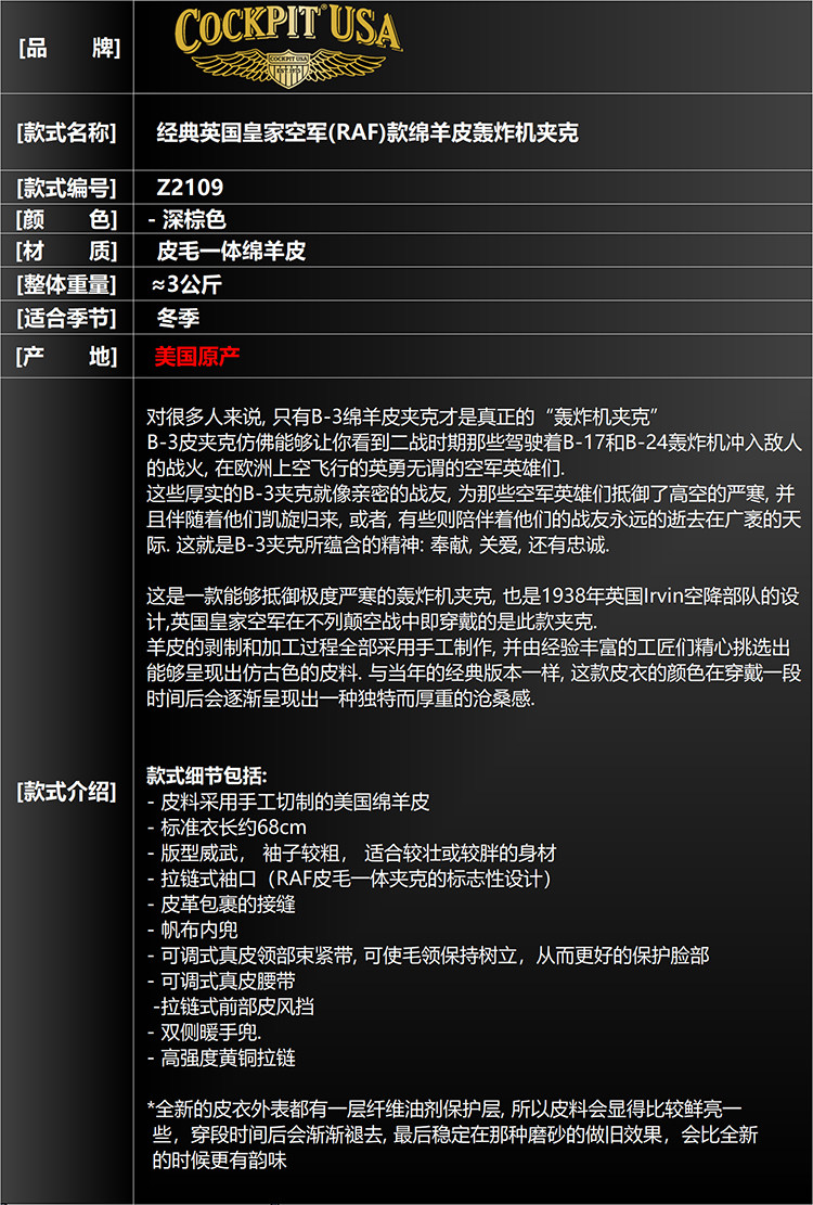 皇家空军款B3夹克与其他经典B3夹克的最大区别在于采用了拉链式袖口.这样的设计是为了