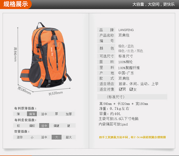 New Lightweight Outdoor Mountaineering Bag 40L Water-Repellent Nylon Backpack Men's and Women's Hiking Backpack Cycling Bag
