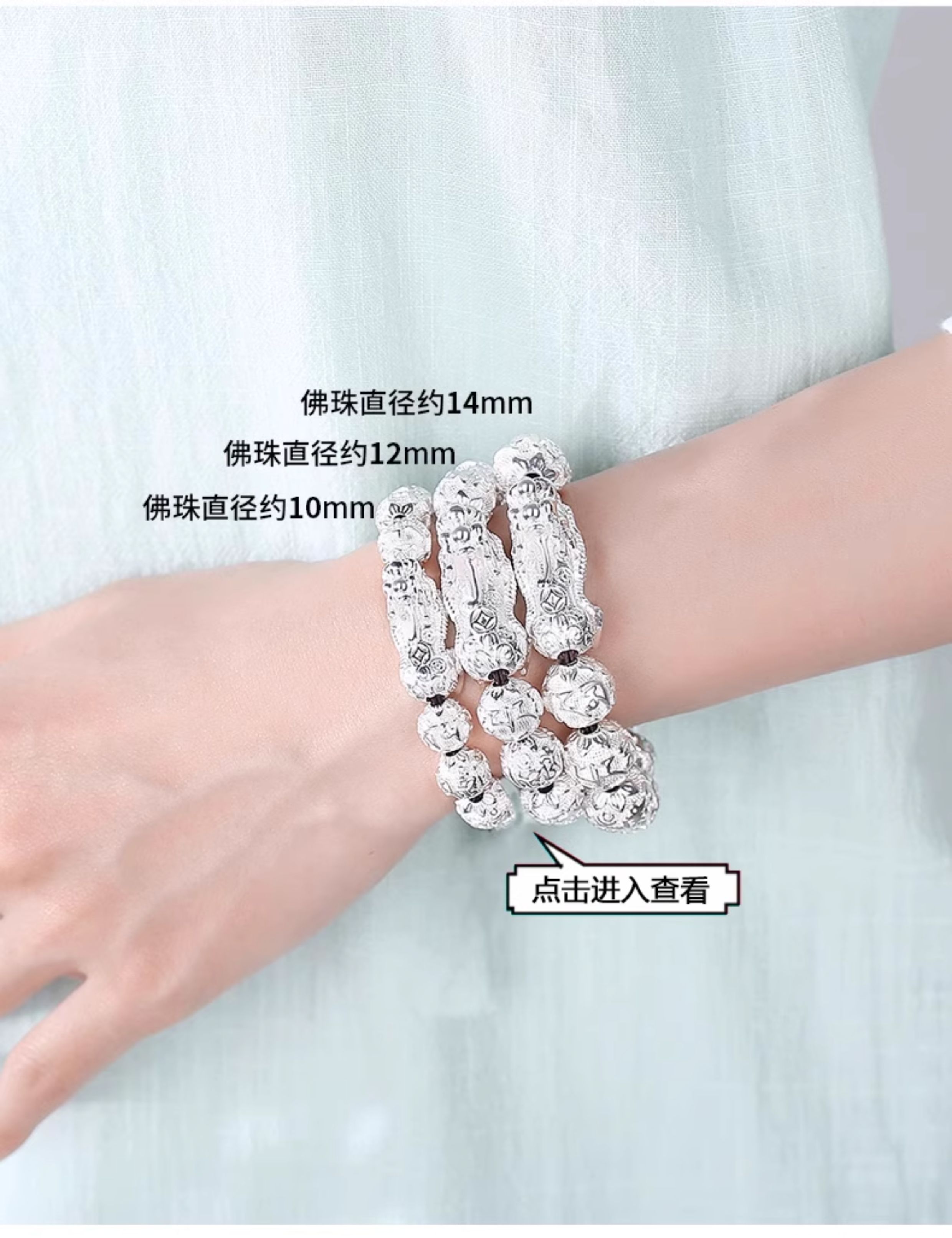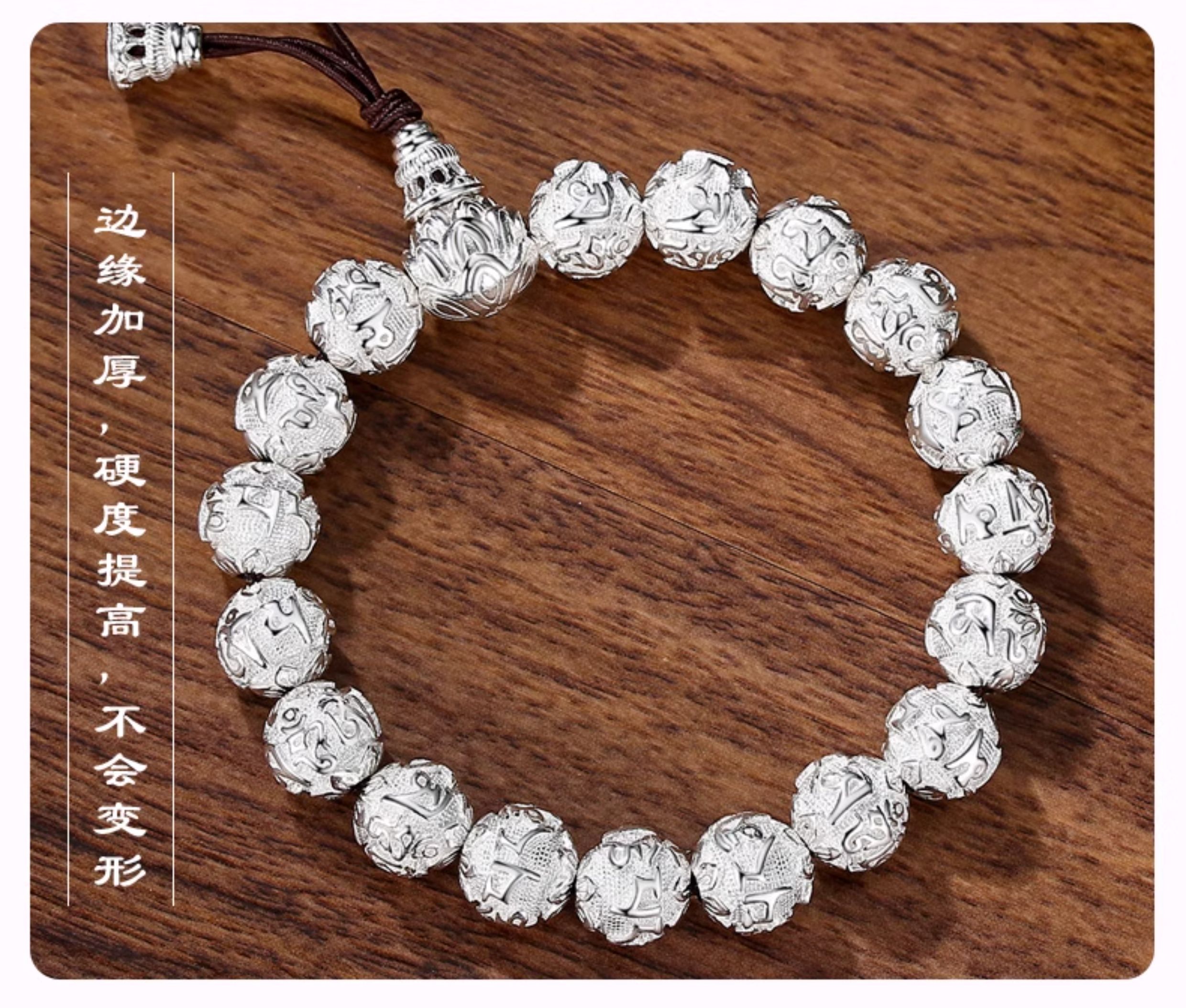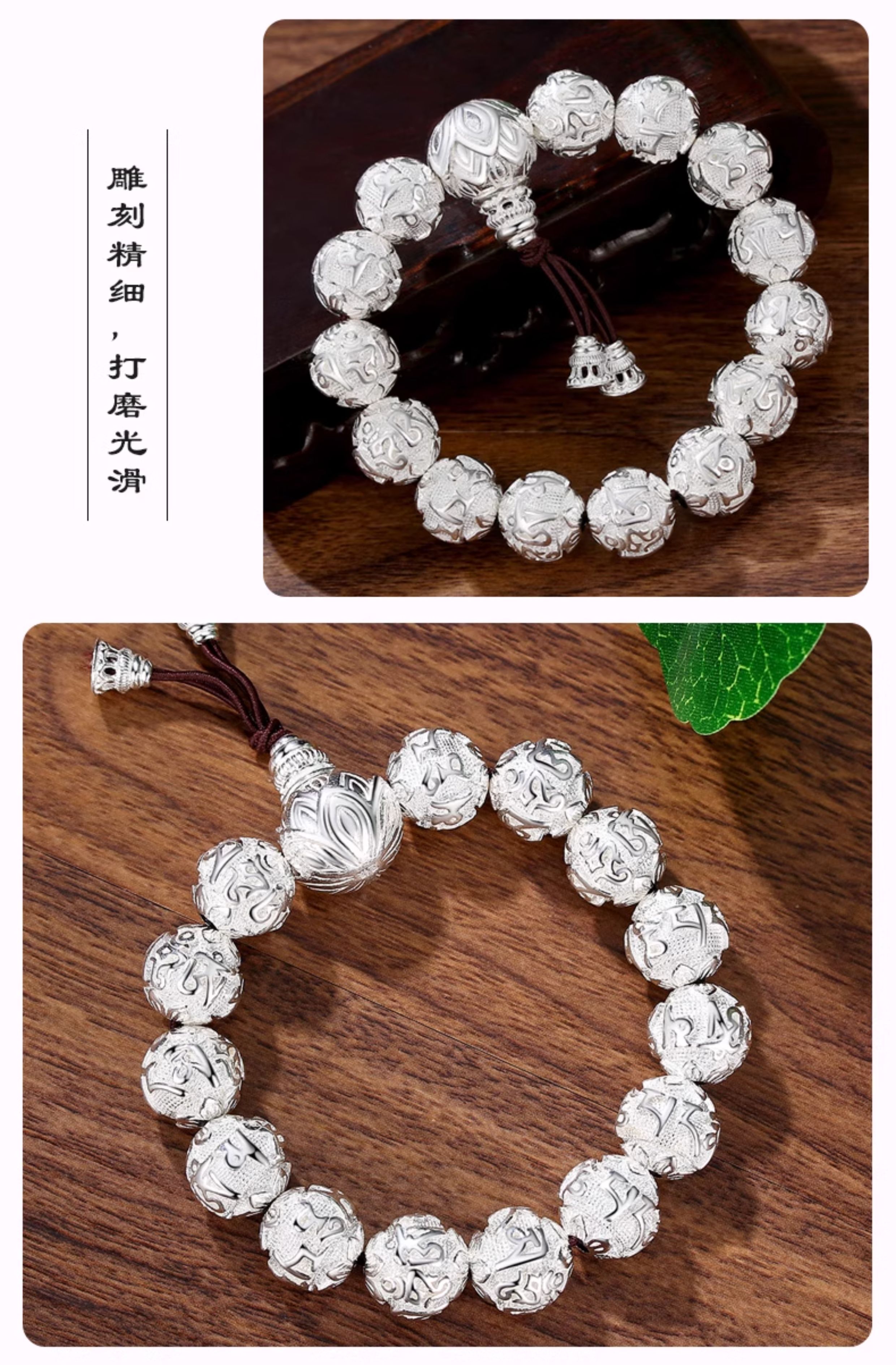 Yuweng Pure Silver Beaded Bracelet Buddhist Prayer Beads for Men, Powerful Six-Character Mantra, Fortune-Attracting Bracelet, Trendy Men's Pure Silver Women's Bracelet Gift