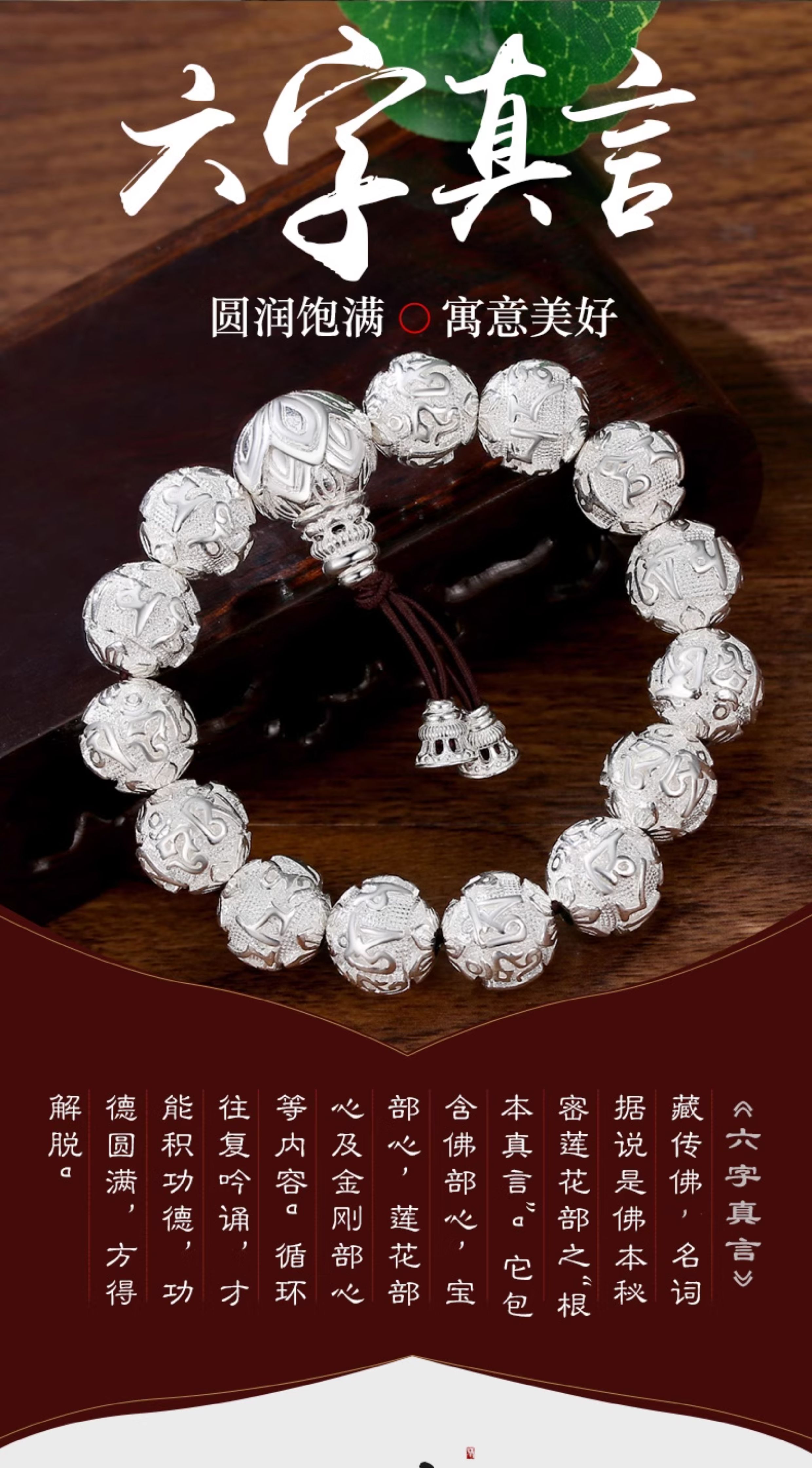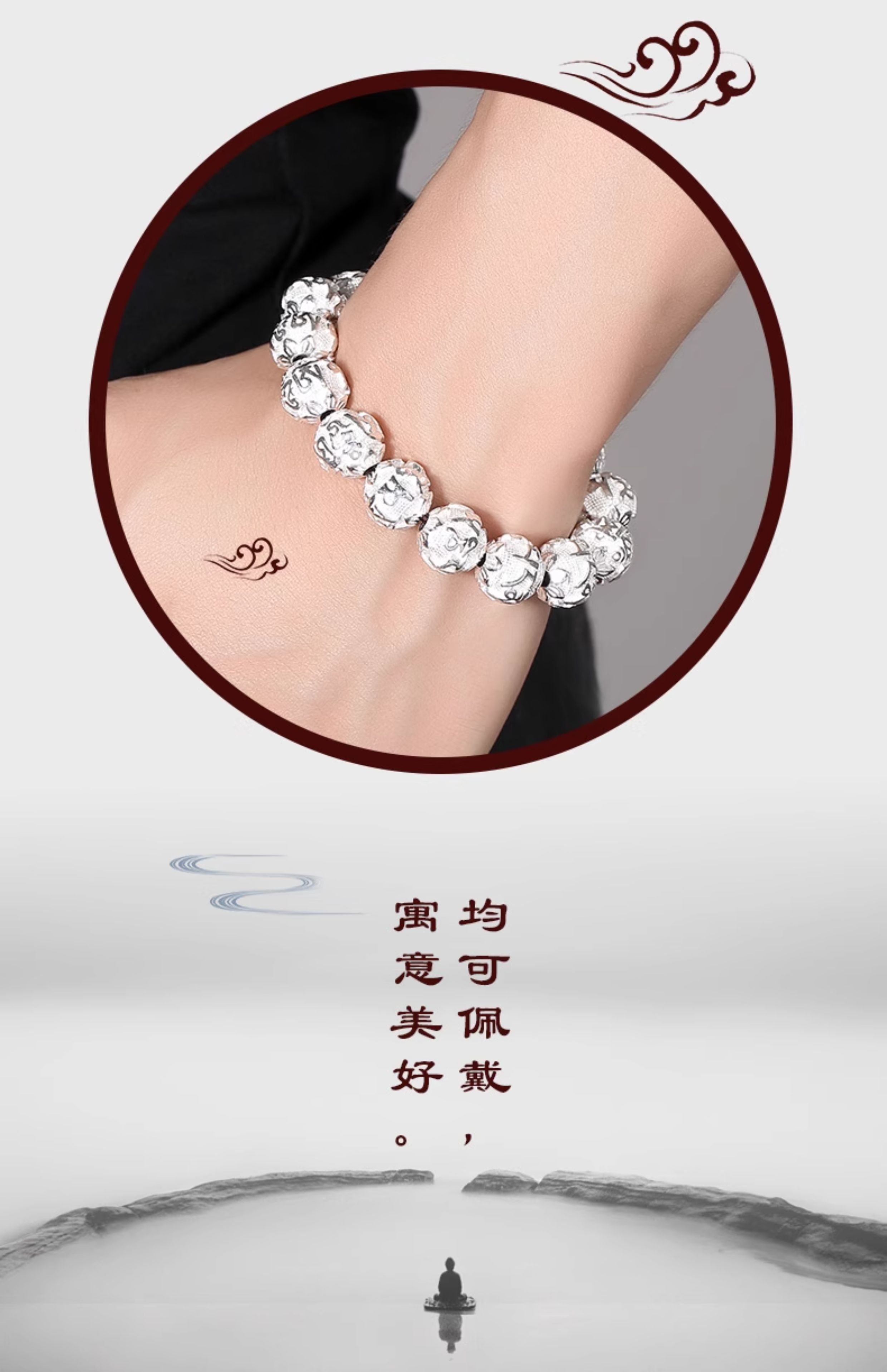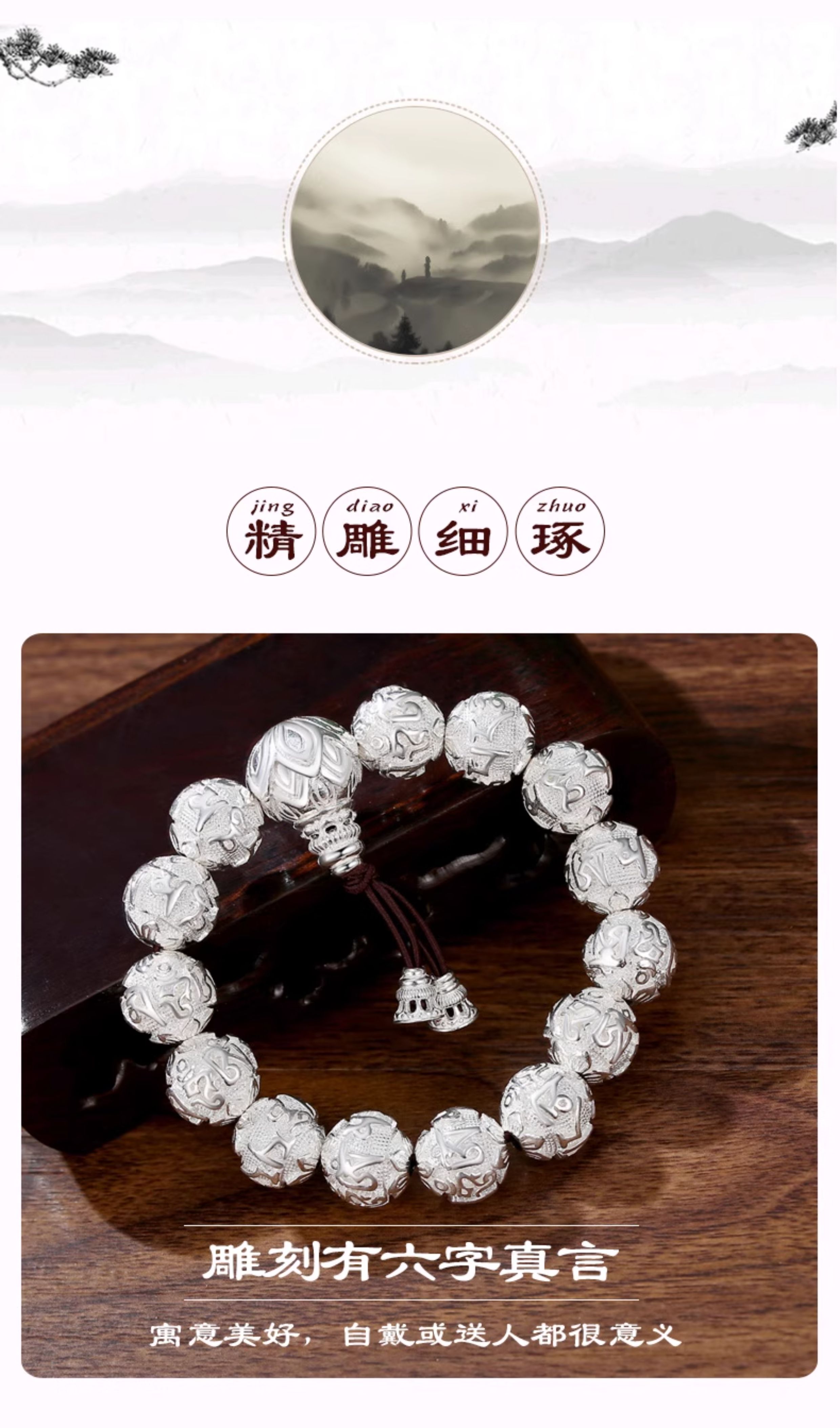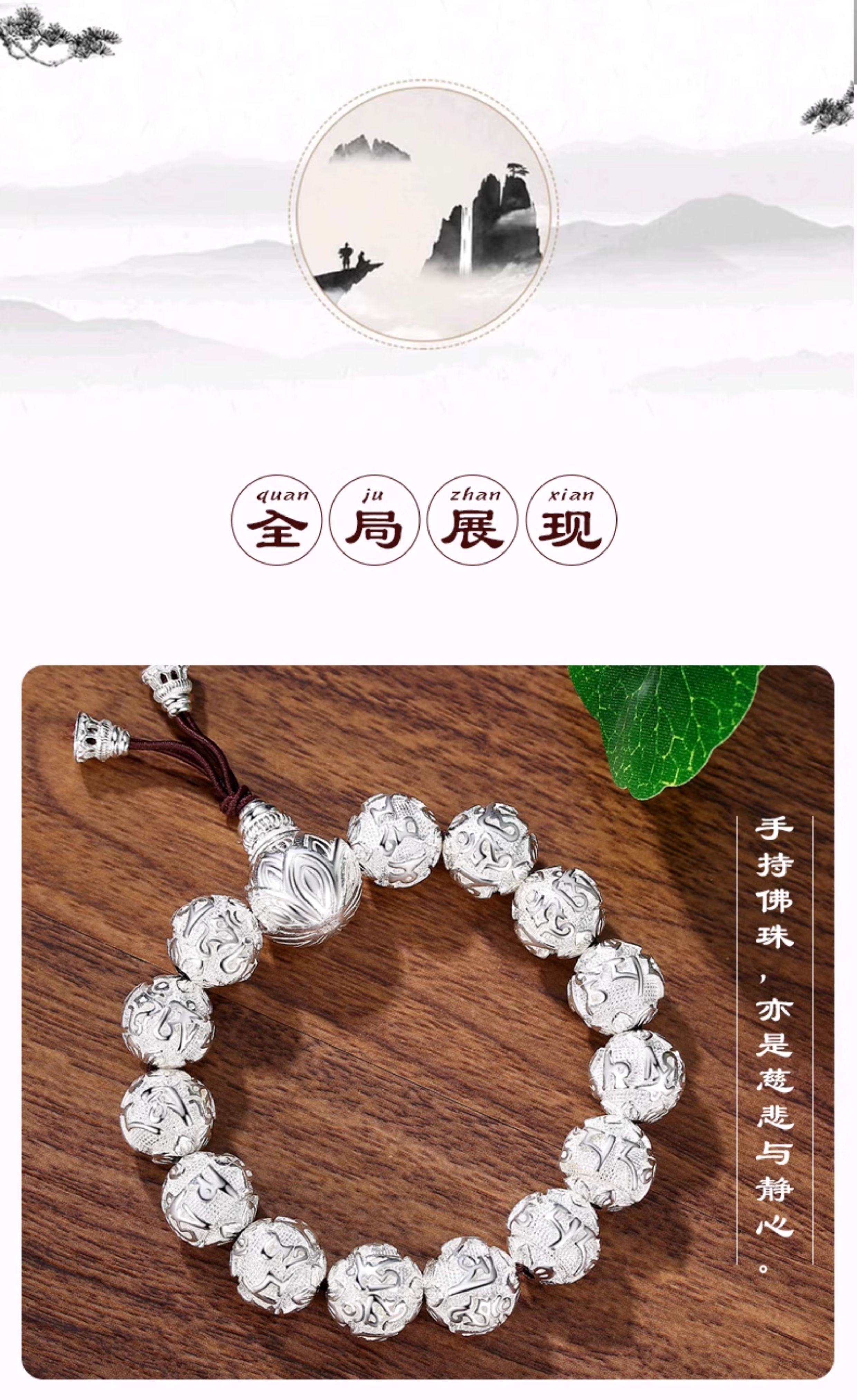Yuweng Pure Silver Beaded Bracelet Buddhist Prayer Beads for Men, Powerful Six-Character Mantra, Fortune-Attracting Bracelet, Trendy Men's Pure Silver Women's Bracelet Gift