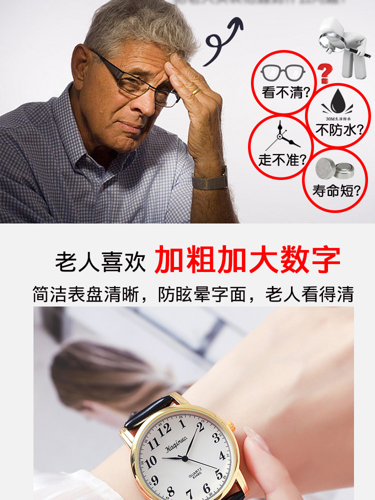 Elderly Men's Watch, Middle-Aged Women's Waterproof Watch, Parents' Watch, Large Number Scale, Leather Strap, Middle-Aged and Elderly Electronic Quartz Watch