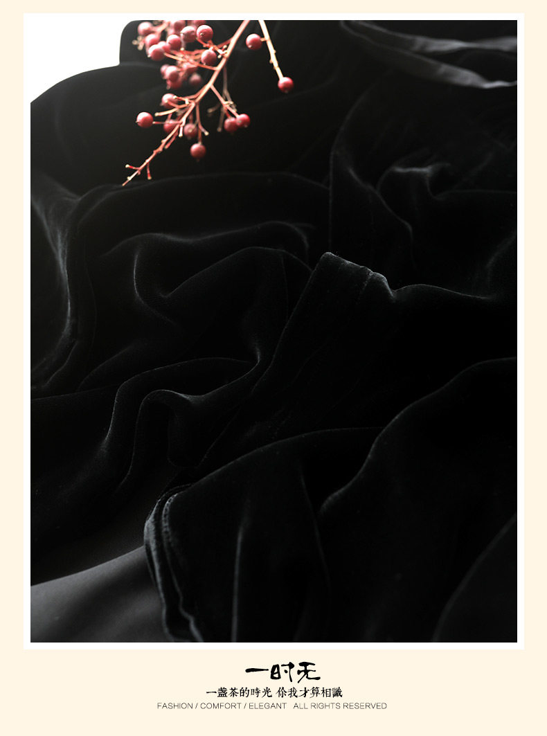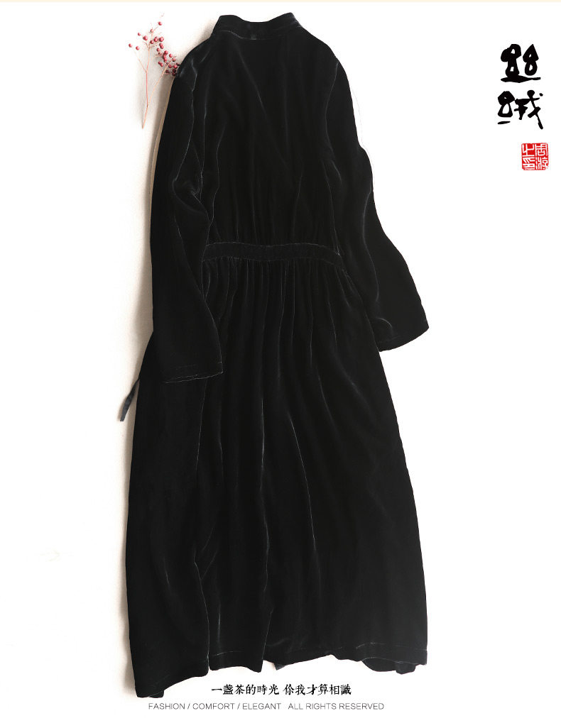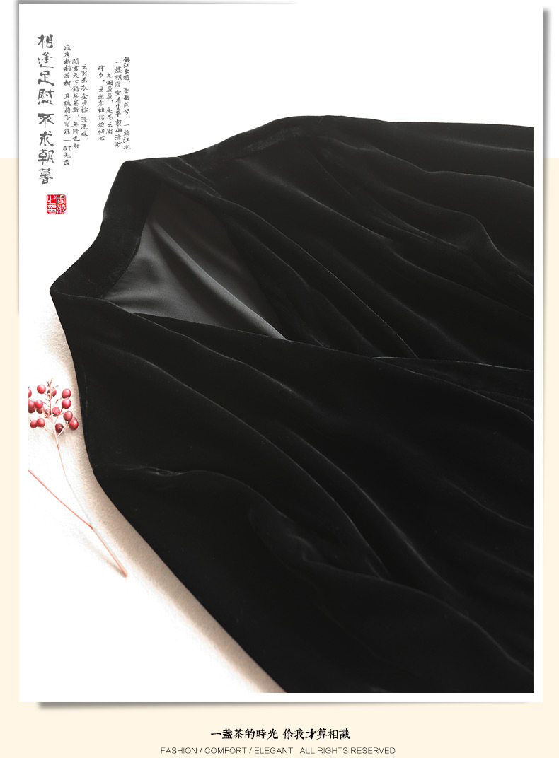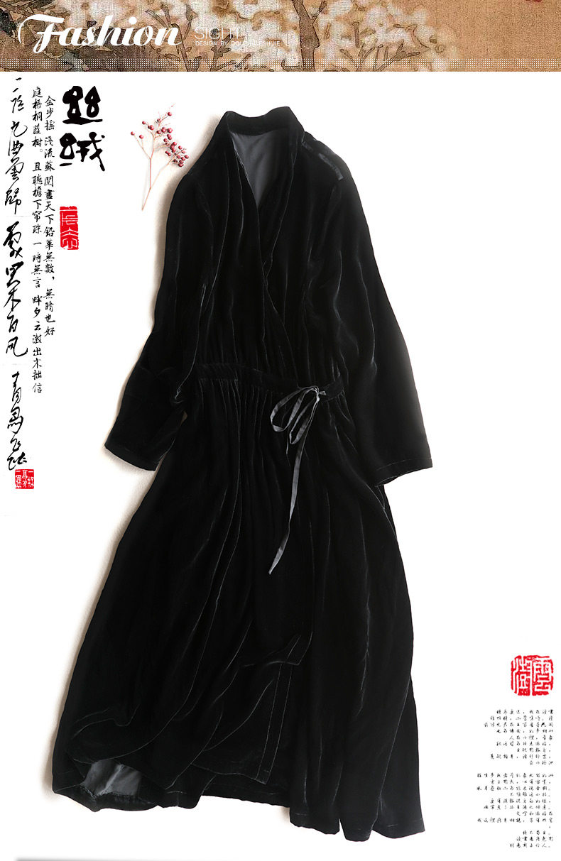 Yunshu Original 2026 Spring Silk Velvet Black Long-Sleeved Lace-Up Dress V Neck Large Size Long A-Line Skirt