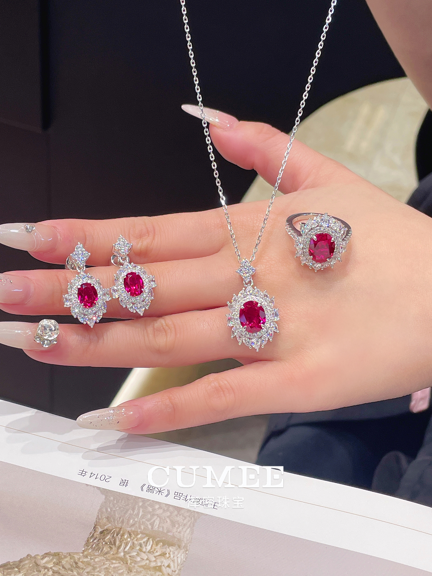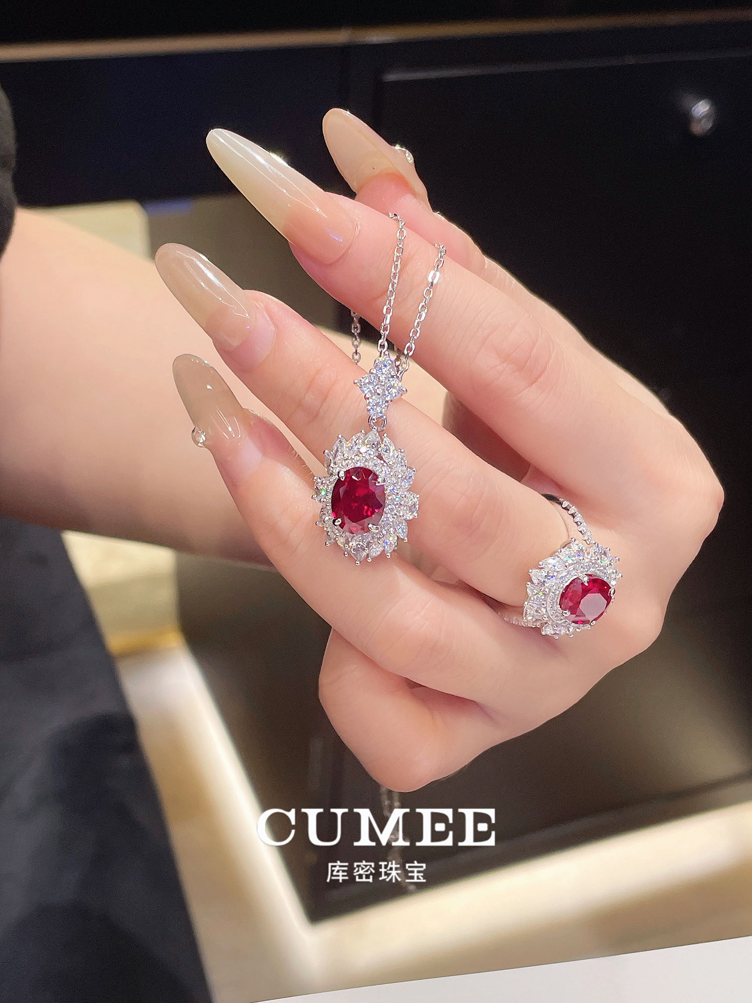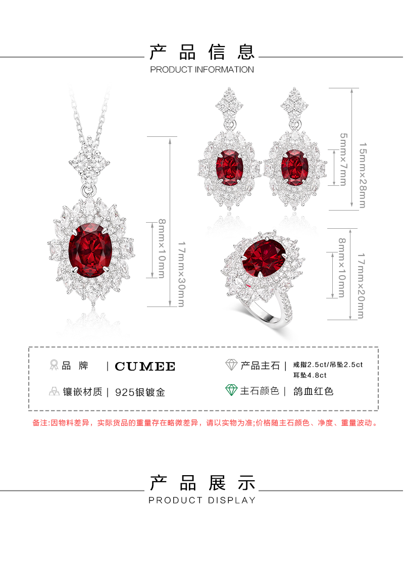 Cumee Classic Versatile Pigeon Blood Red Cultured Ruby Women's Ring and Pendant Set. Silver Gold-Plated