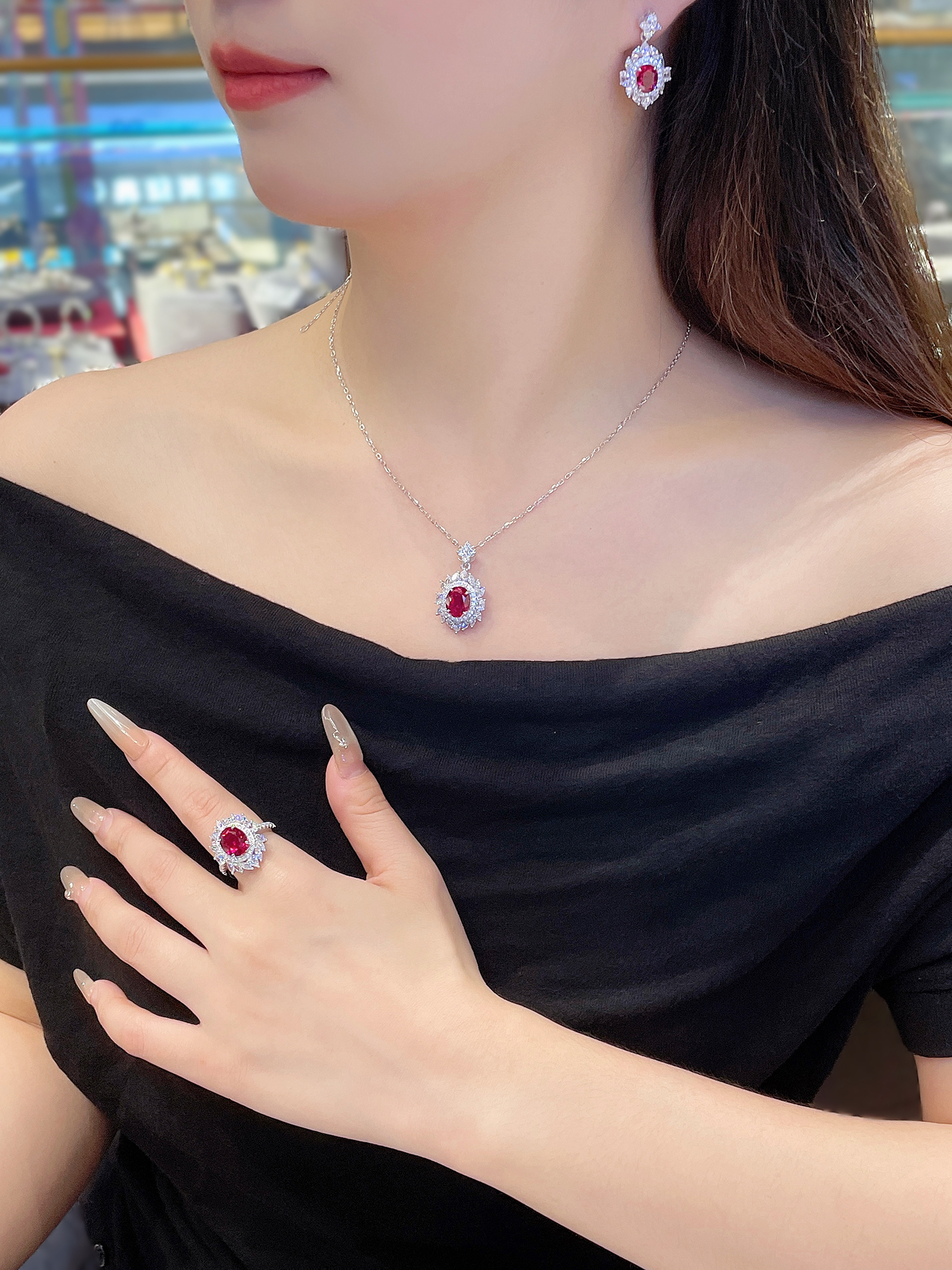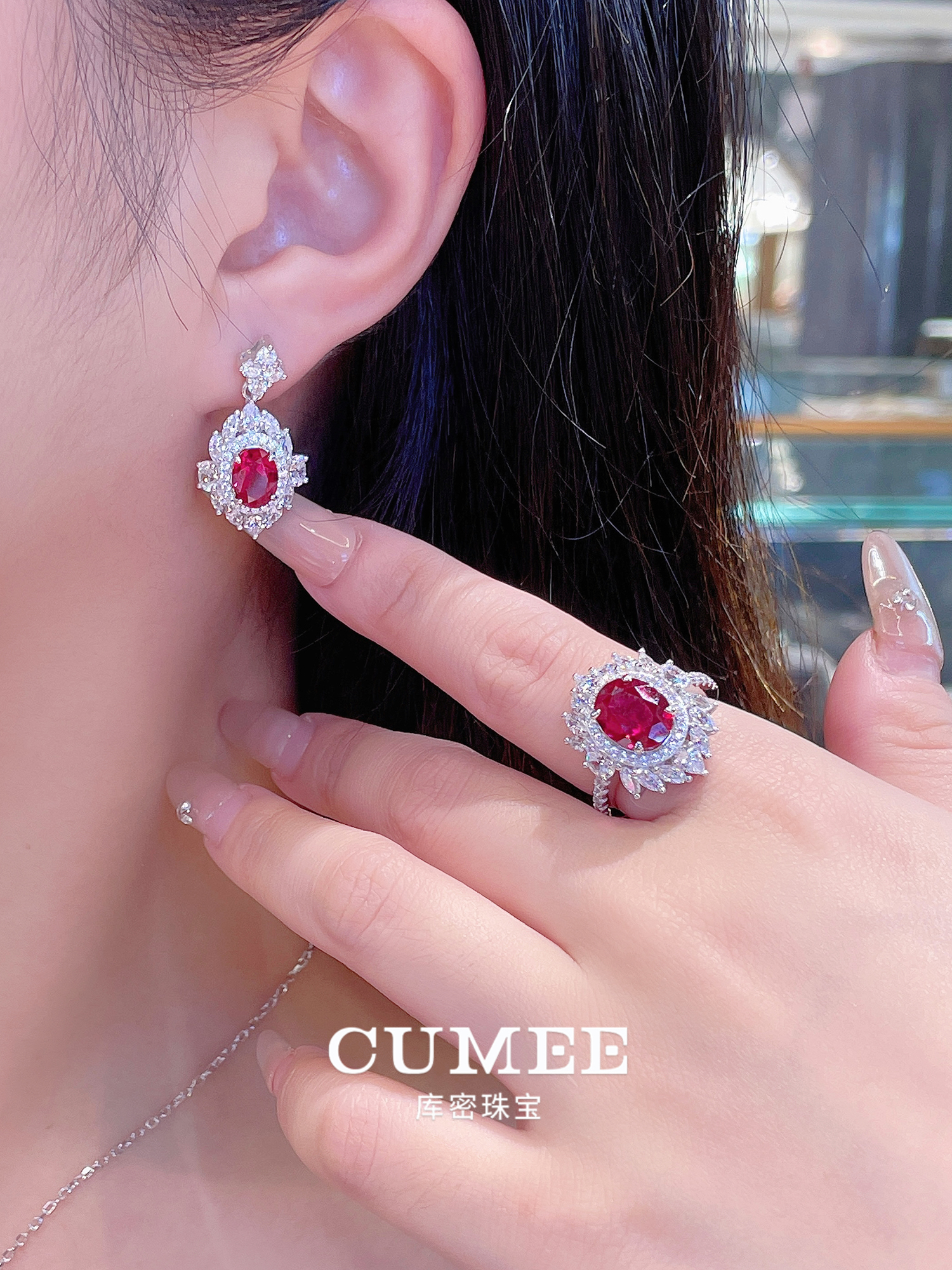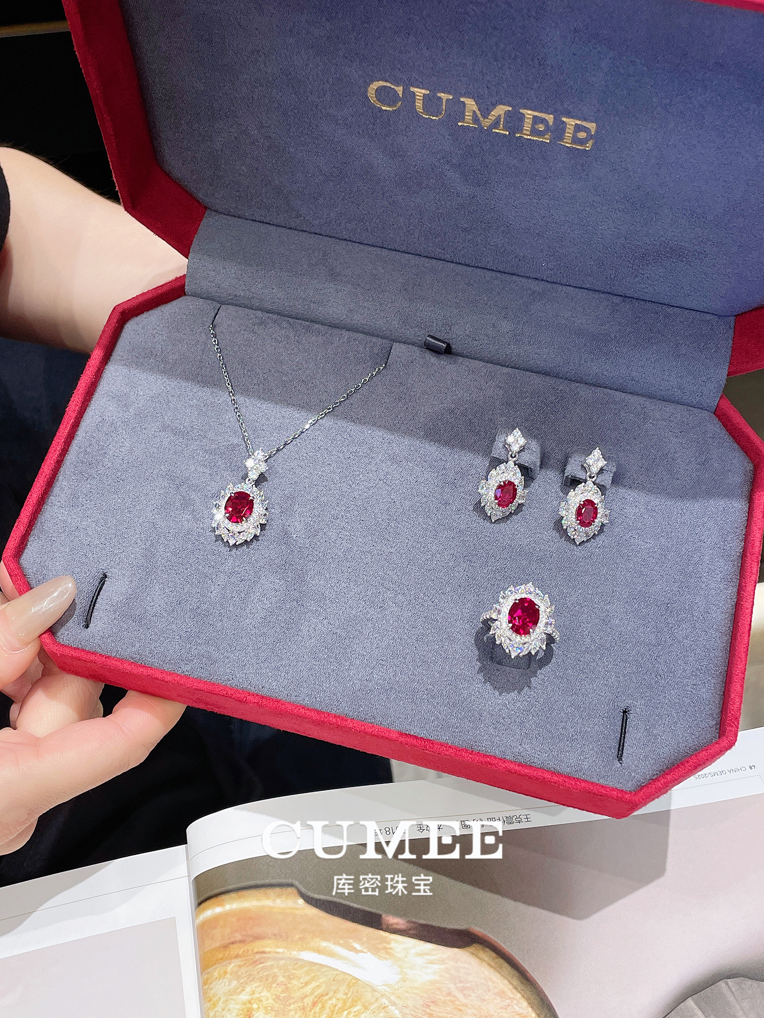 Cumee Classic Versatile Pigeon Blood Red Cultured Ruby Women's Ring and Pendant Set. Silver Gold-Plated