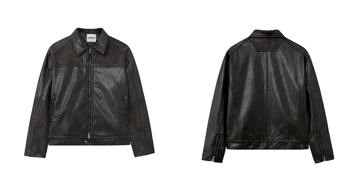 Limpidoculus Washed and Distressed Handmade Color-Blocked Shoulder-Padded Washed and Distressed Short Boxy Leather Jacket