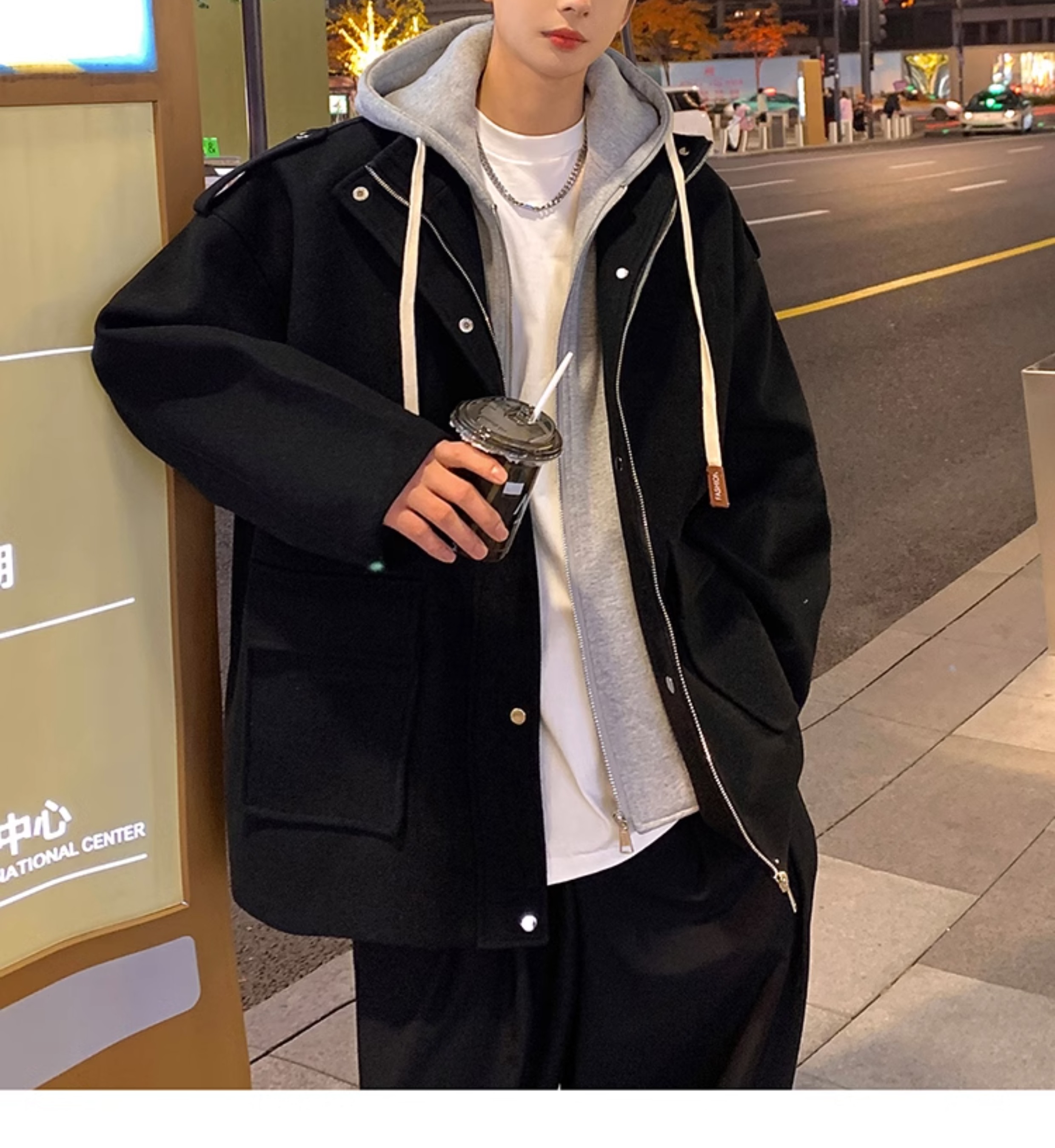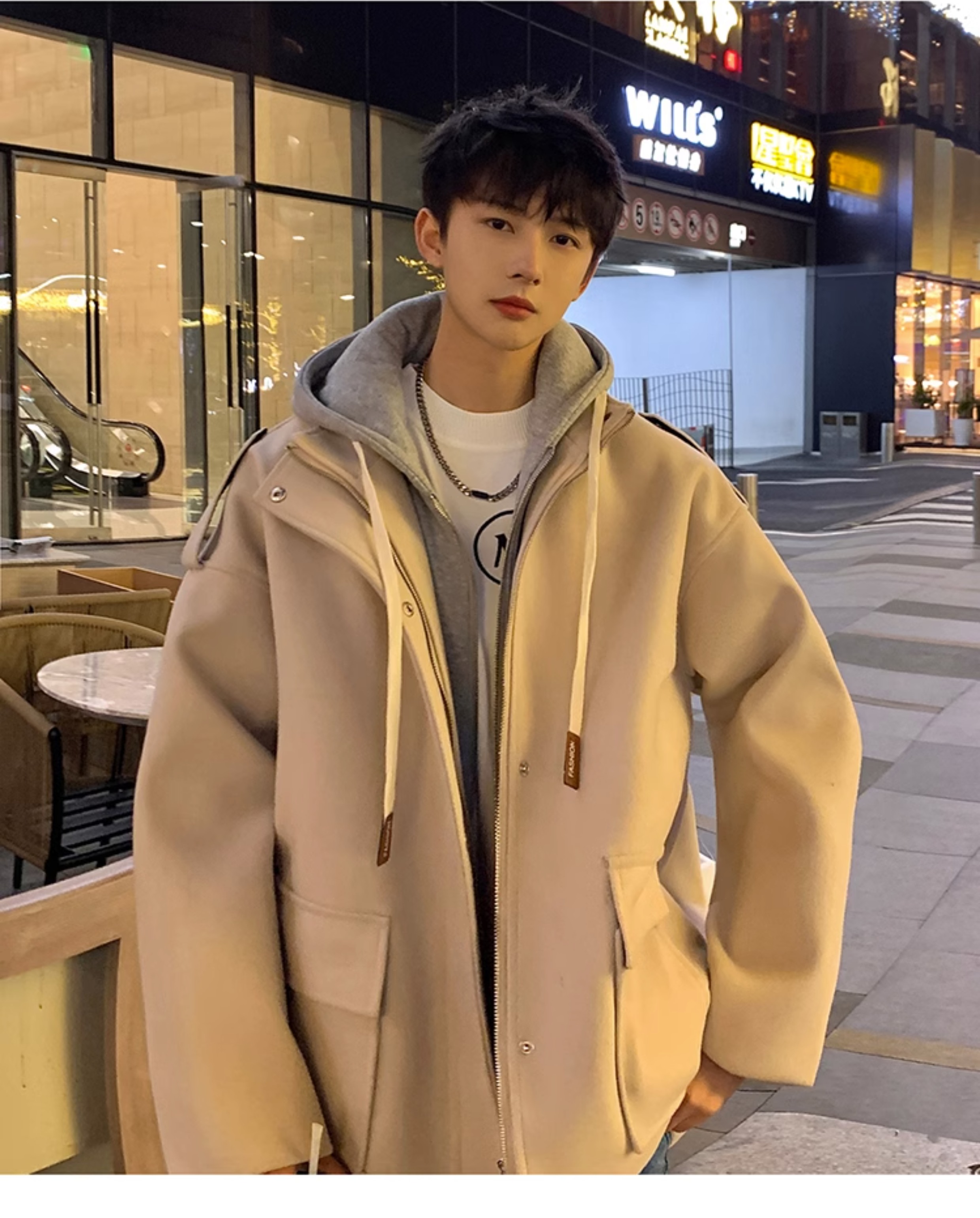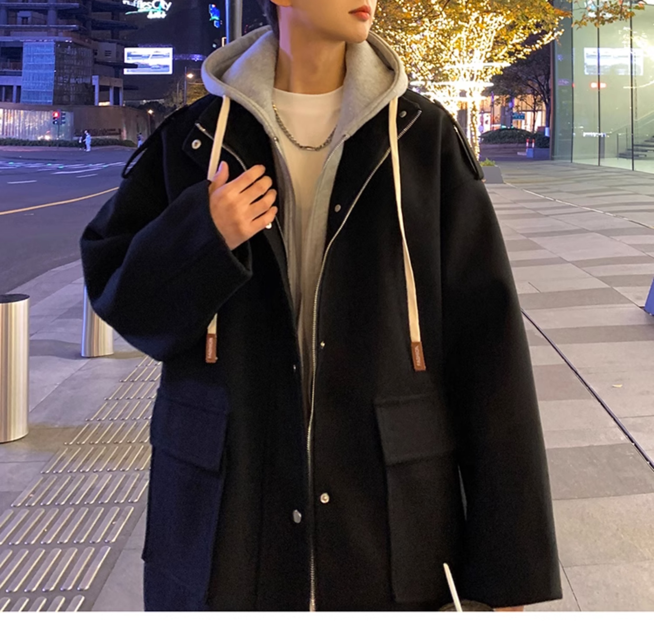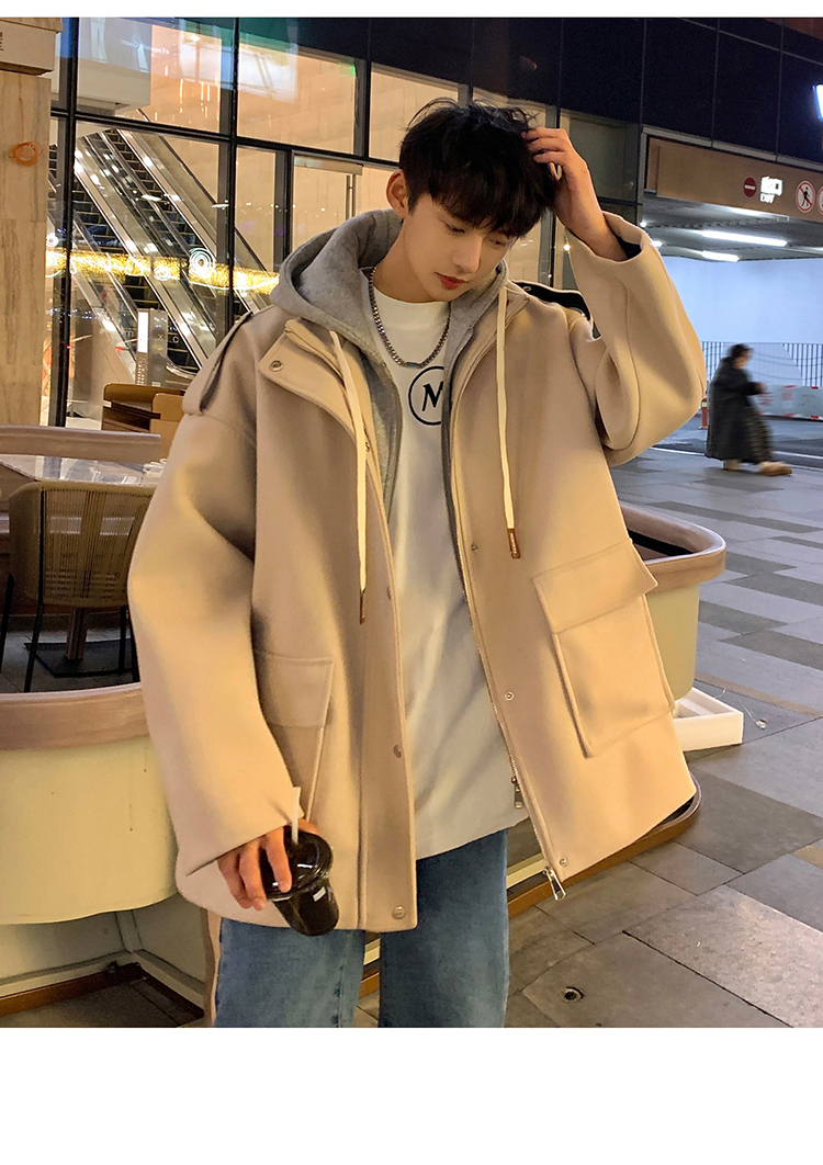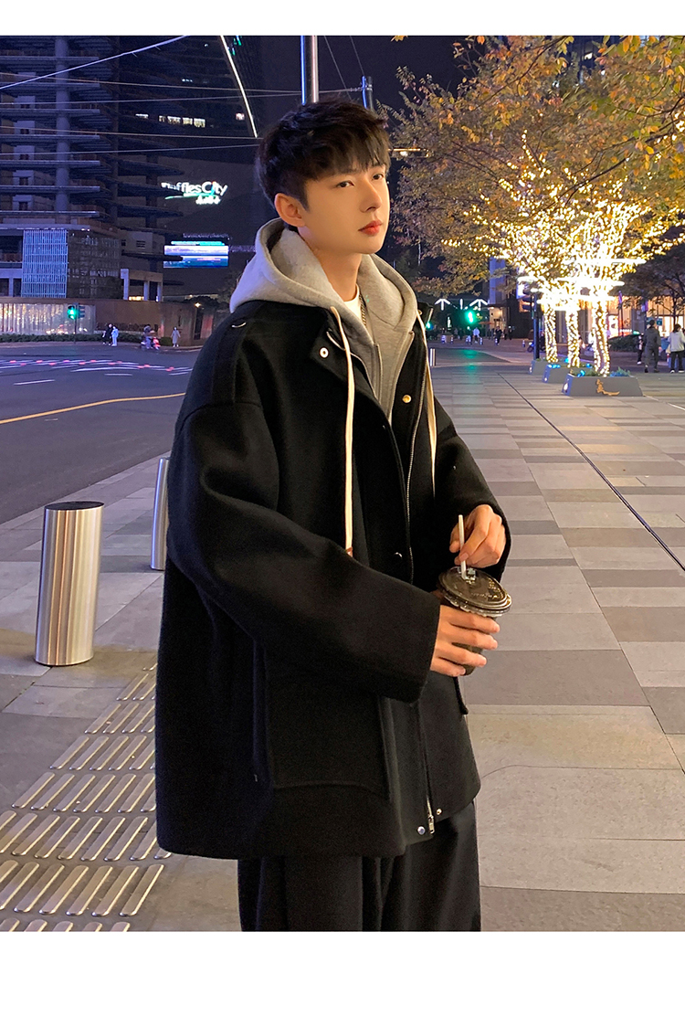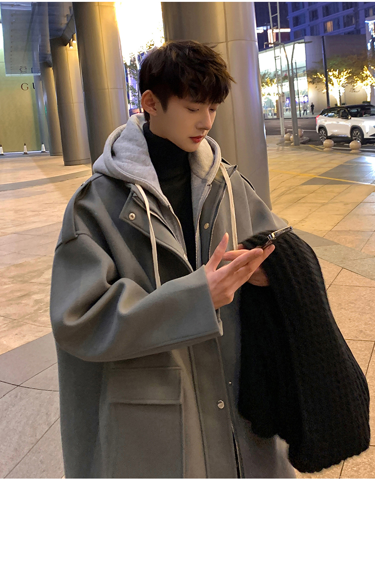 Wassup Happy Fake Two-Piece Woolen Coat for Men, Autumn and Winter, High-End, Loose, Casual, Hooded Windbreaker Jacket