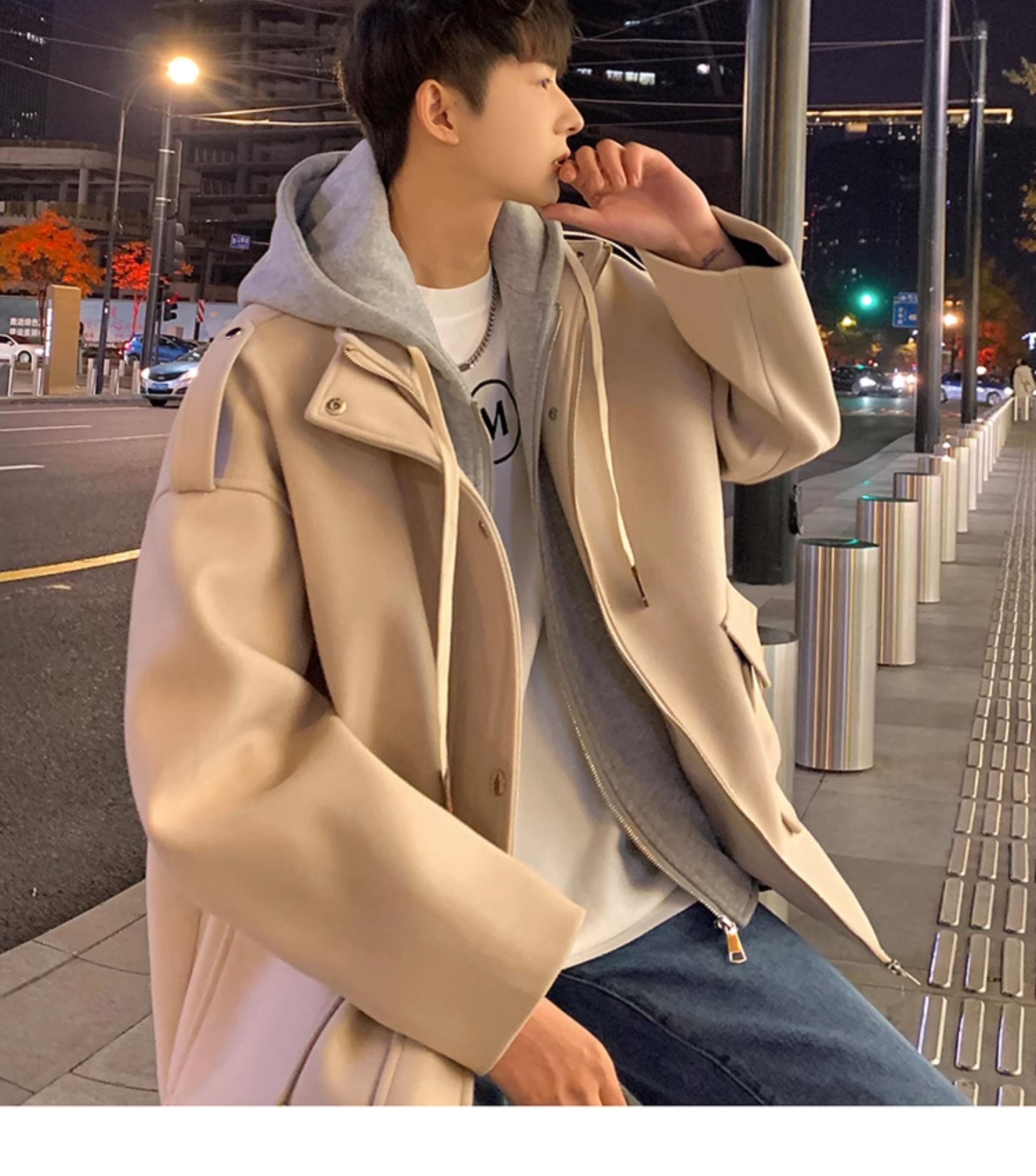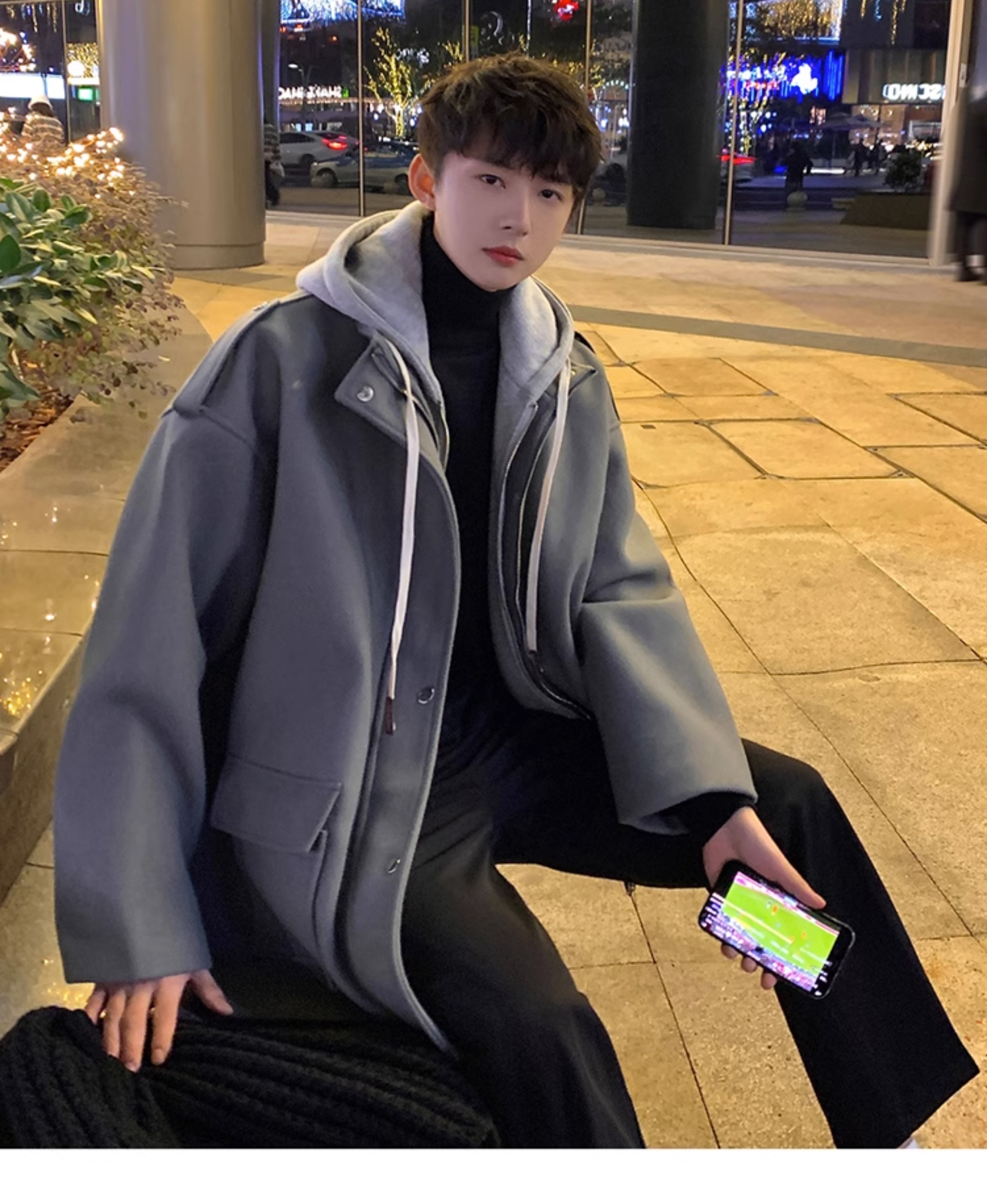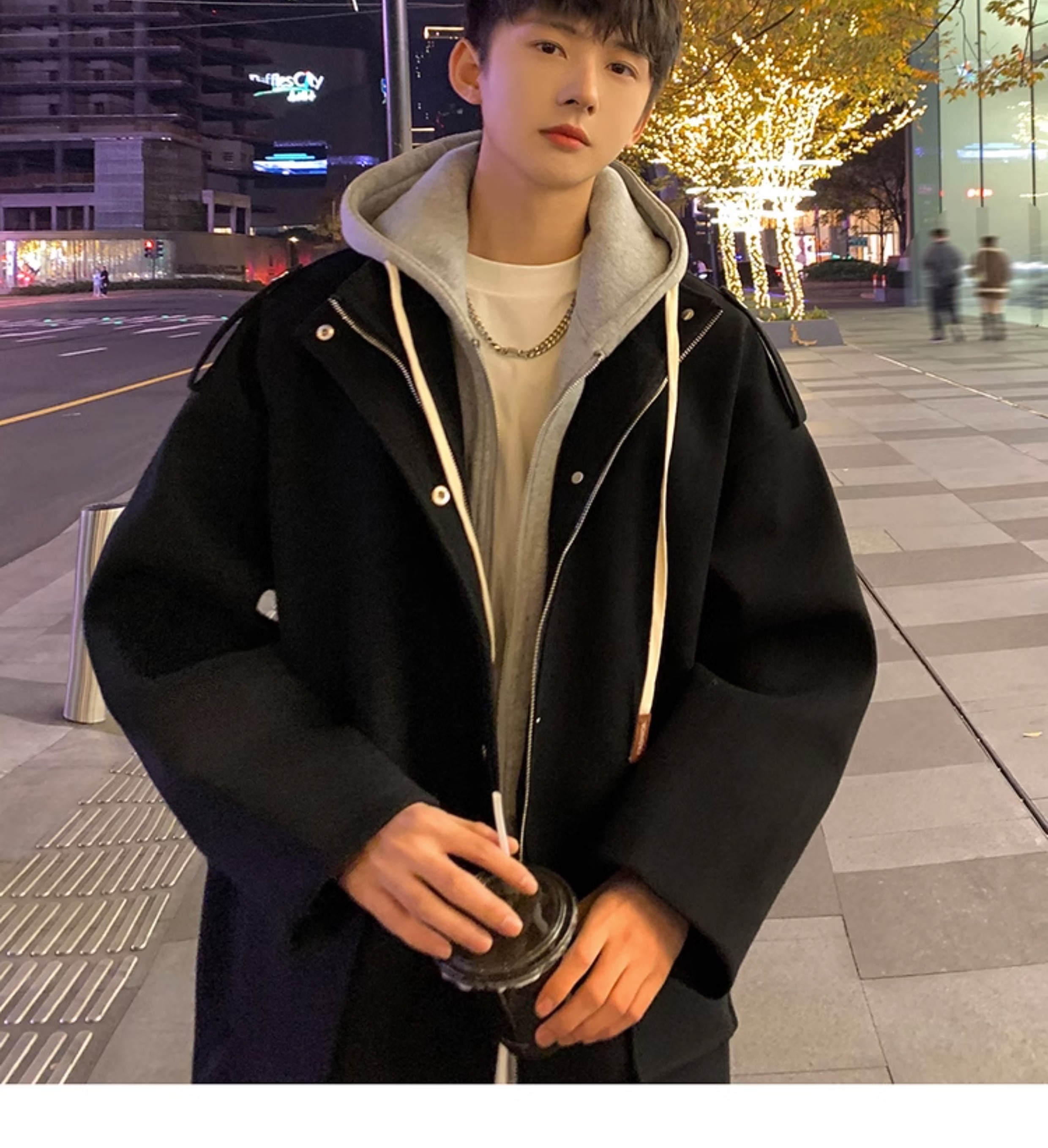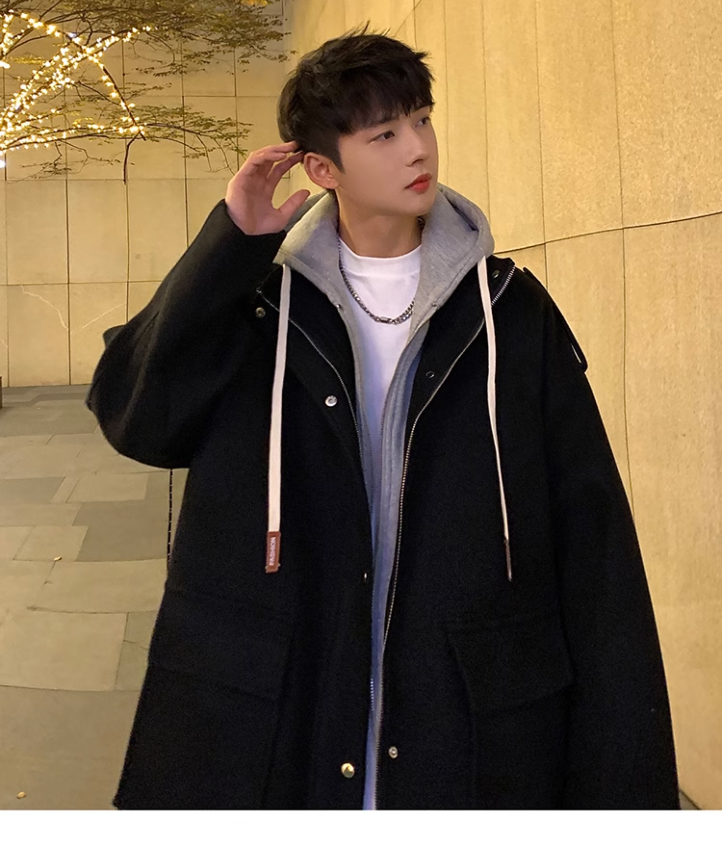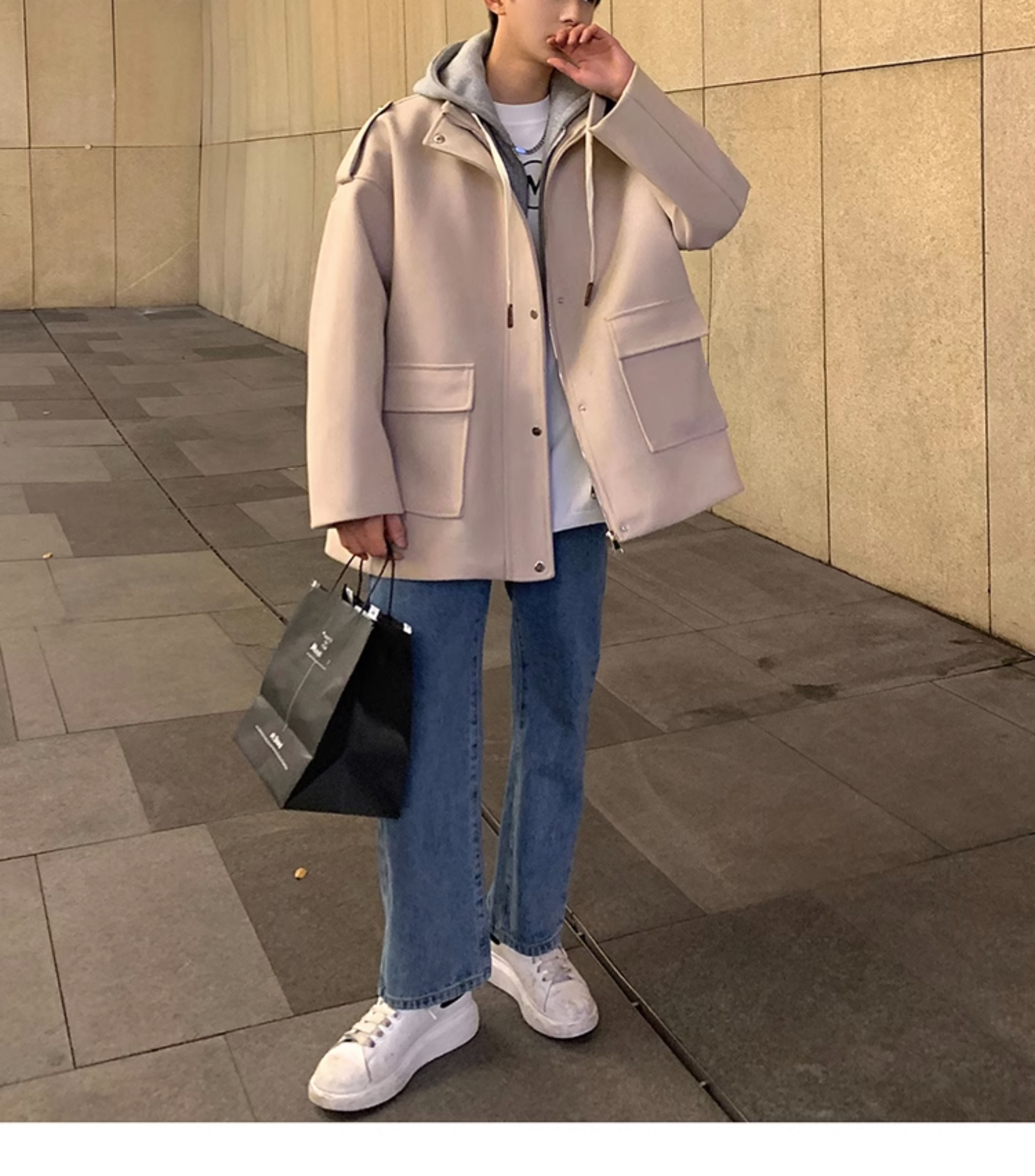 Wassup Happy Fake Two-Piece Woolen Coat for Men, Autumn and Winter, High-End, Loose, Casual, Hooded Windbreaker Jacket