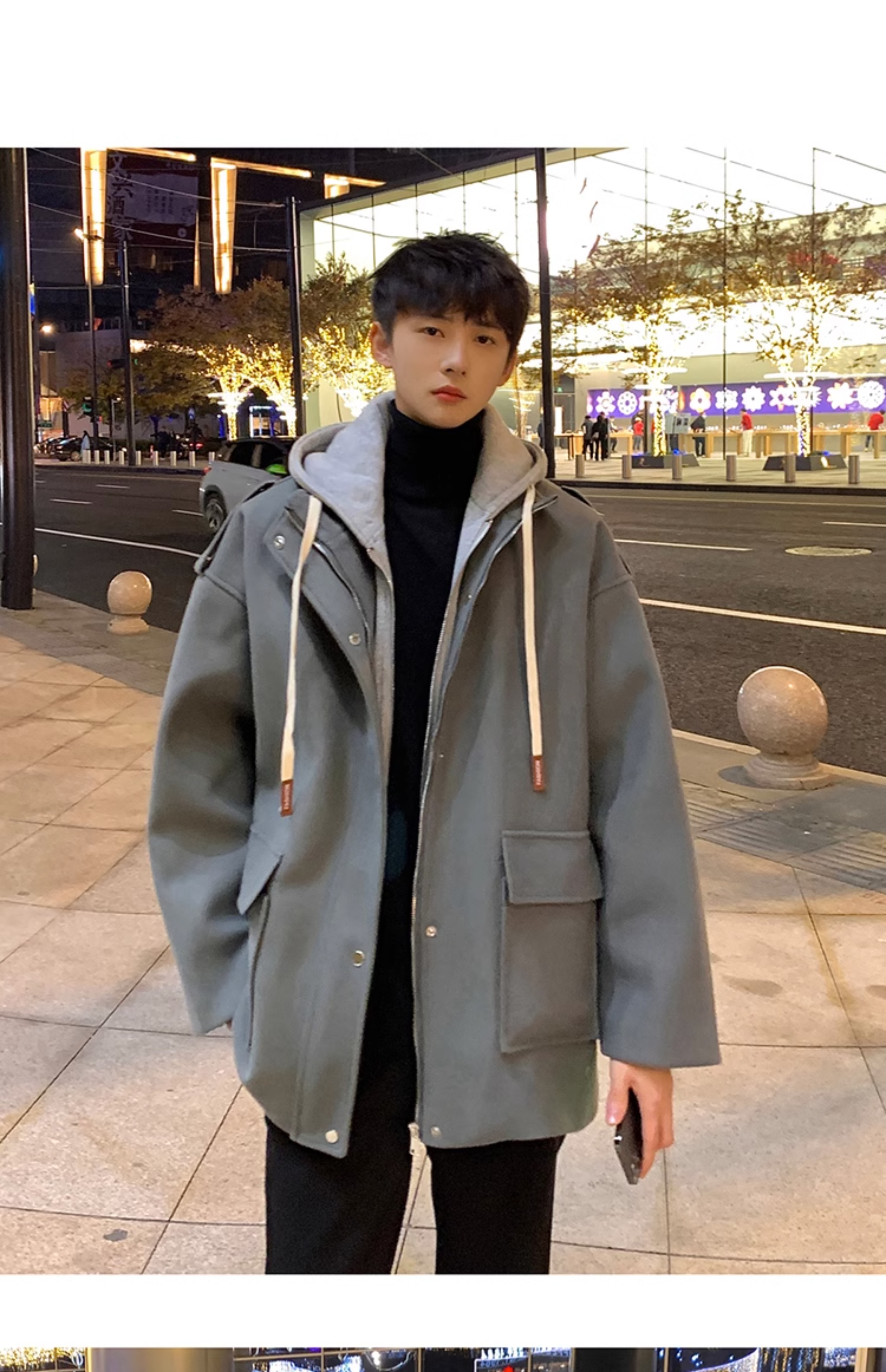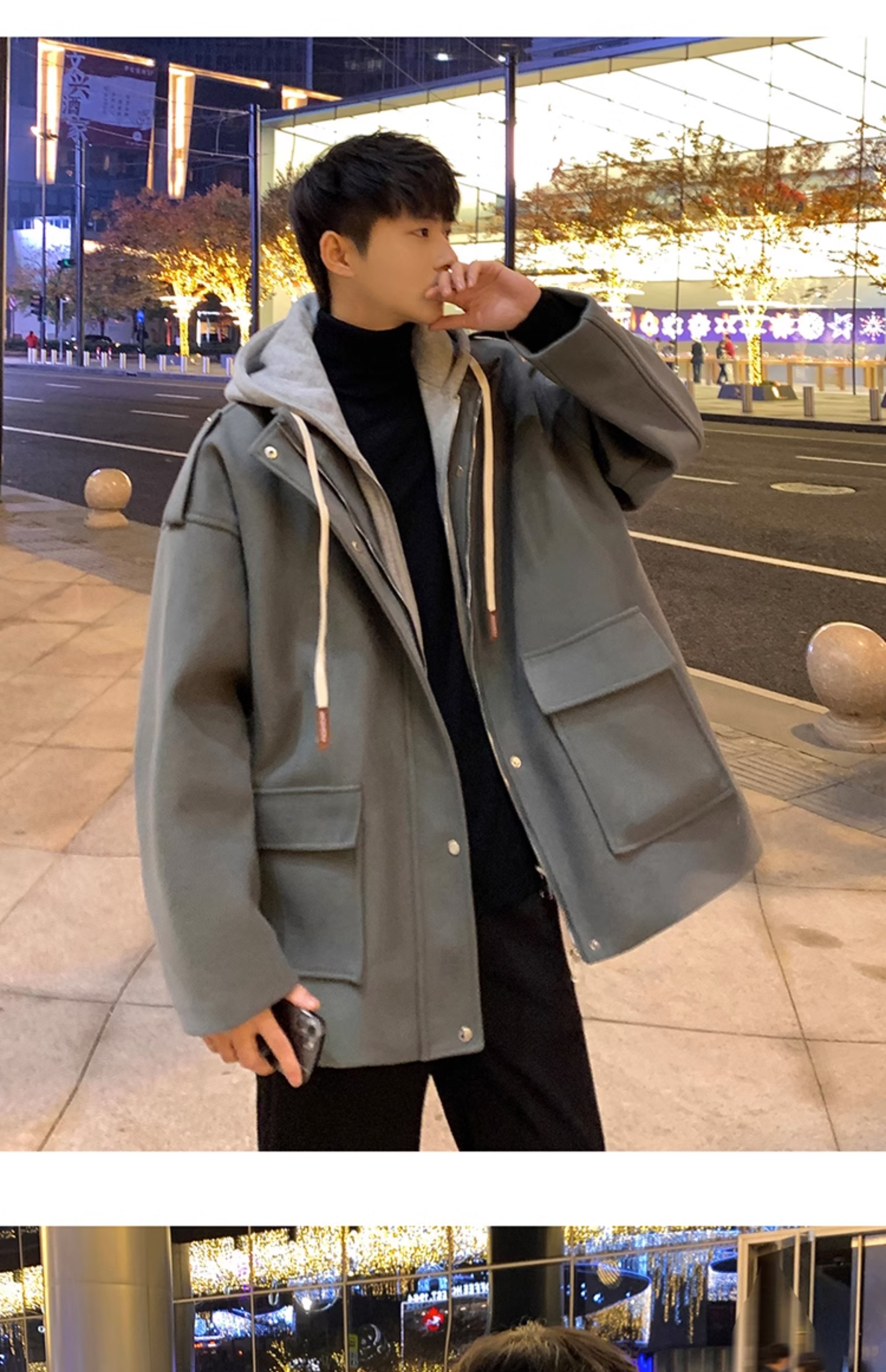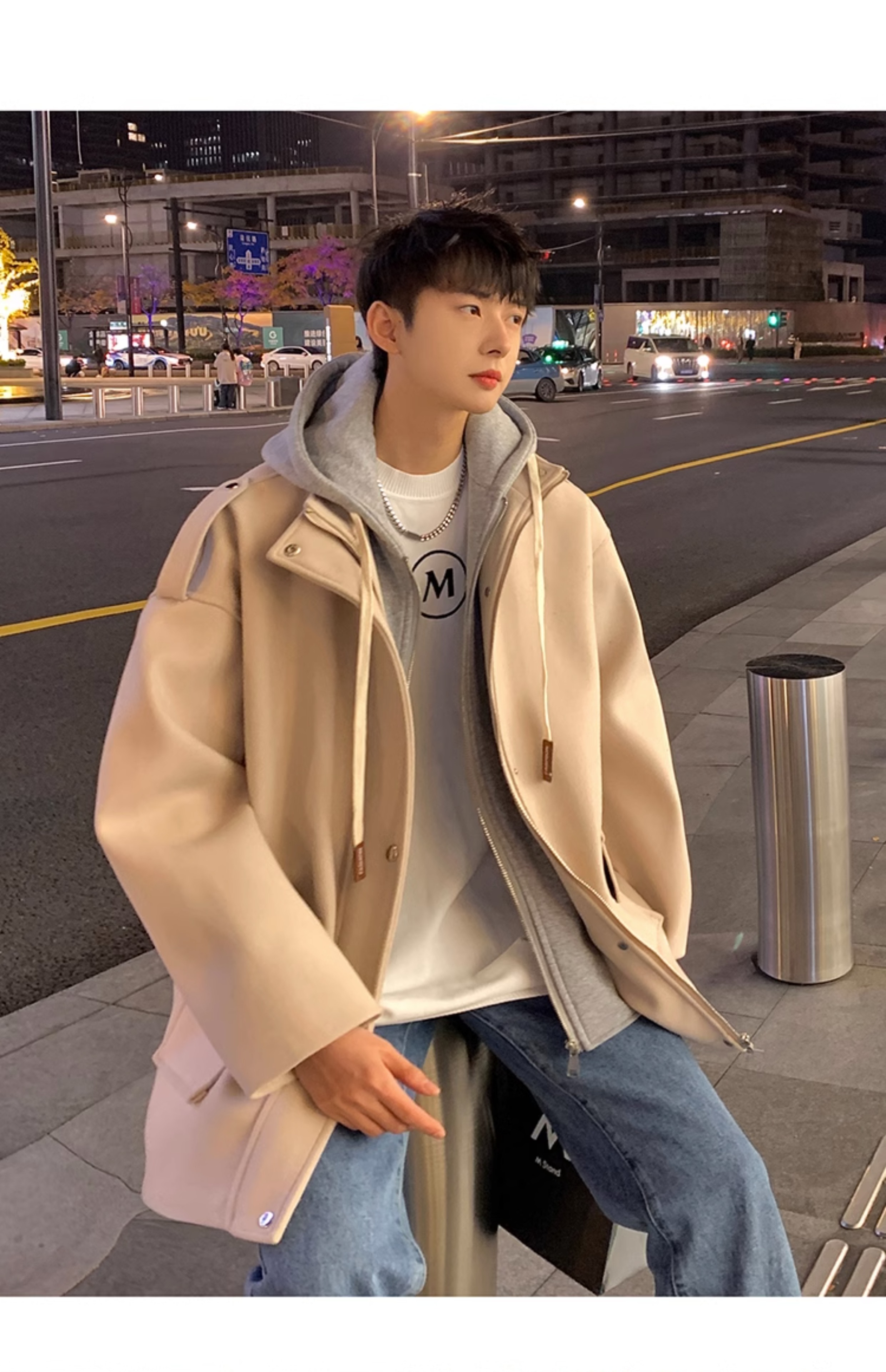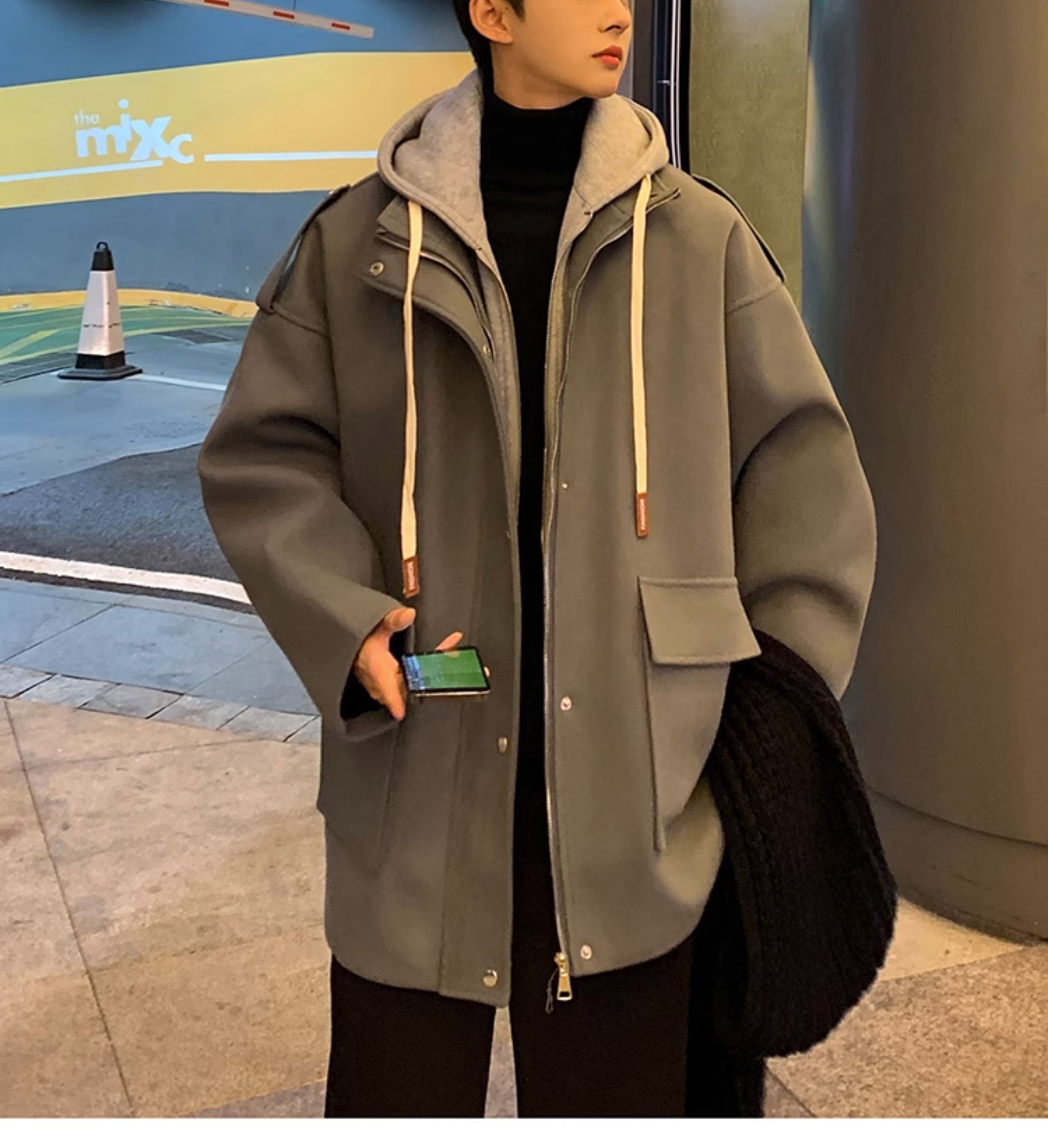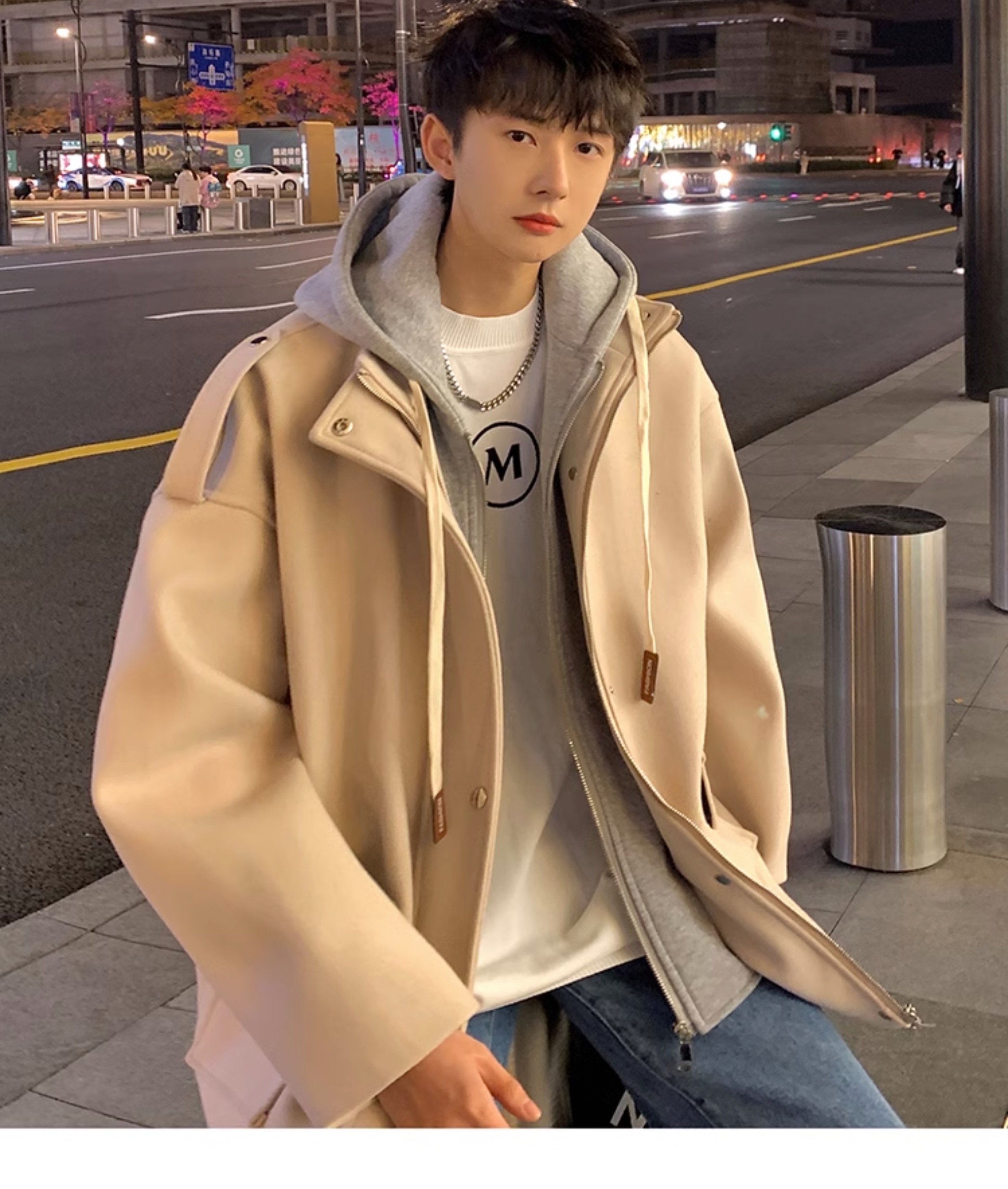 Wassup Happy Fake Two-Piece Woolen Coat for Men, Autumn and Winter, High-End, Loose, Casual, Hooded Windbreaker Jacket