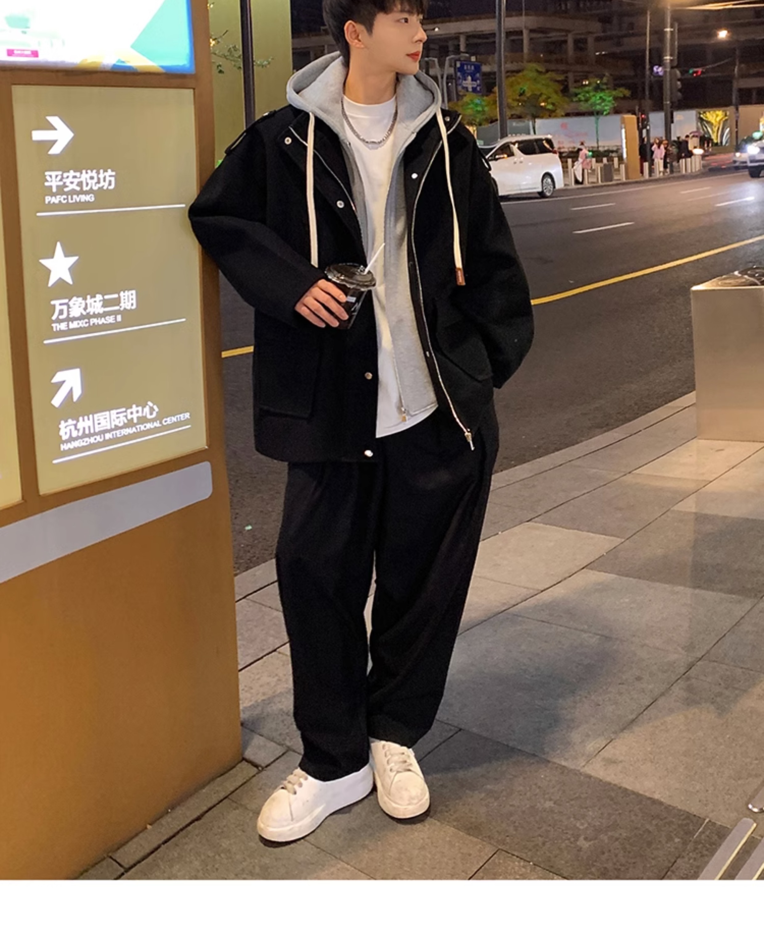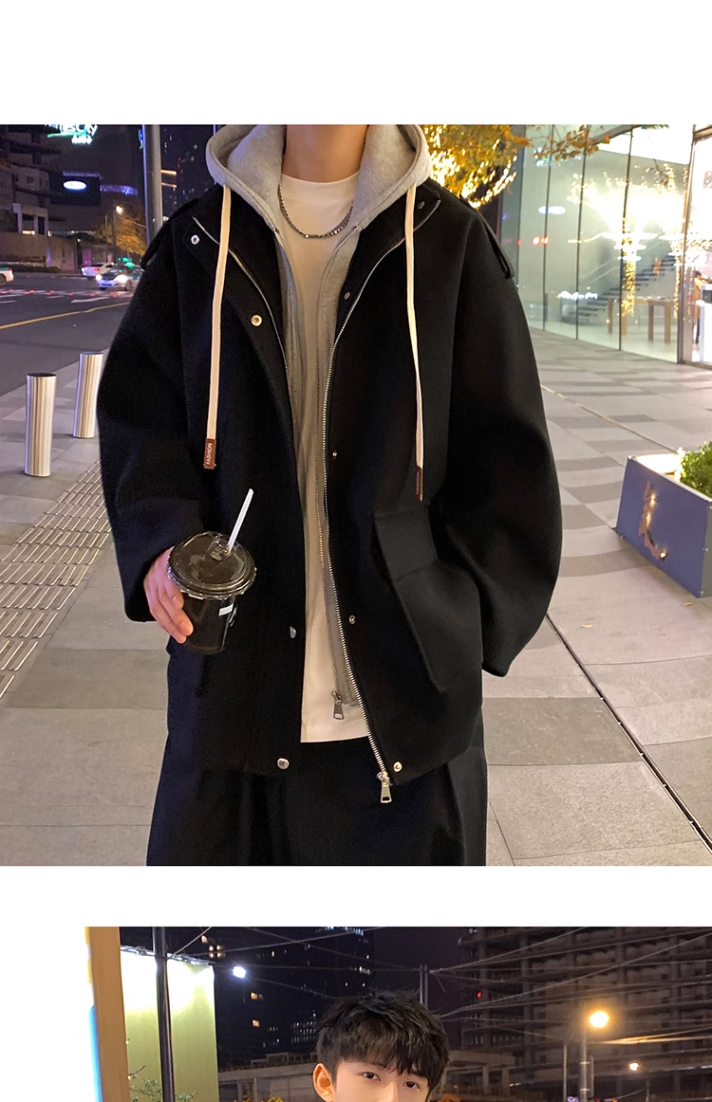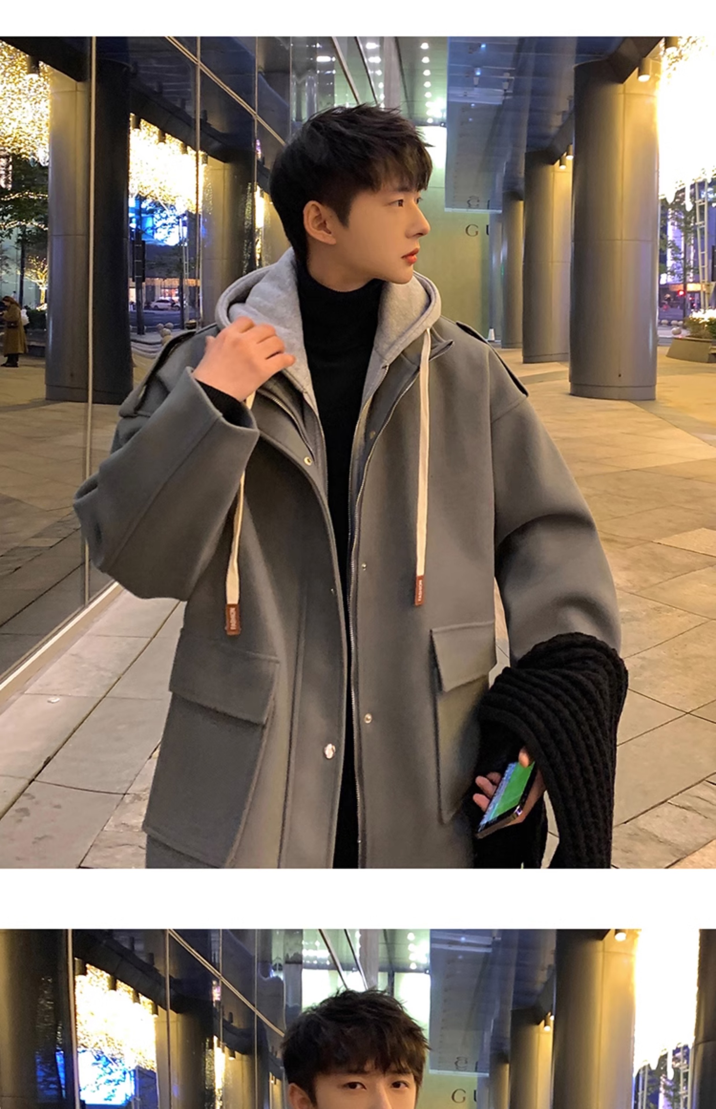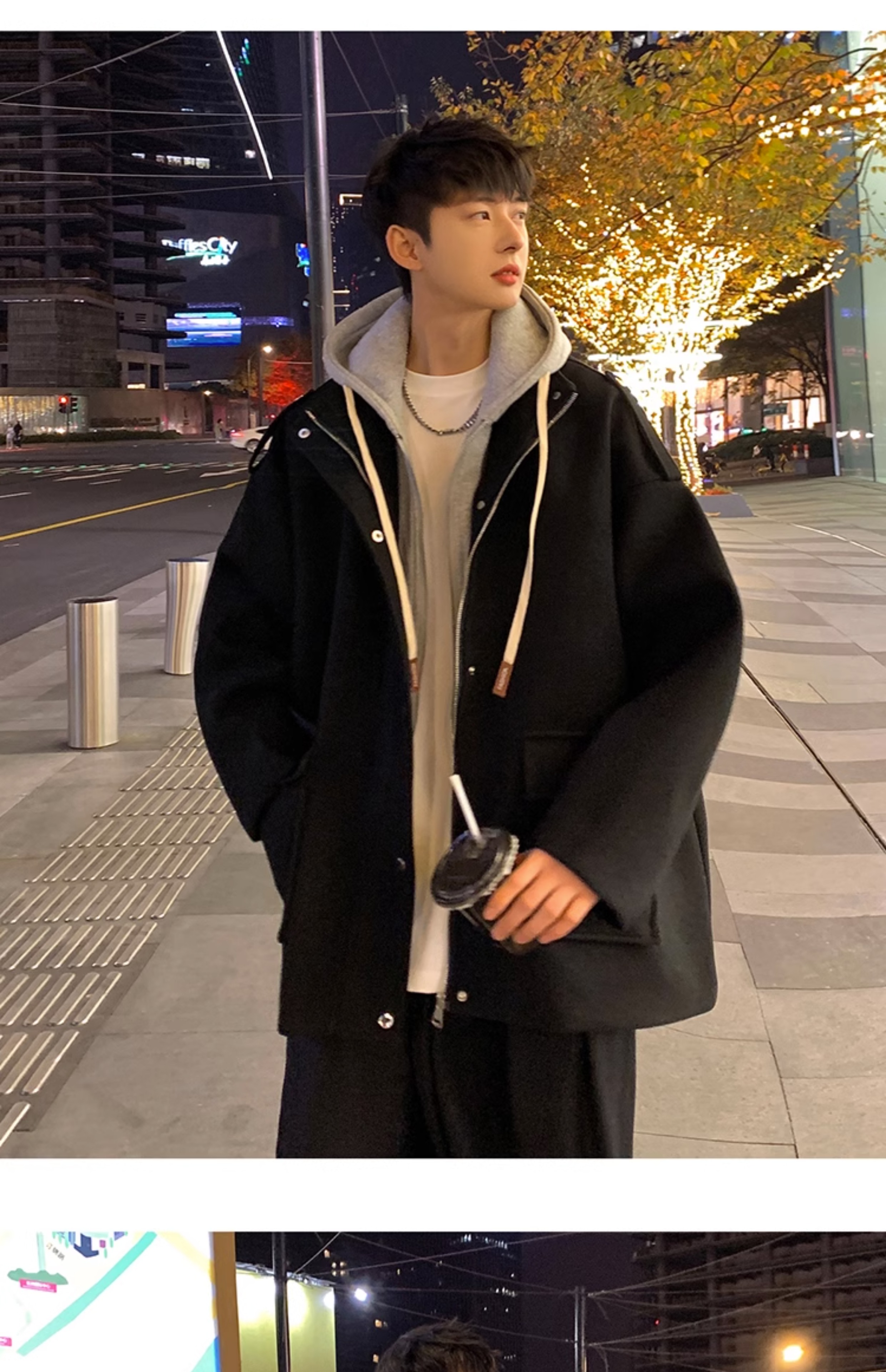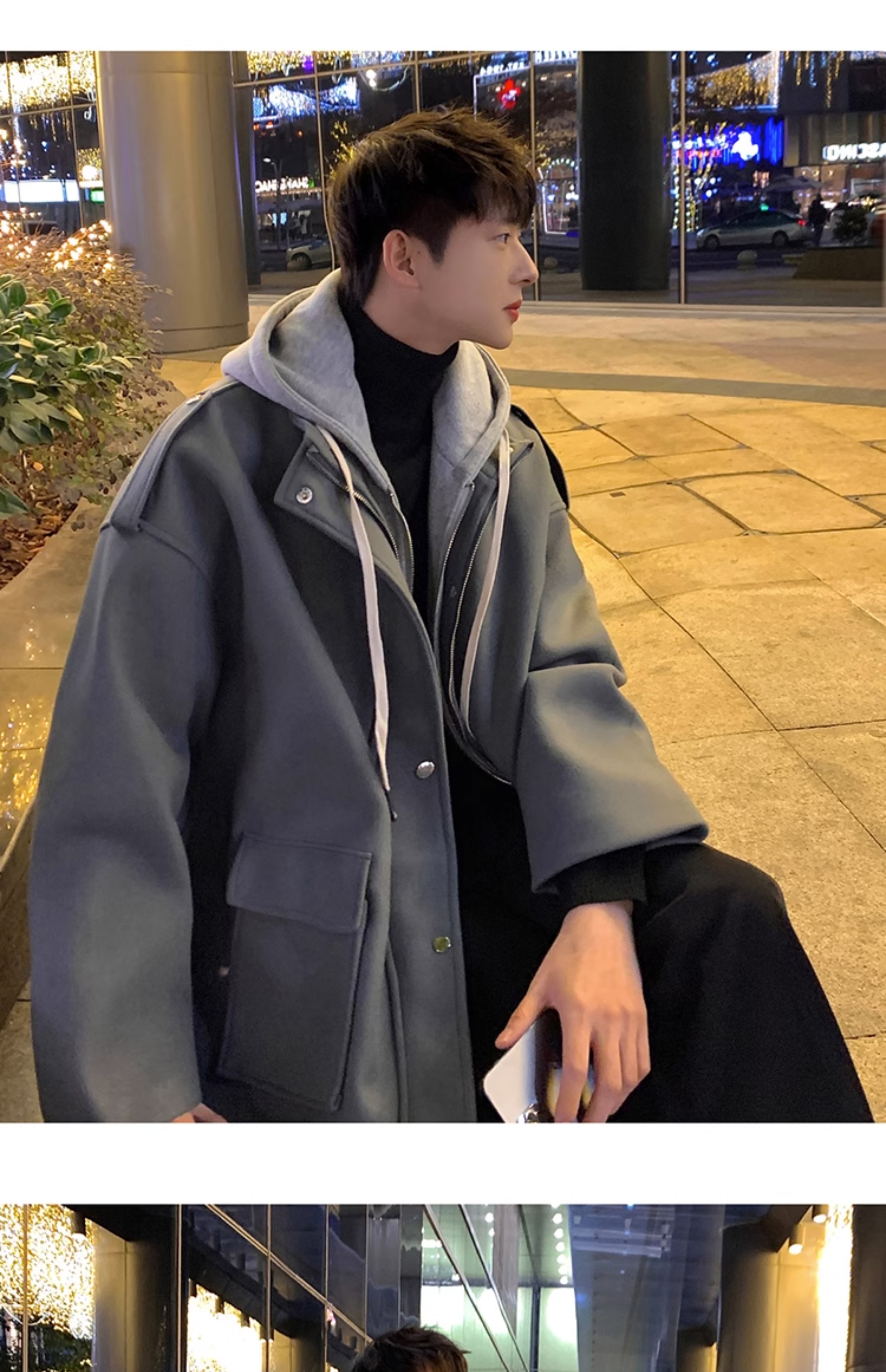 Wassup Happy Fake Two-Piece Woolen Coat for Men, Autumn and Winter, High-End, Loose, Casual, Hooded Windbreaker Jacket