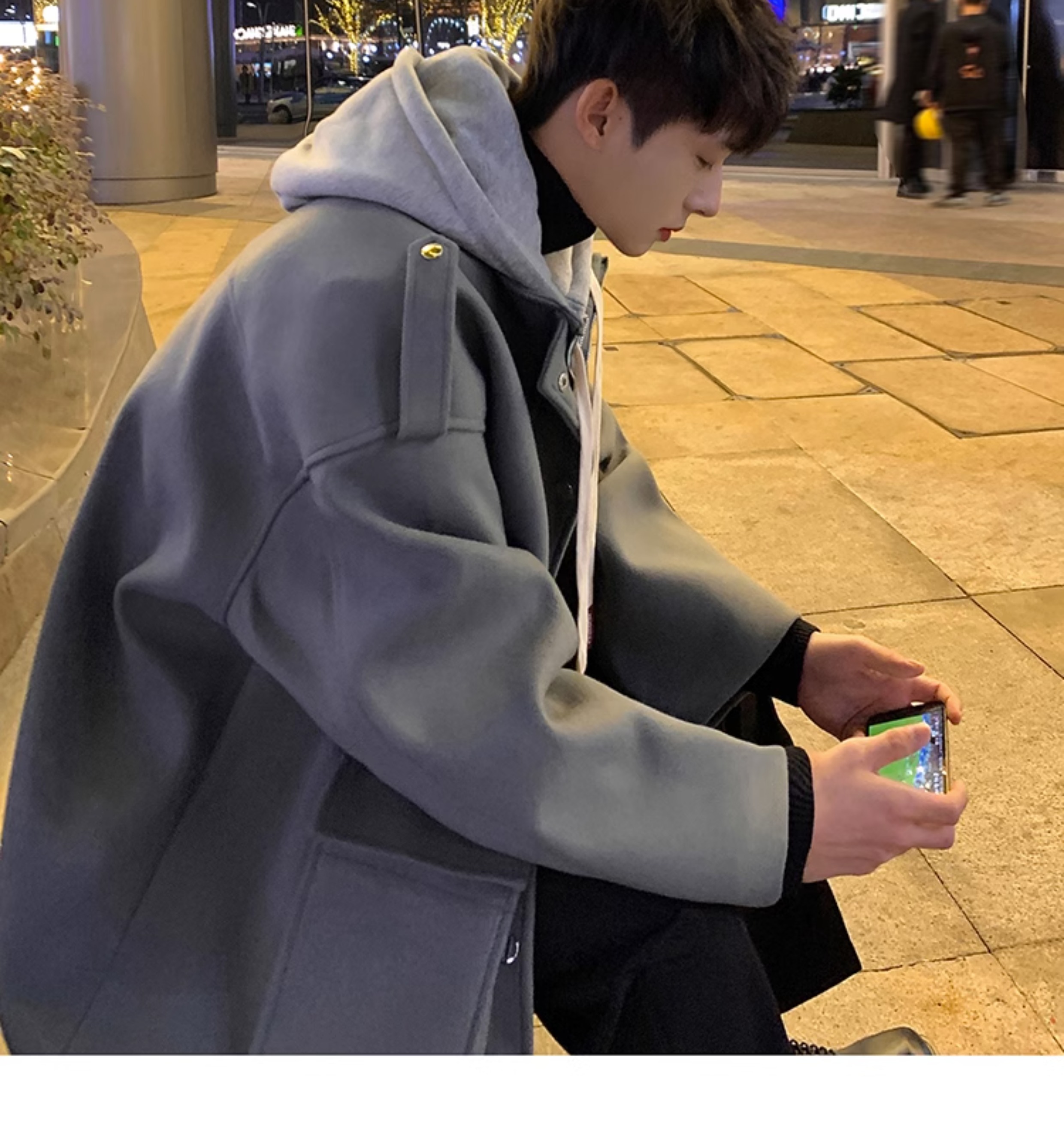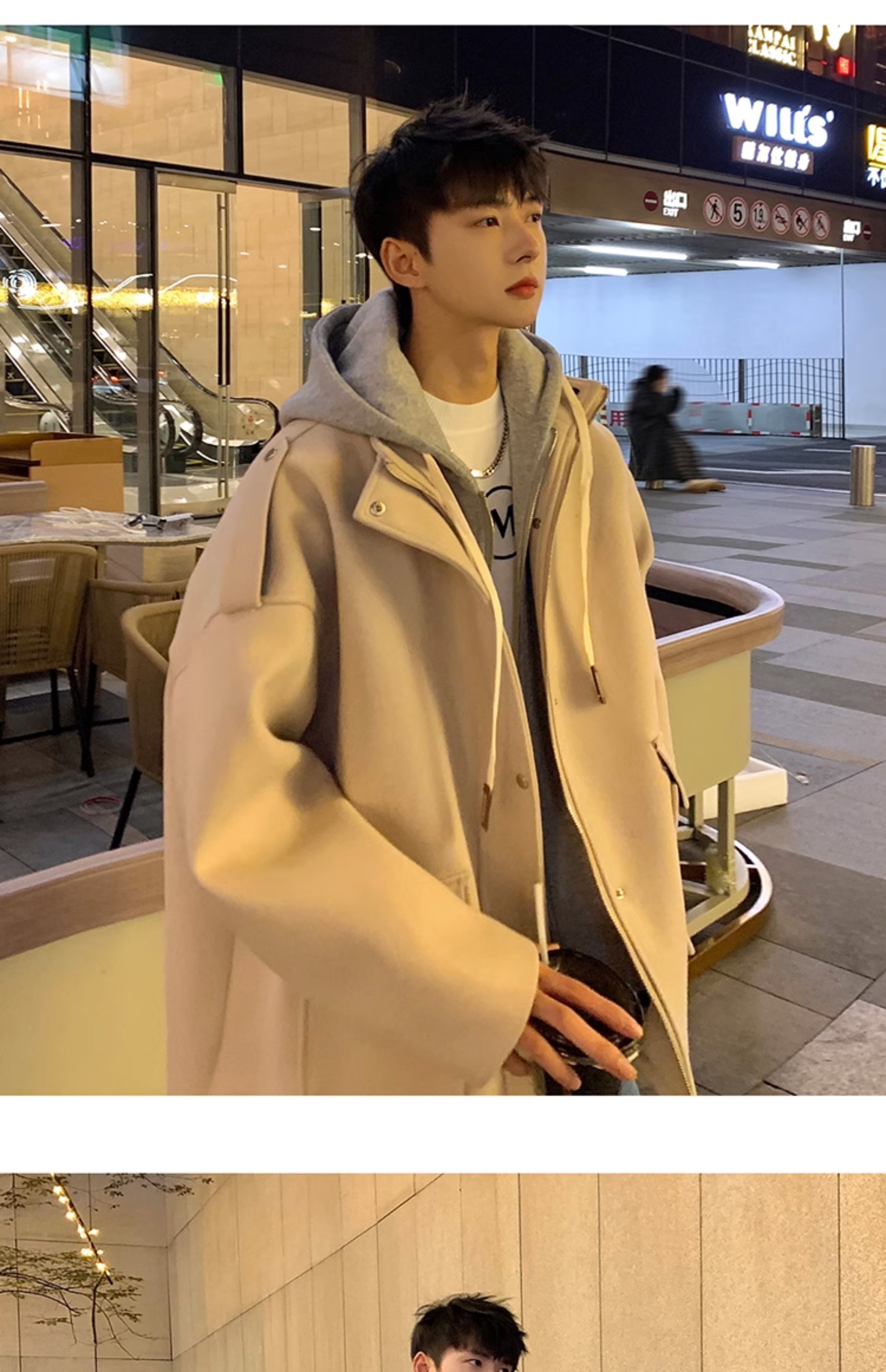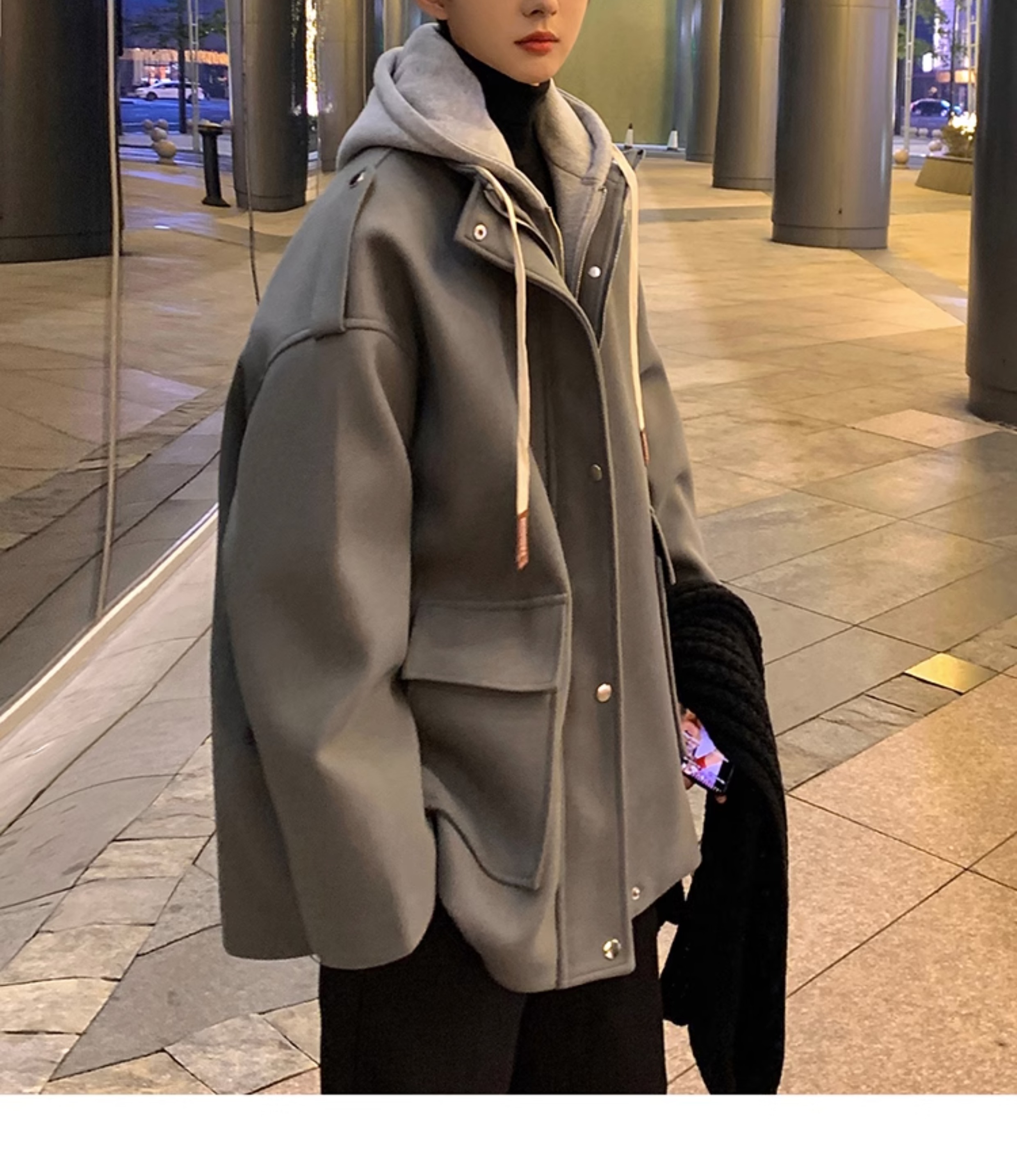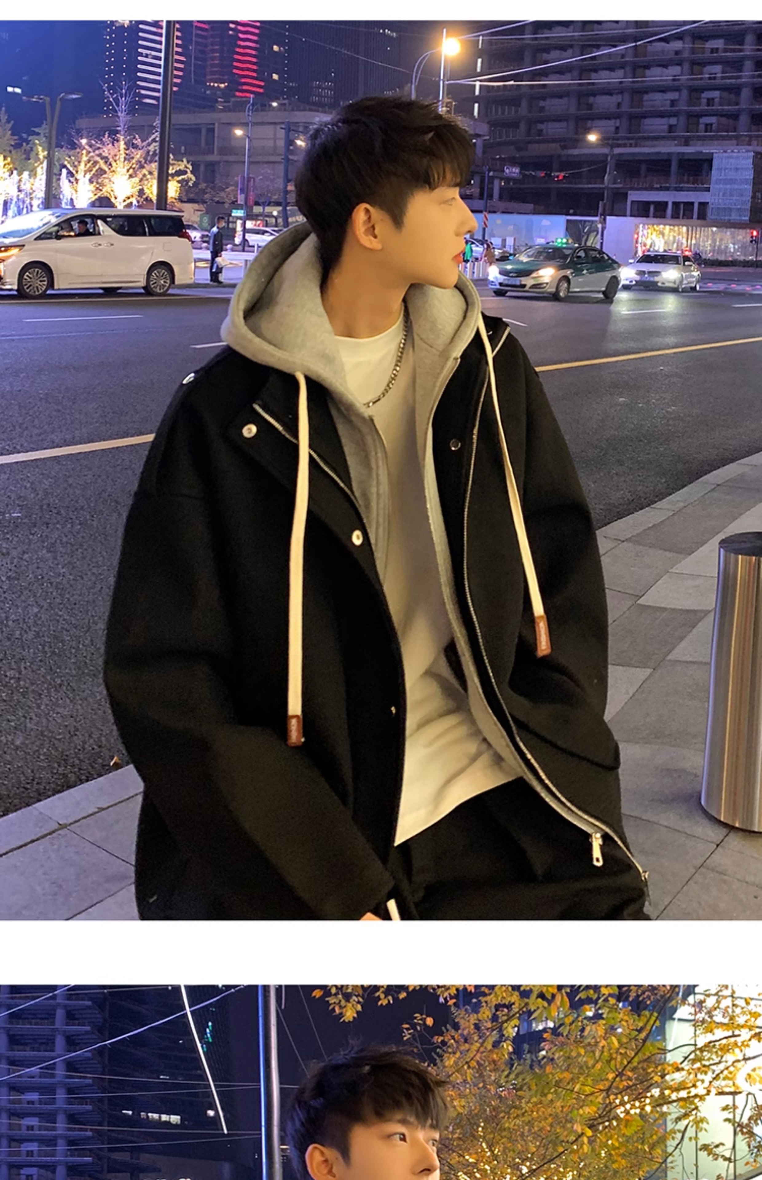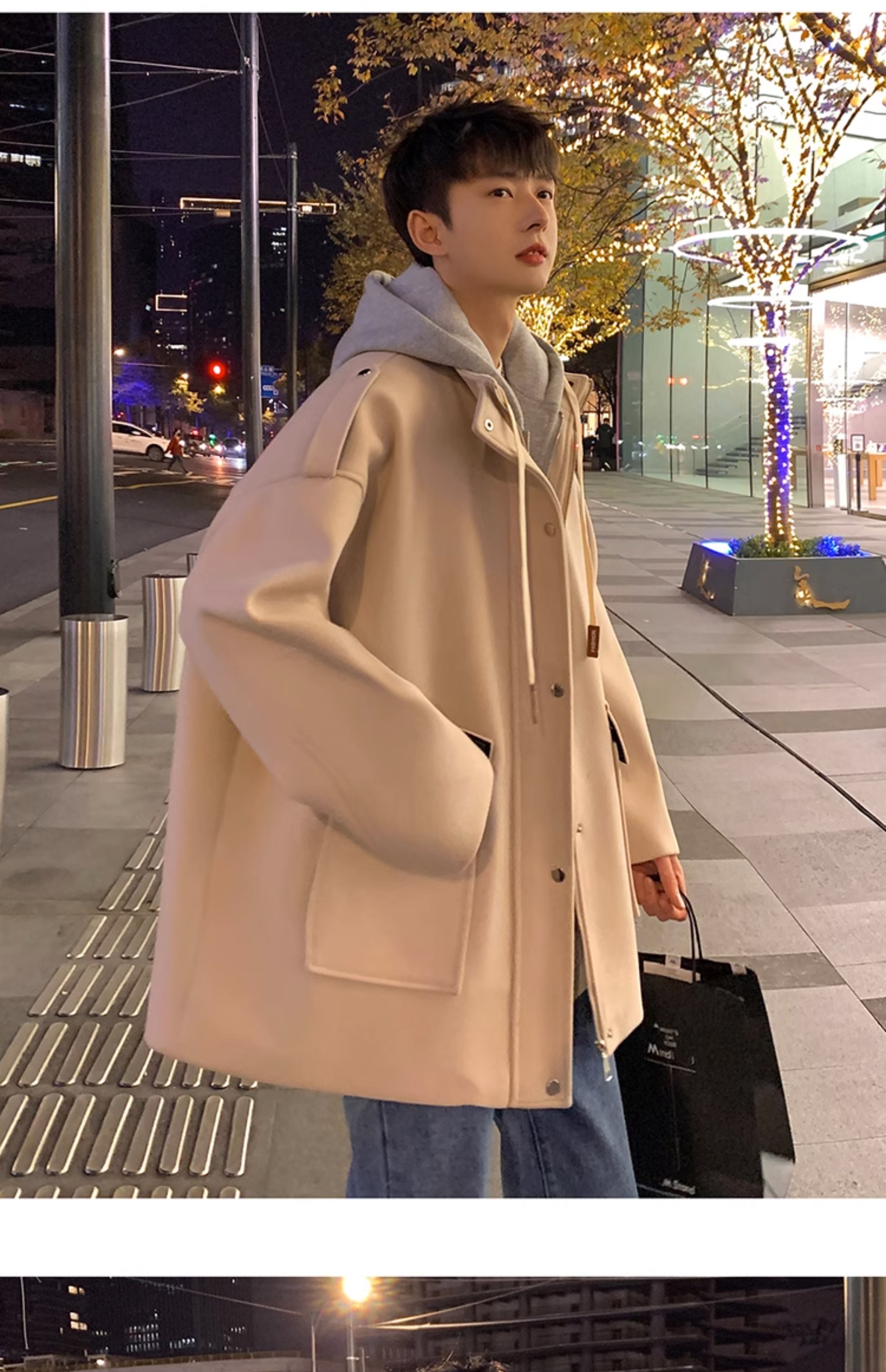 Wassup Happy Fake Two-Piece Woolen Coat for Men, Autumn and Winter, High-End, Loose, Casual, Hooded Windbreaker Jacket