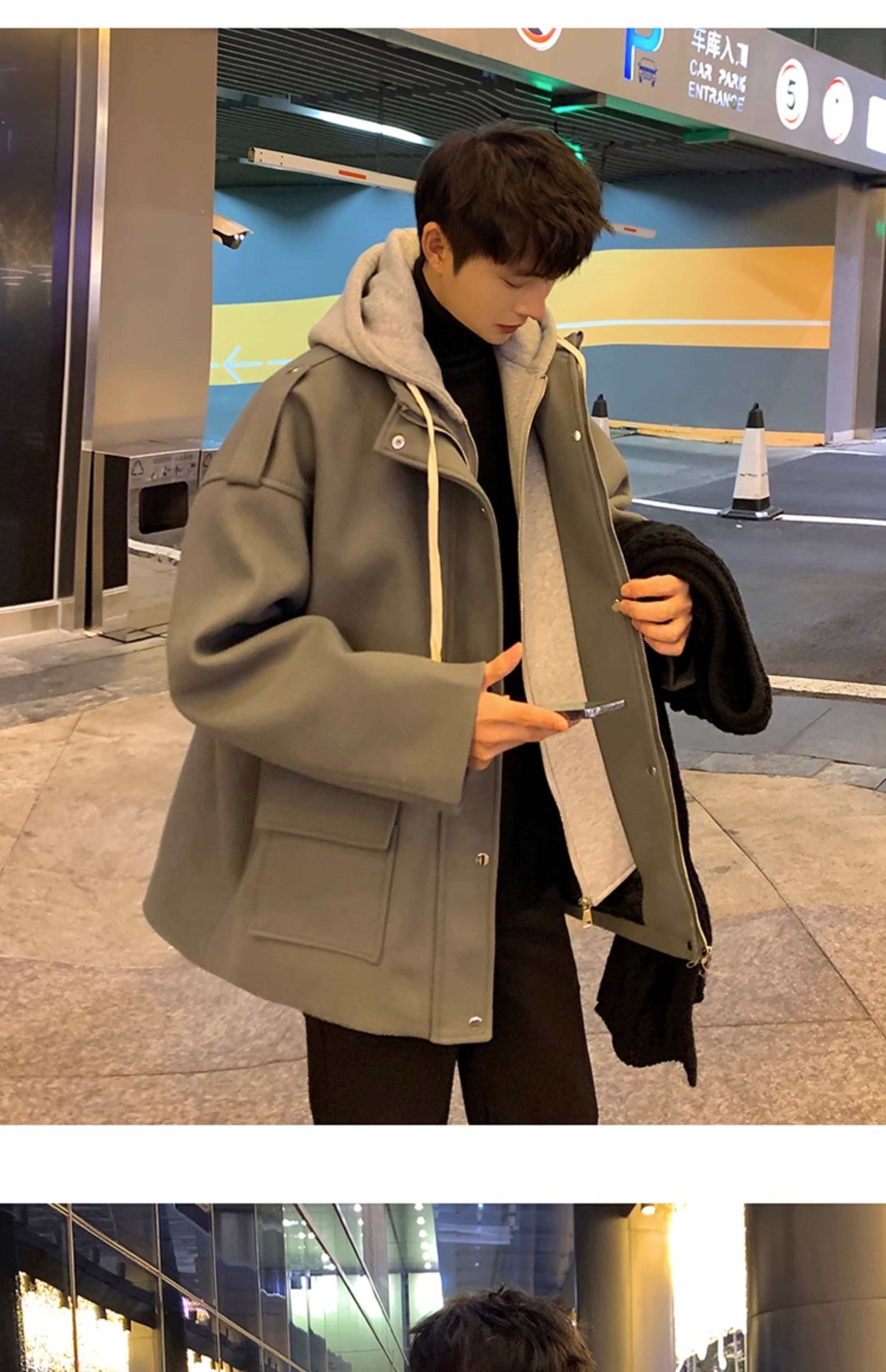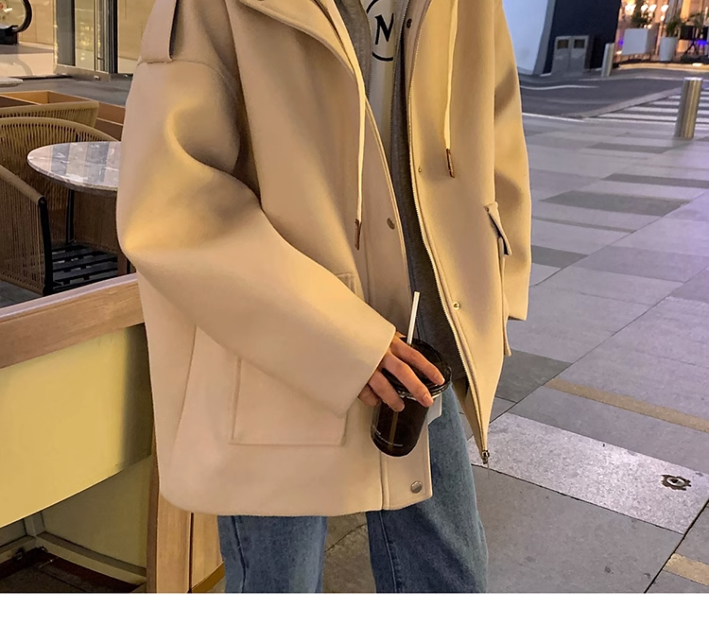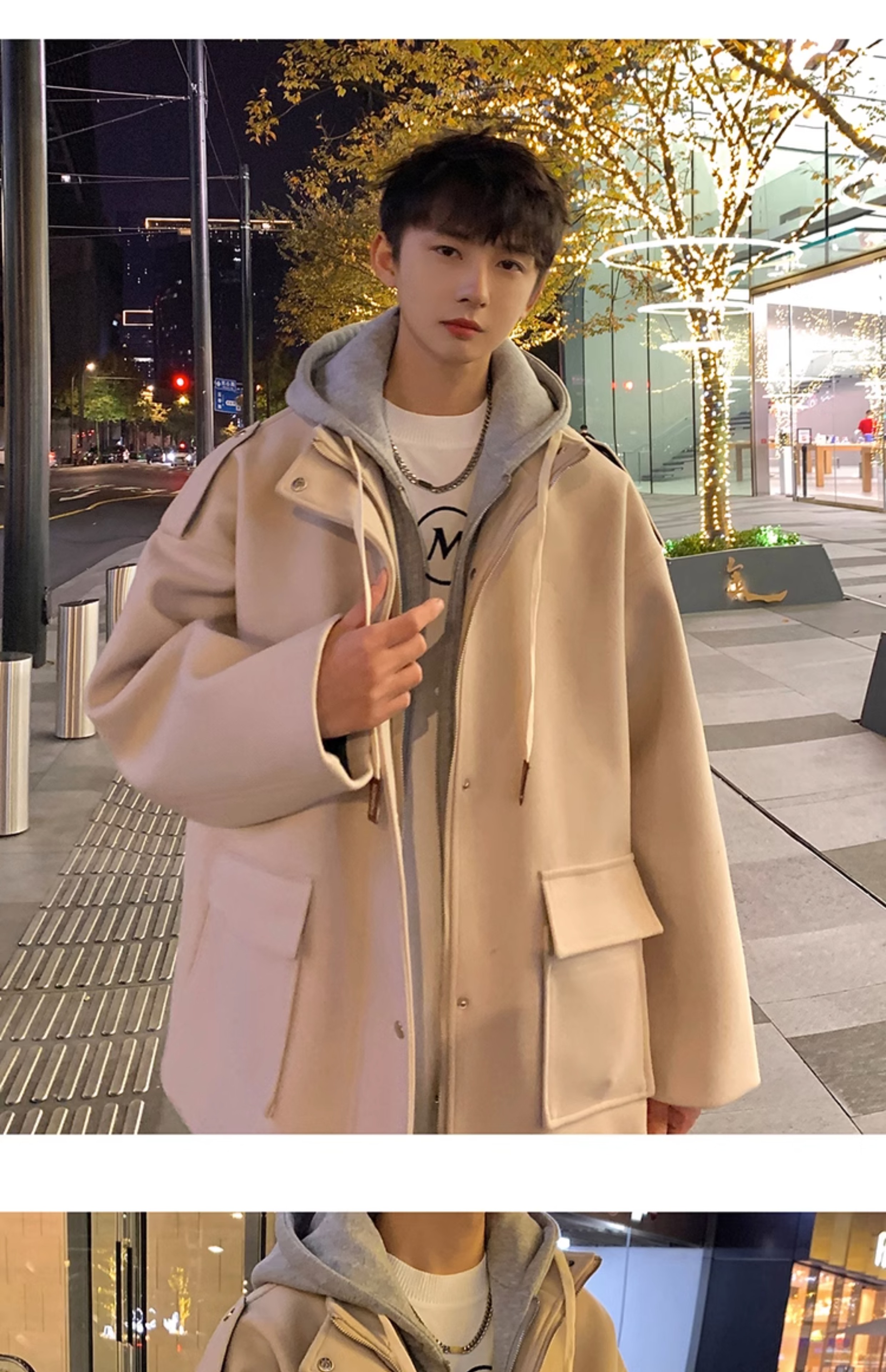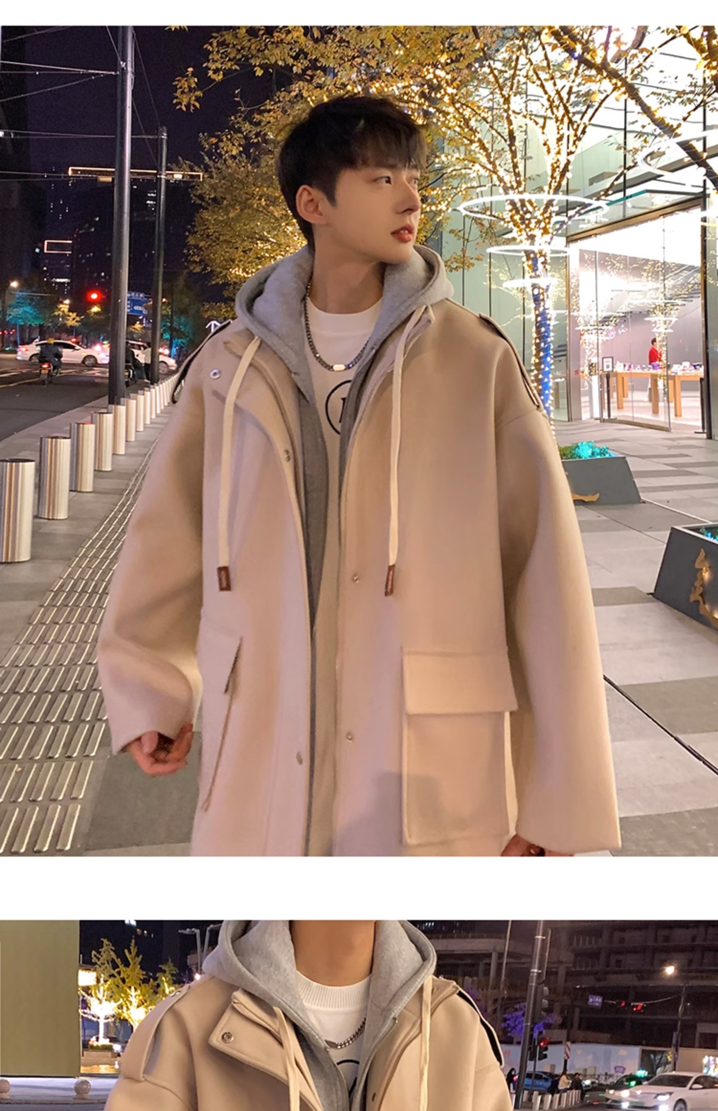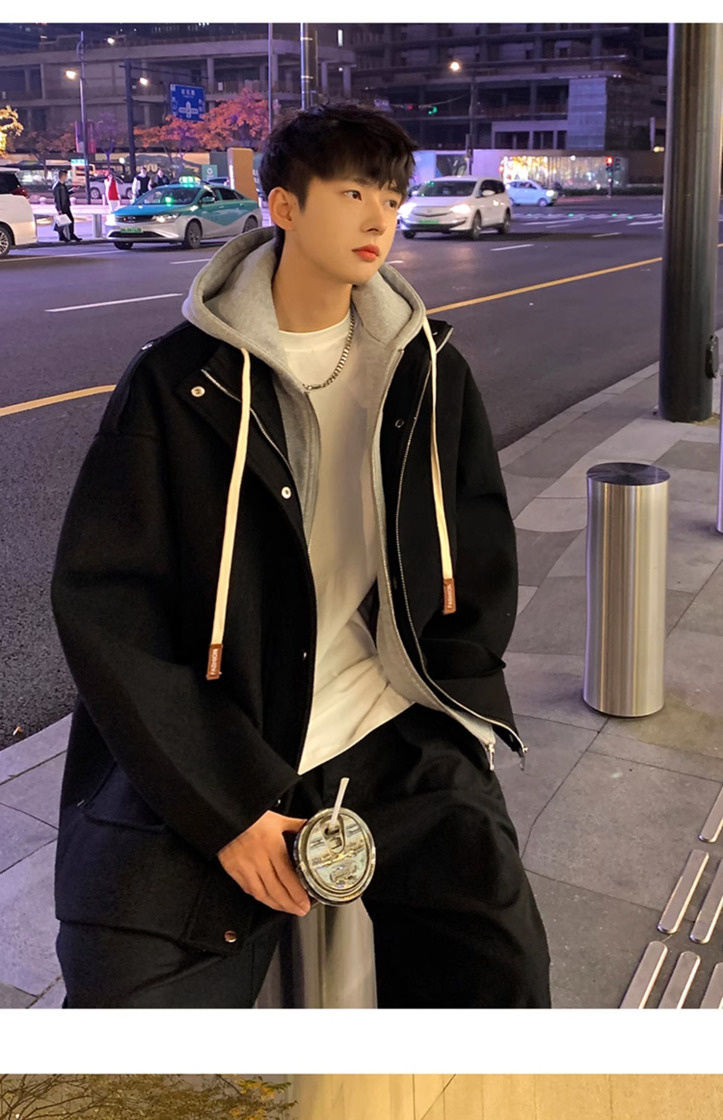 Wassup Happy Fake Two-Piece Woolen Coat for Men, Autumn and Winter, High-End, Loose, Casual, Hooded Windbreaker Jacket