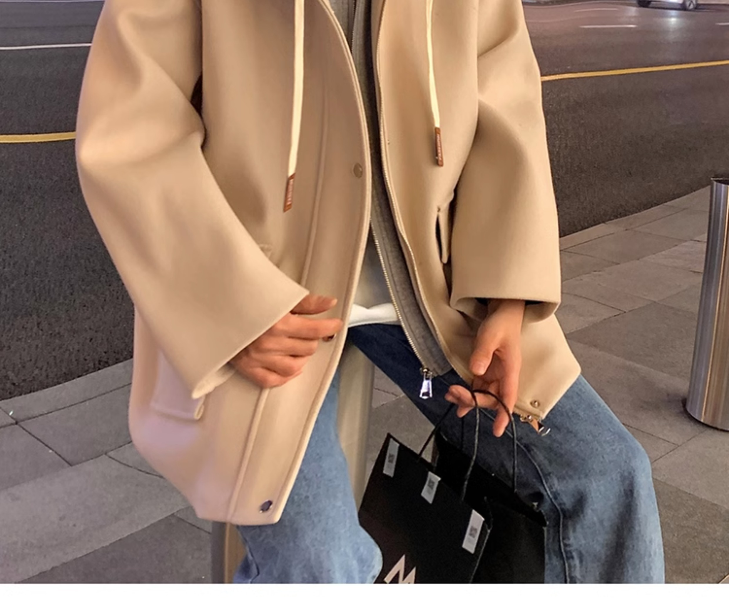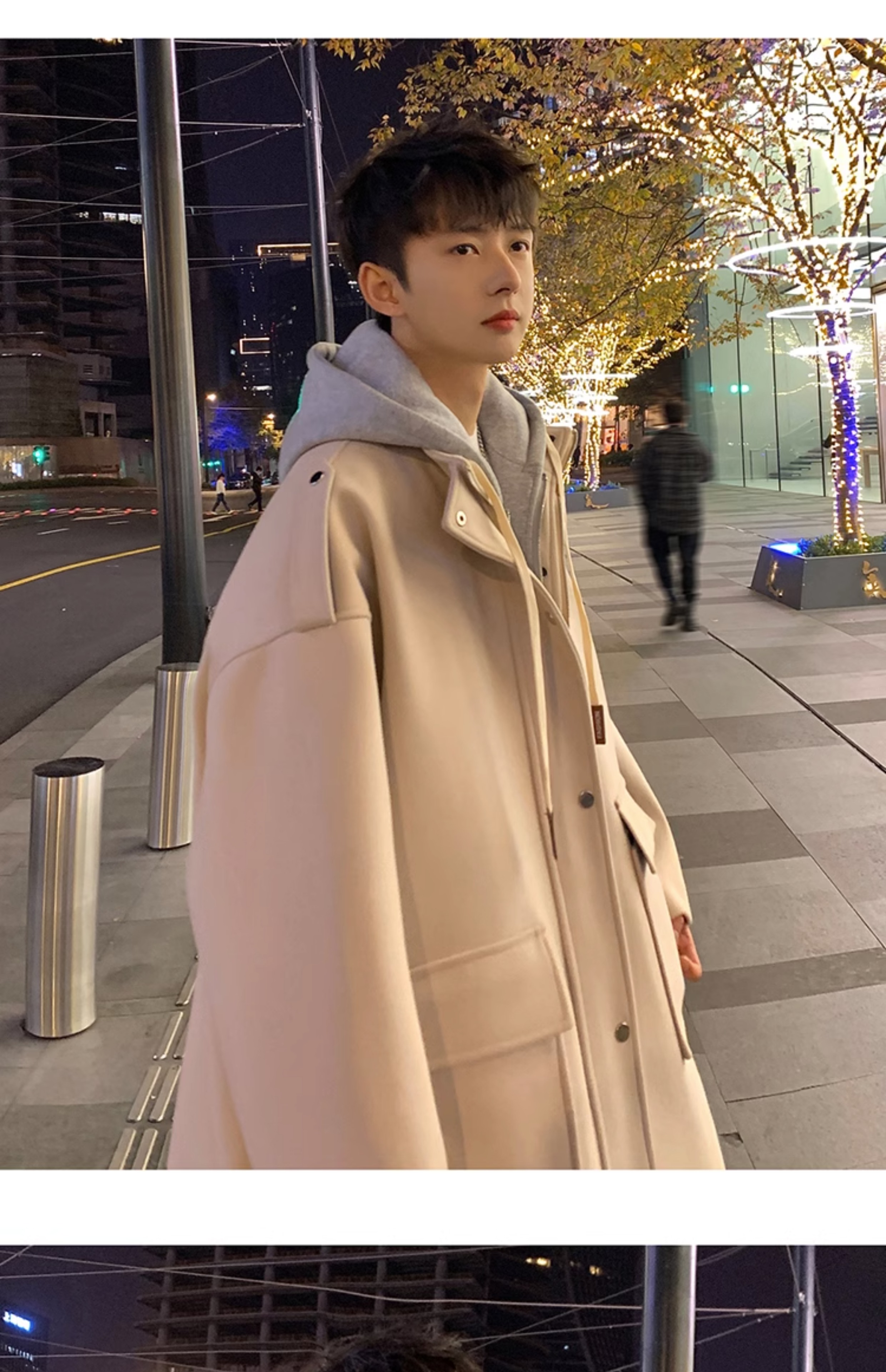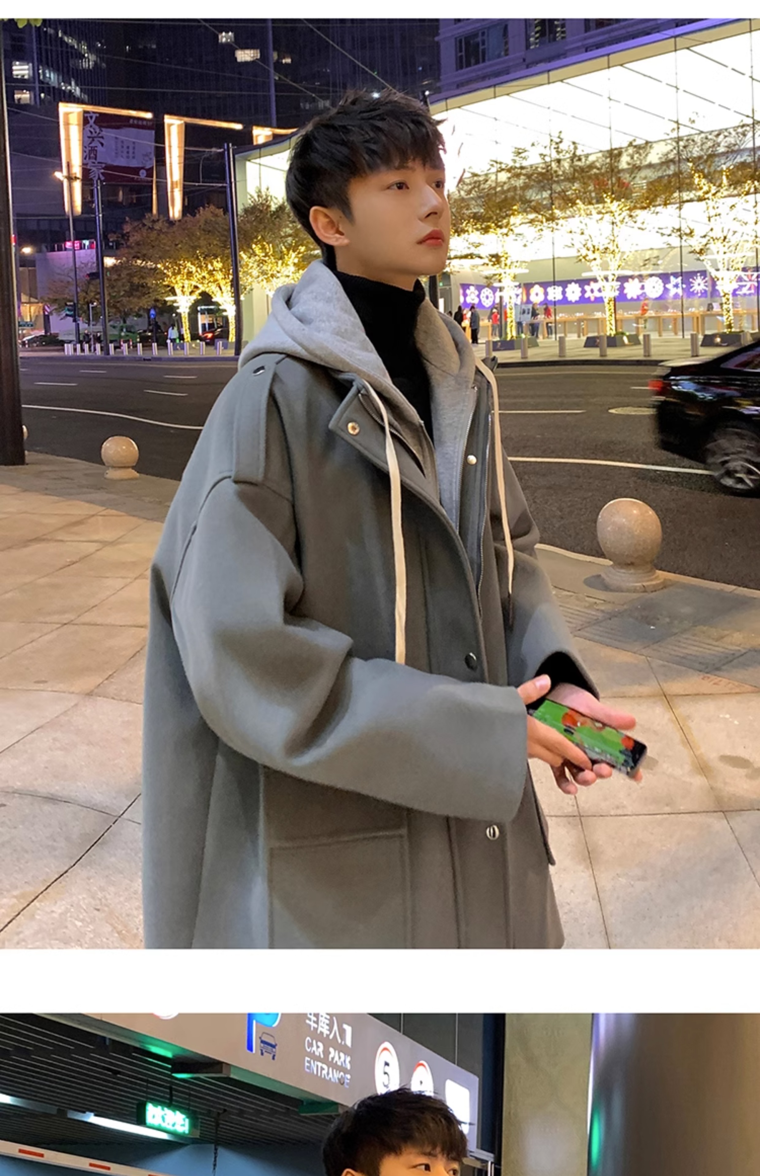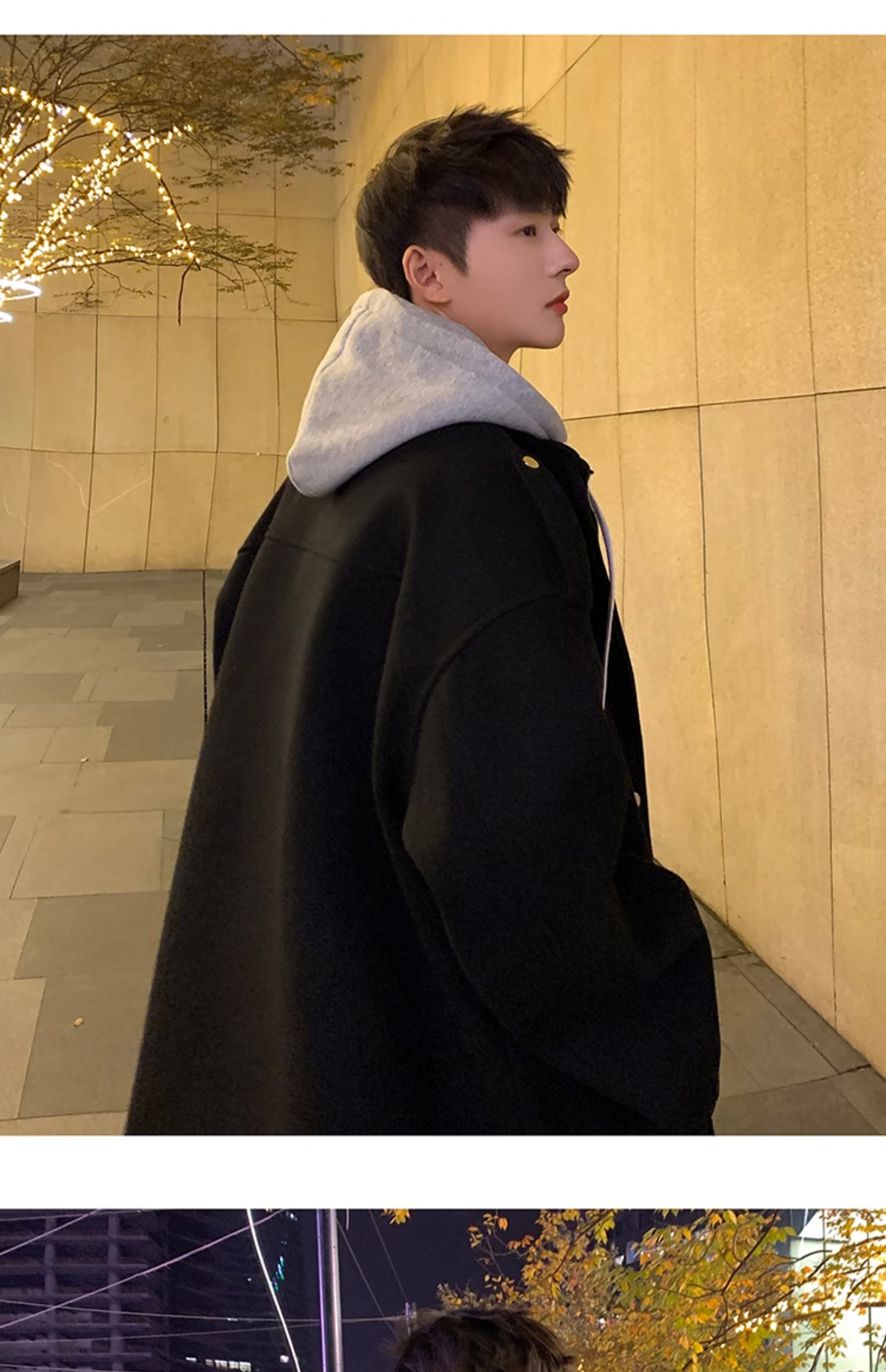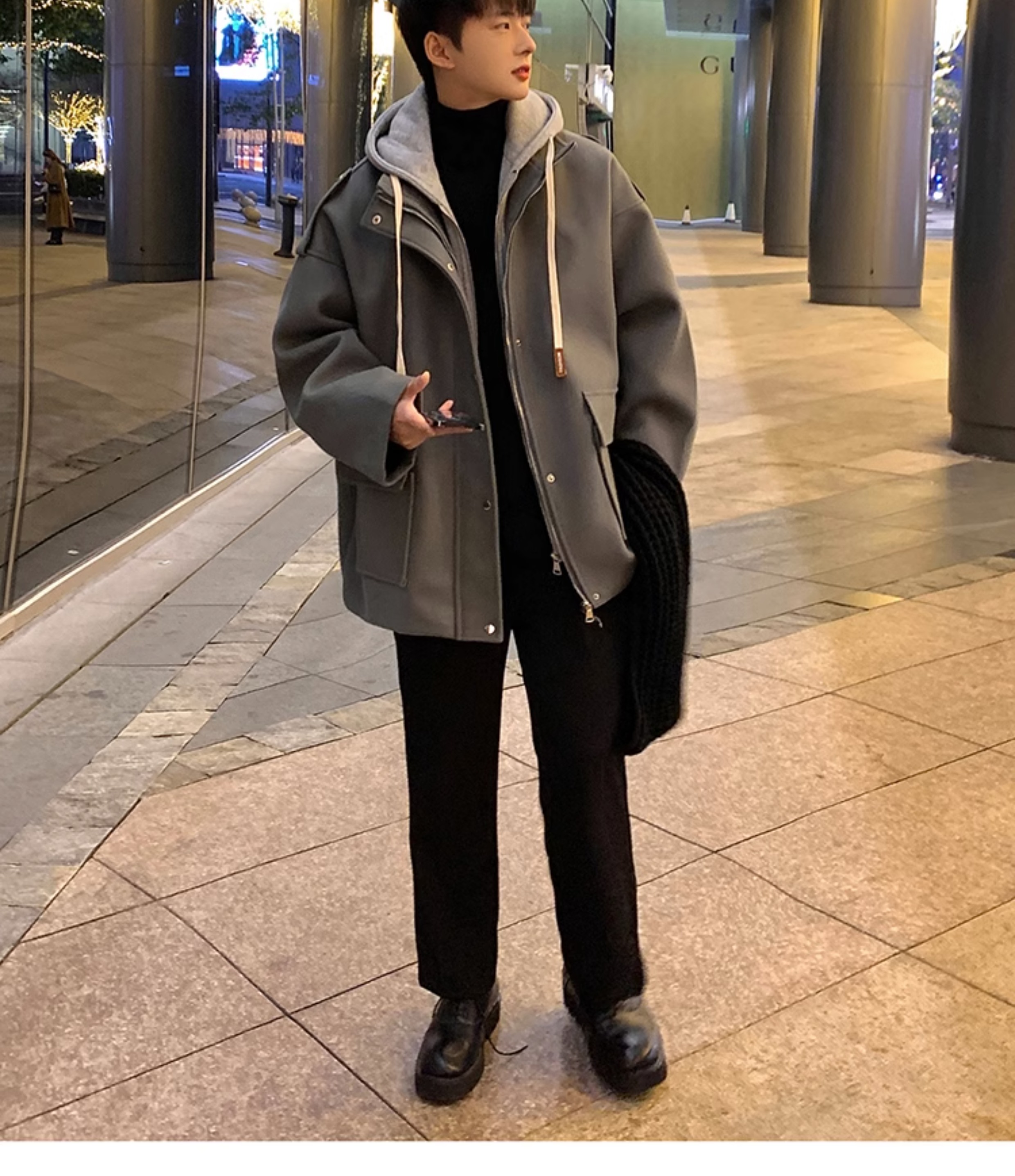 Wassup Happy Fake Two-Piece Woolen Coat for Men, Autumn and Winter, High-End, Loose, Casual, Hooded Windbreaker Jacket