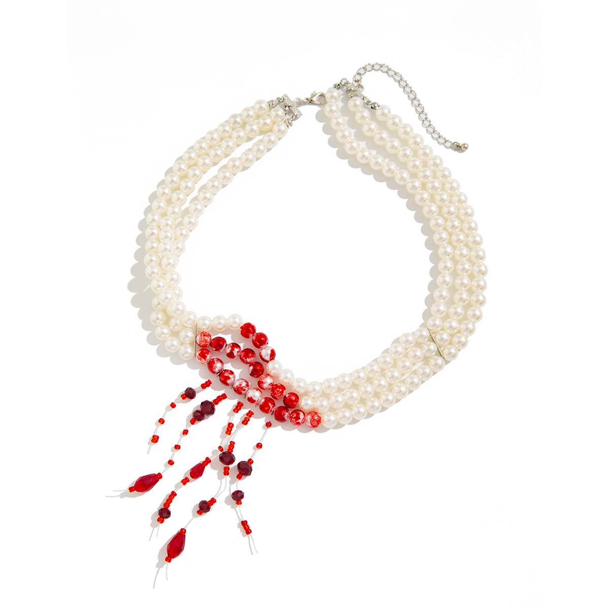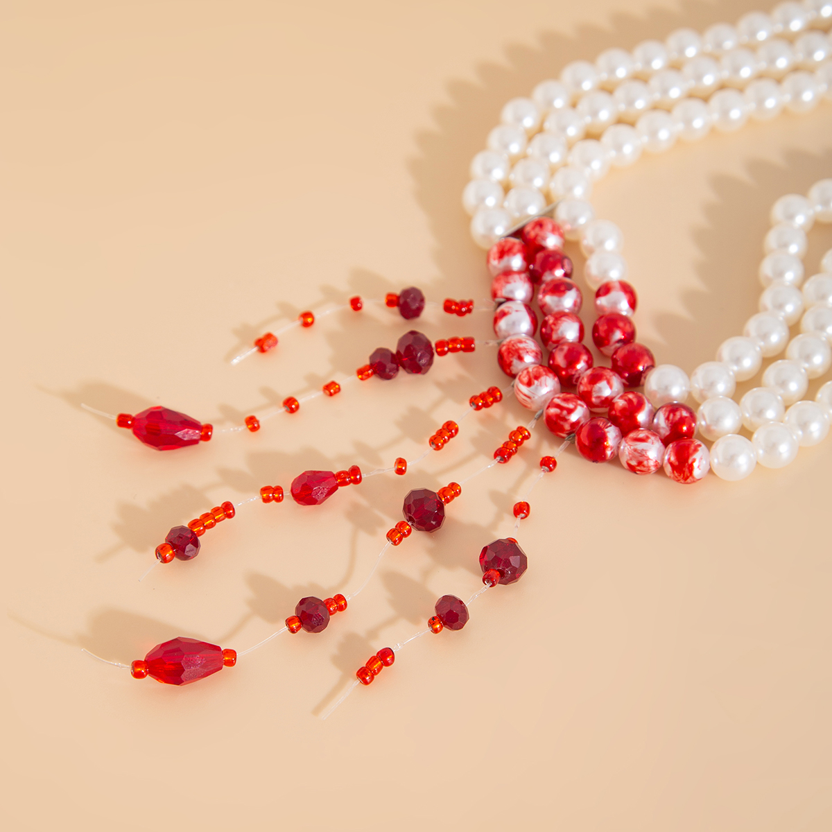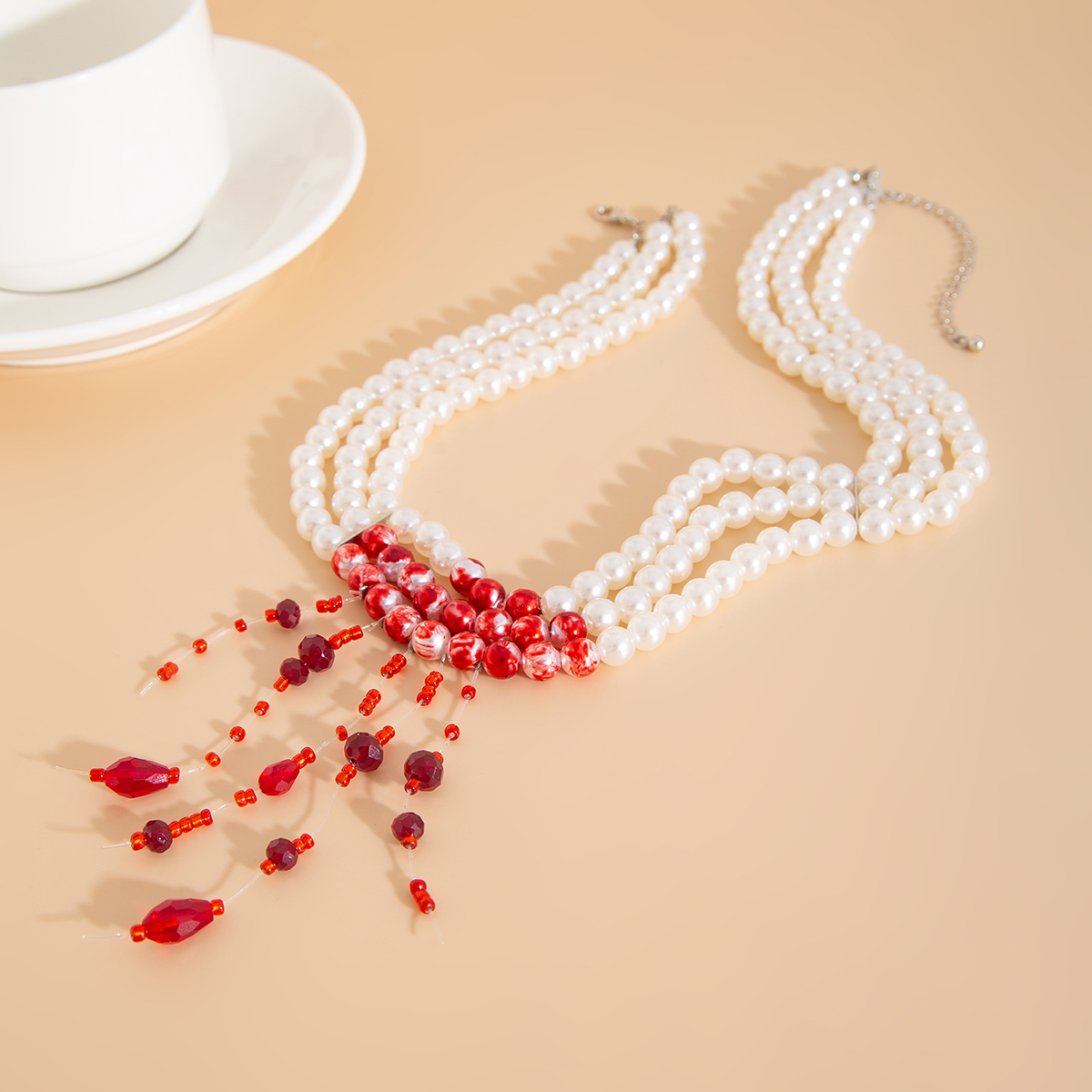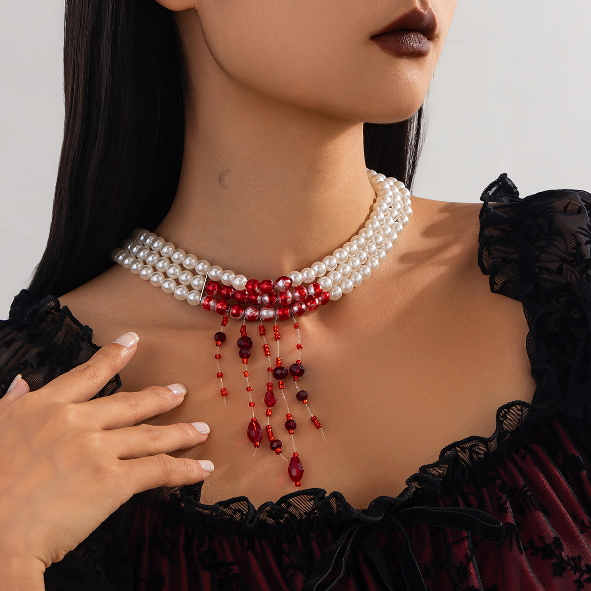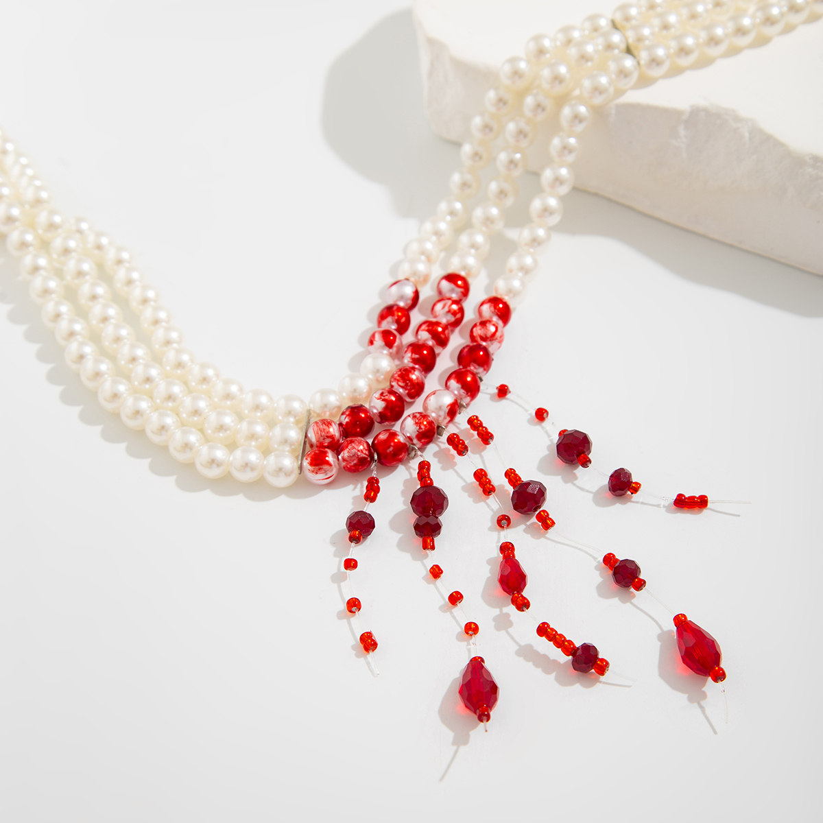 Halloween Three-Layer Imitation Pearl Tassel Crystal Necklace Gothic Style Blood Drop Cosplay Choker