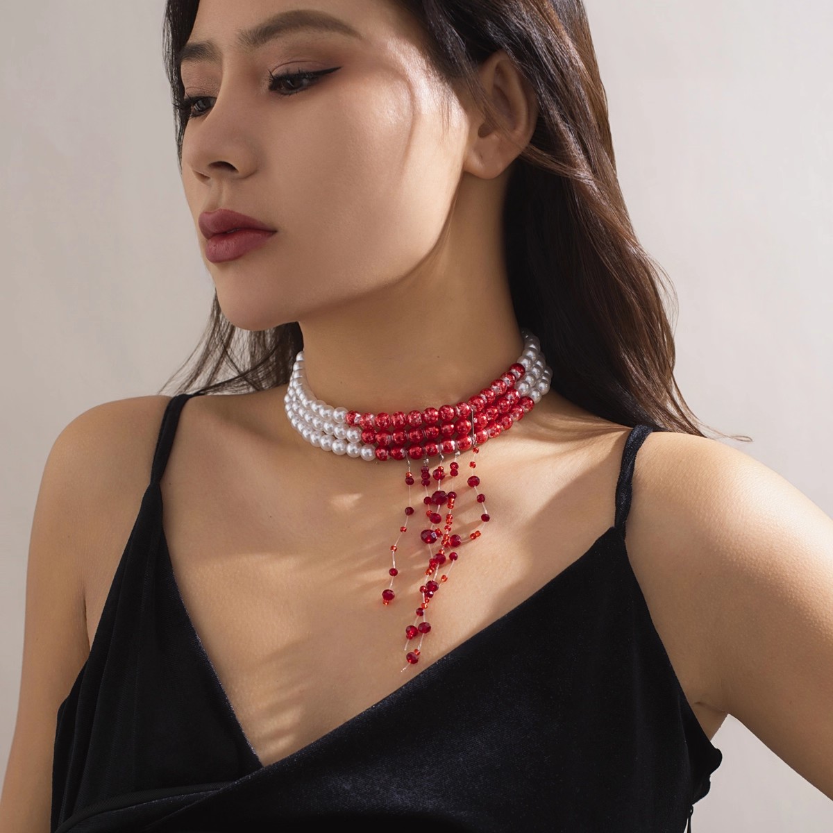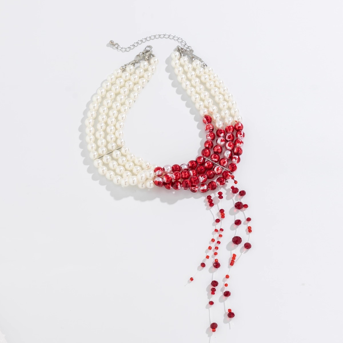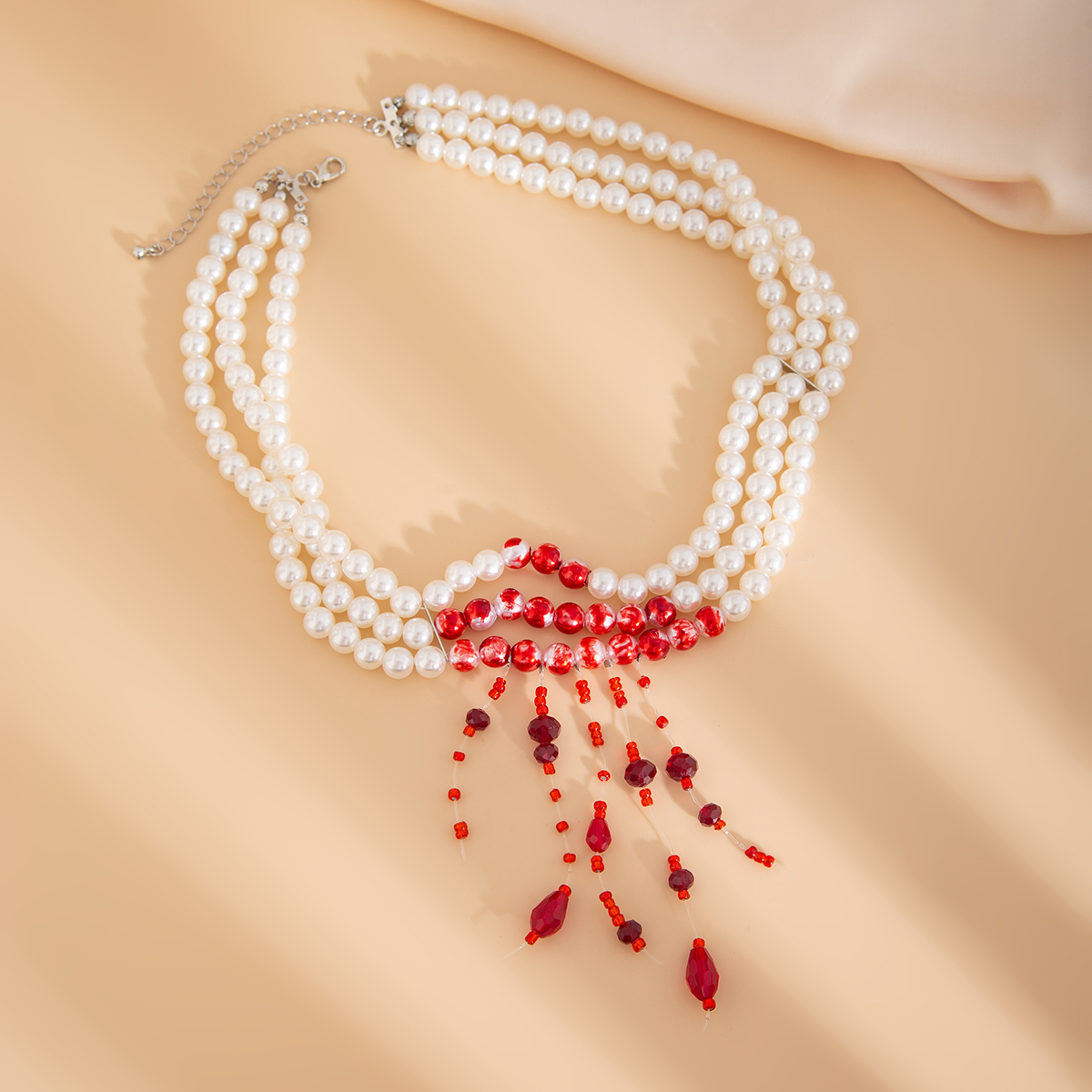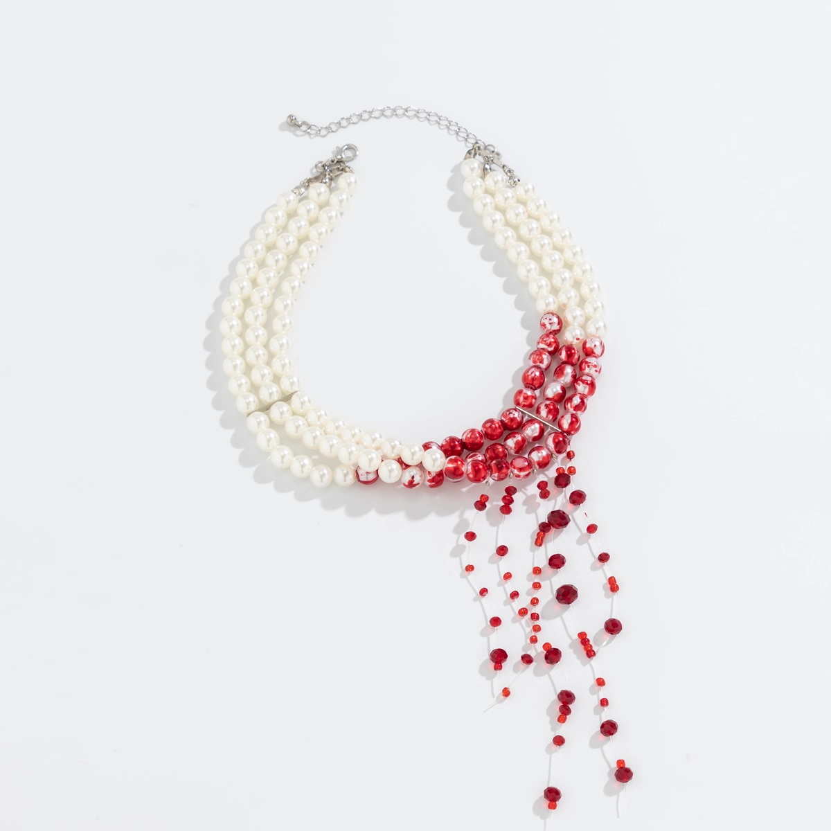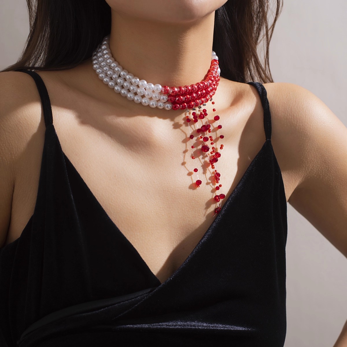 Halloween Three-Layer Imitation Pearl Tassel Crystal Necklace Gothic Style Blood Drop Cosplay Choker