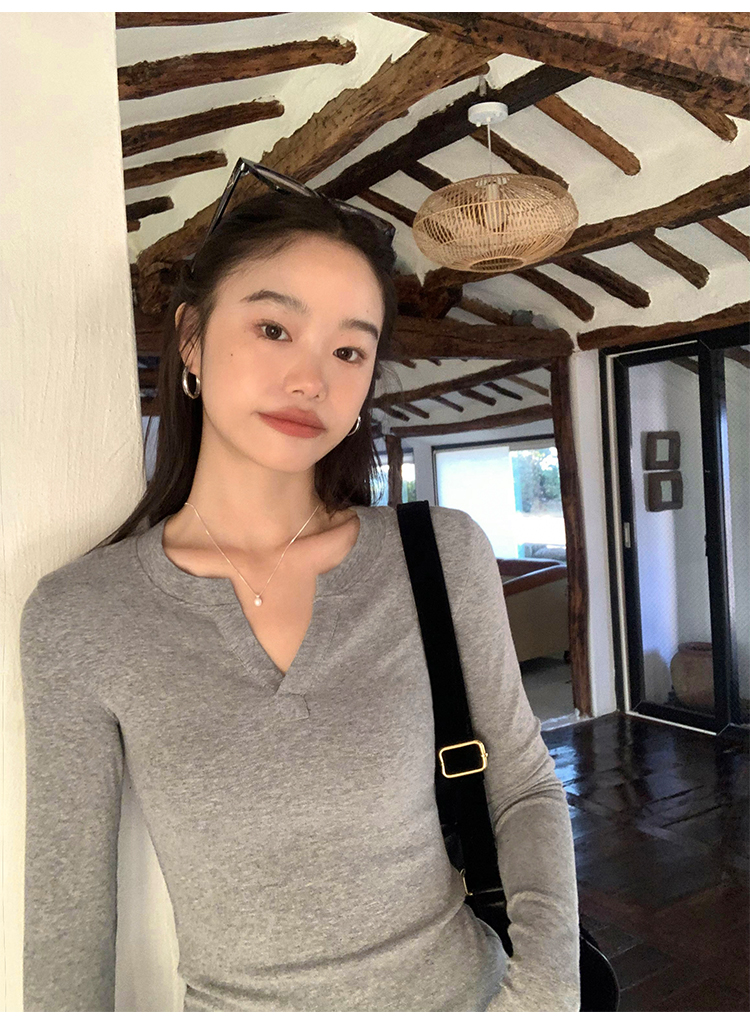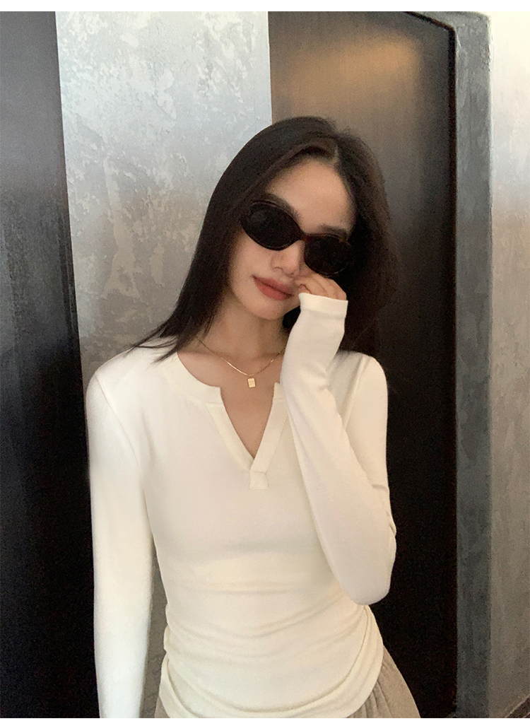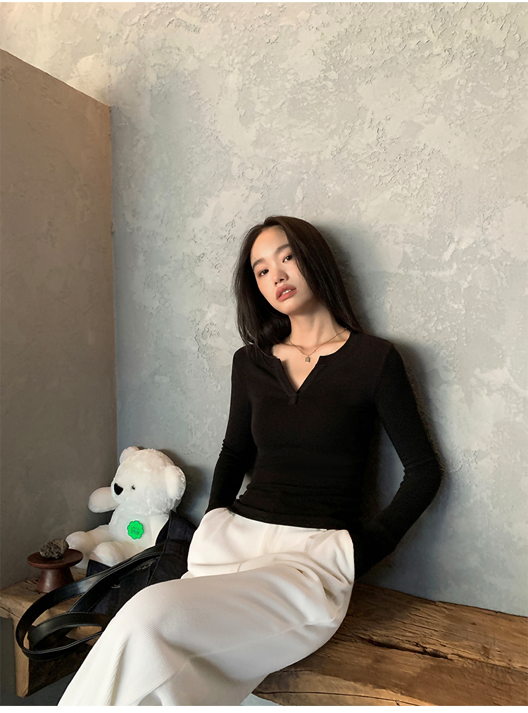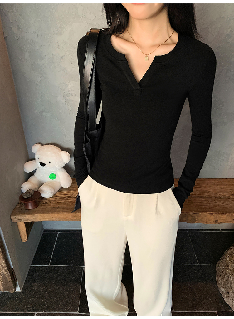 Pusumede Weekend Date Black V-Neck Long Sleeve T-Shirt Women's Inner Layer Knitted Slim Fit Top