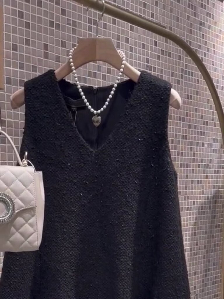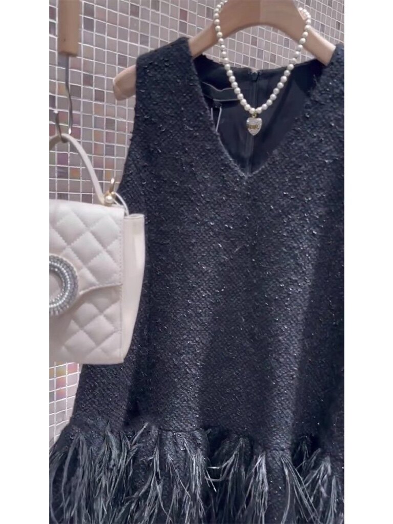 French-Style High-End Petite Black Sleeveless V-Neck Tassel Feather Dress for Women, 2025 Autumn Collection