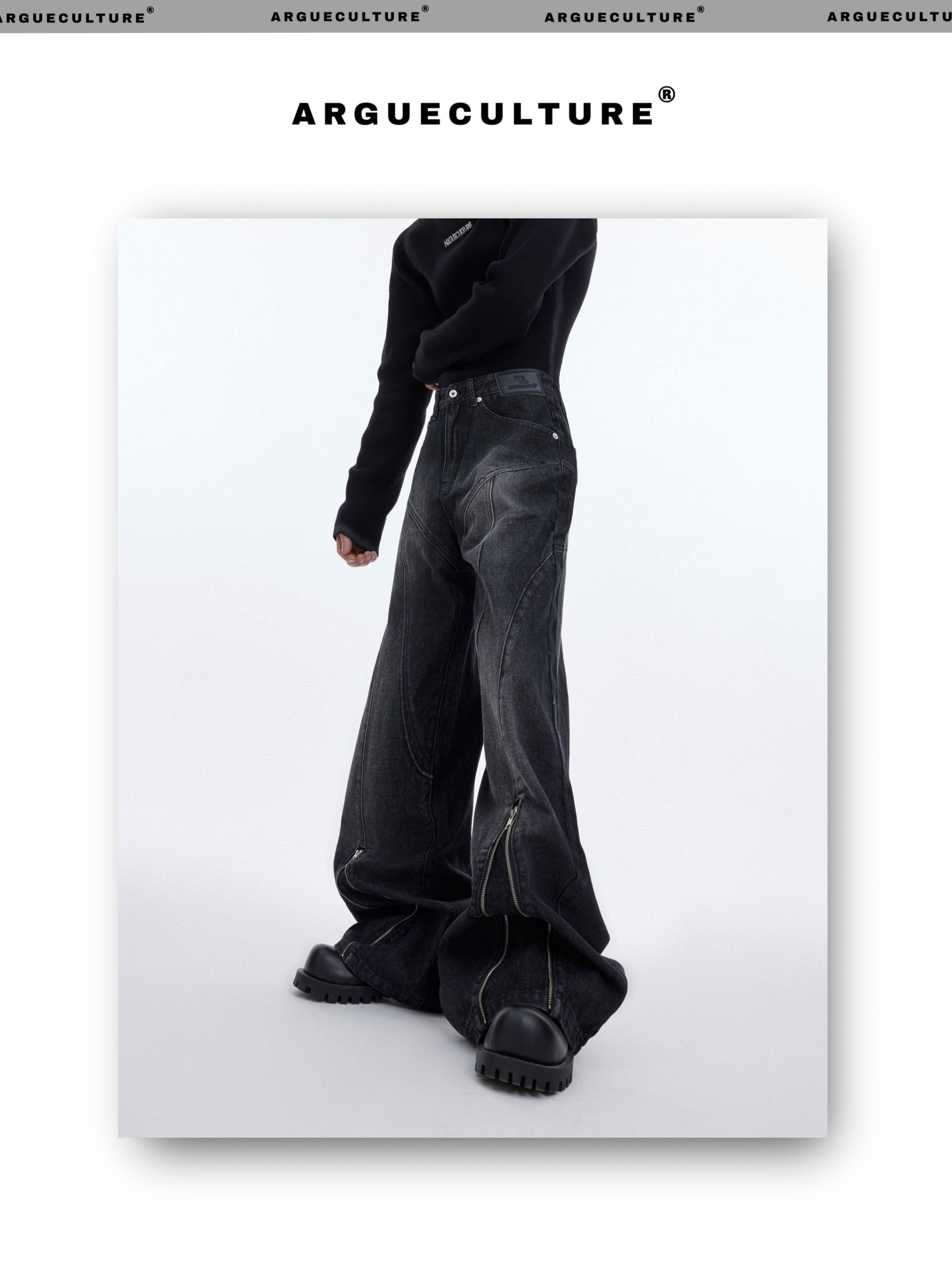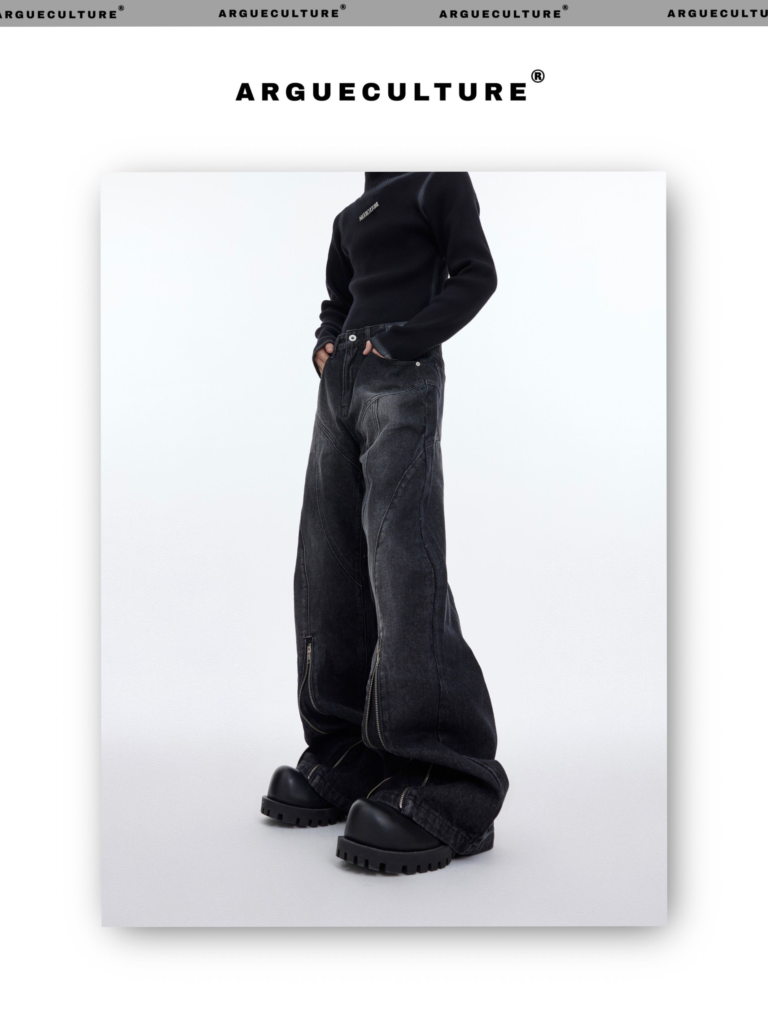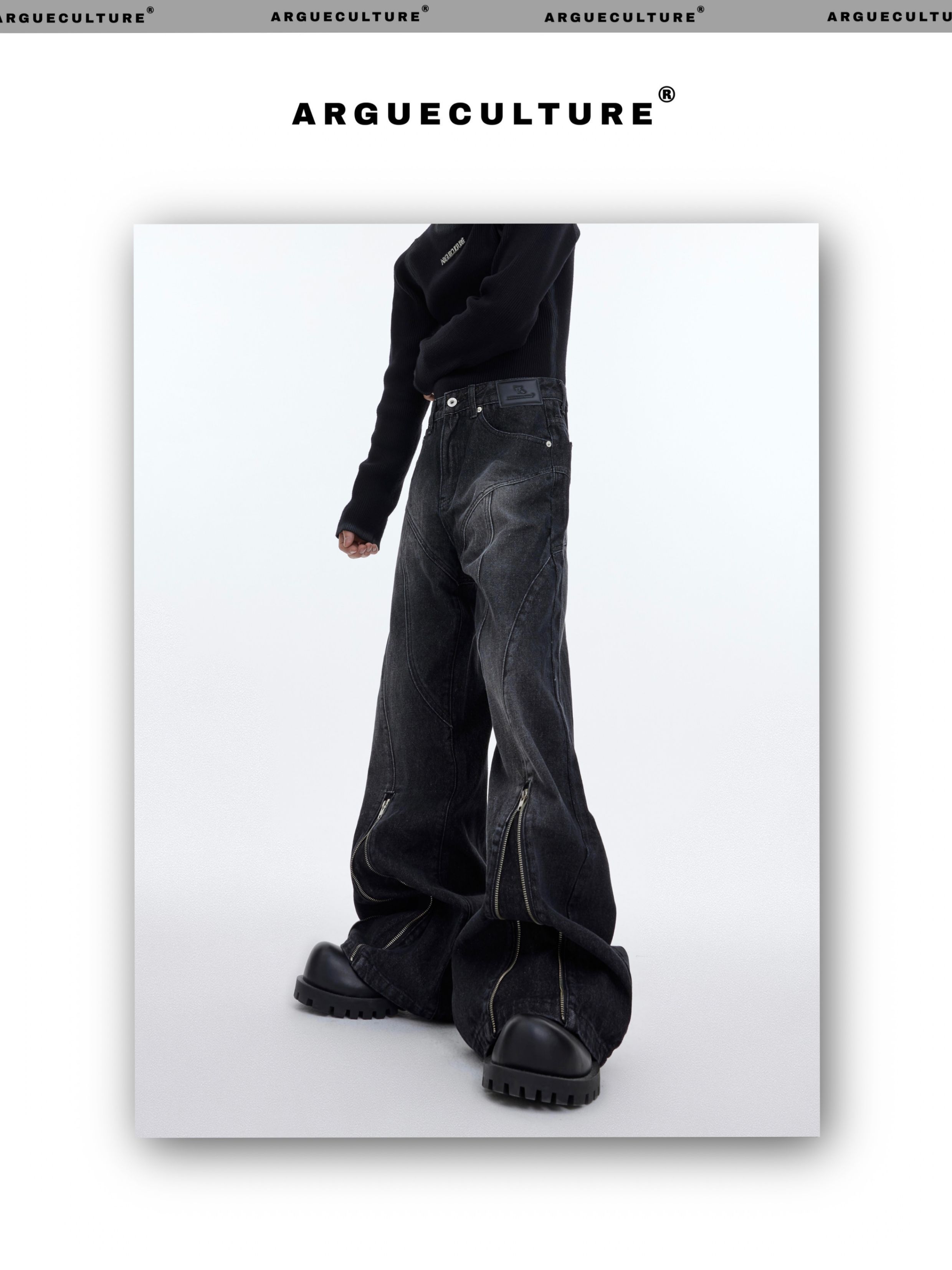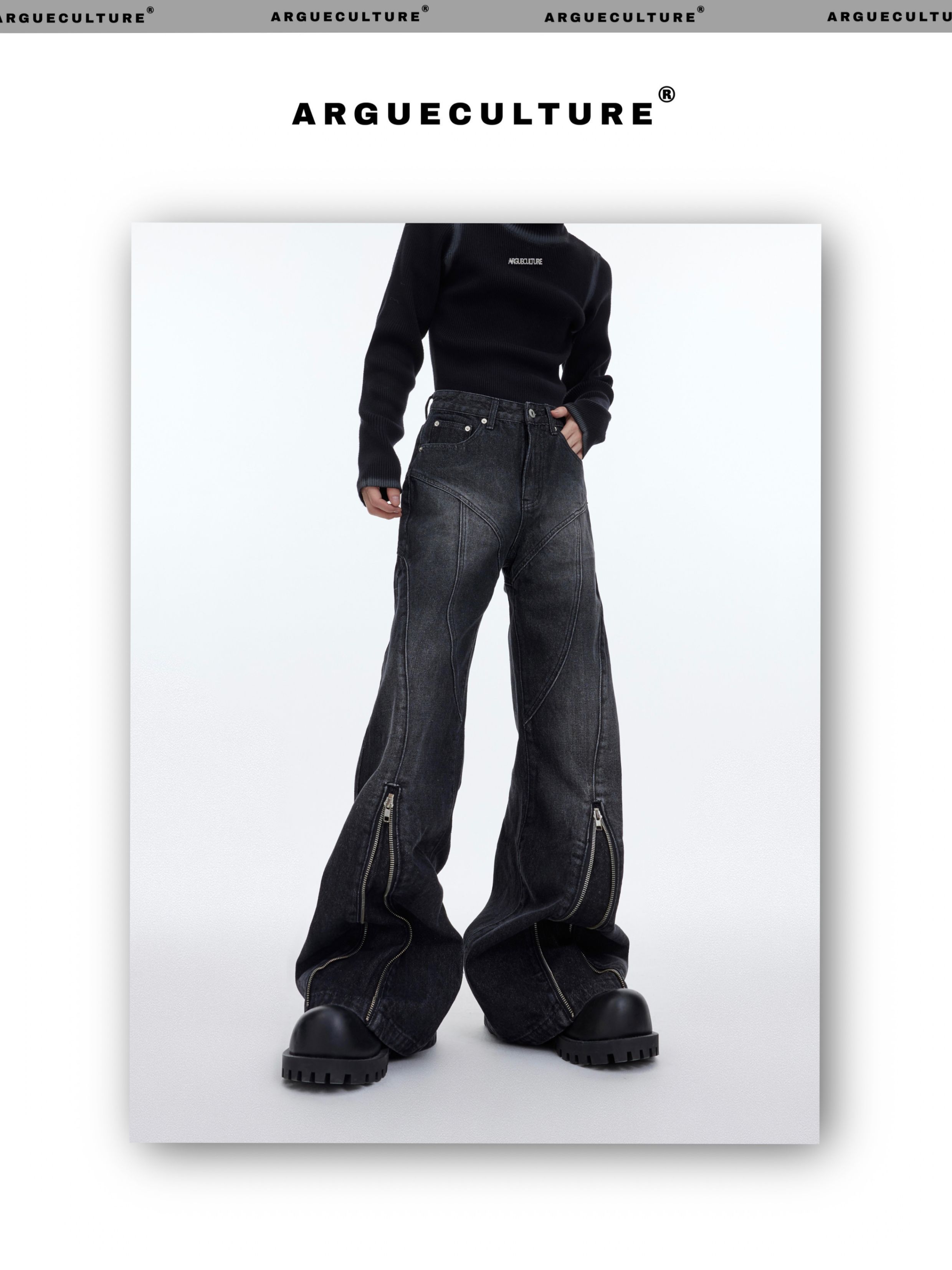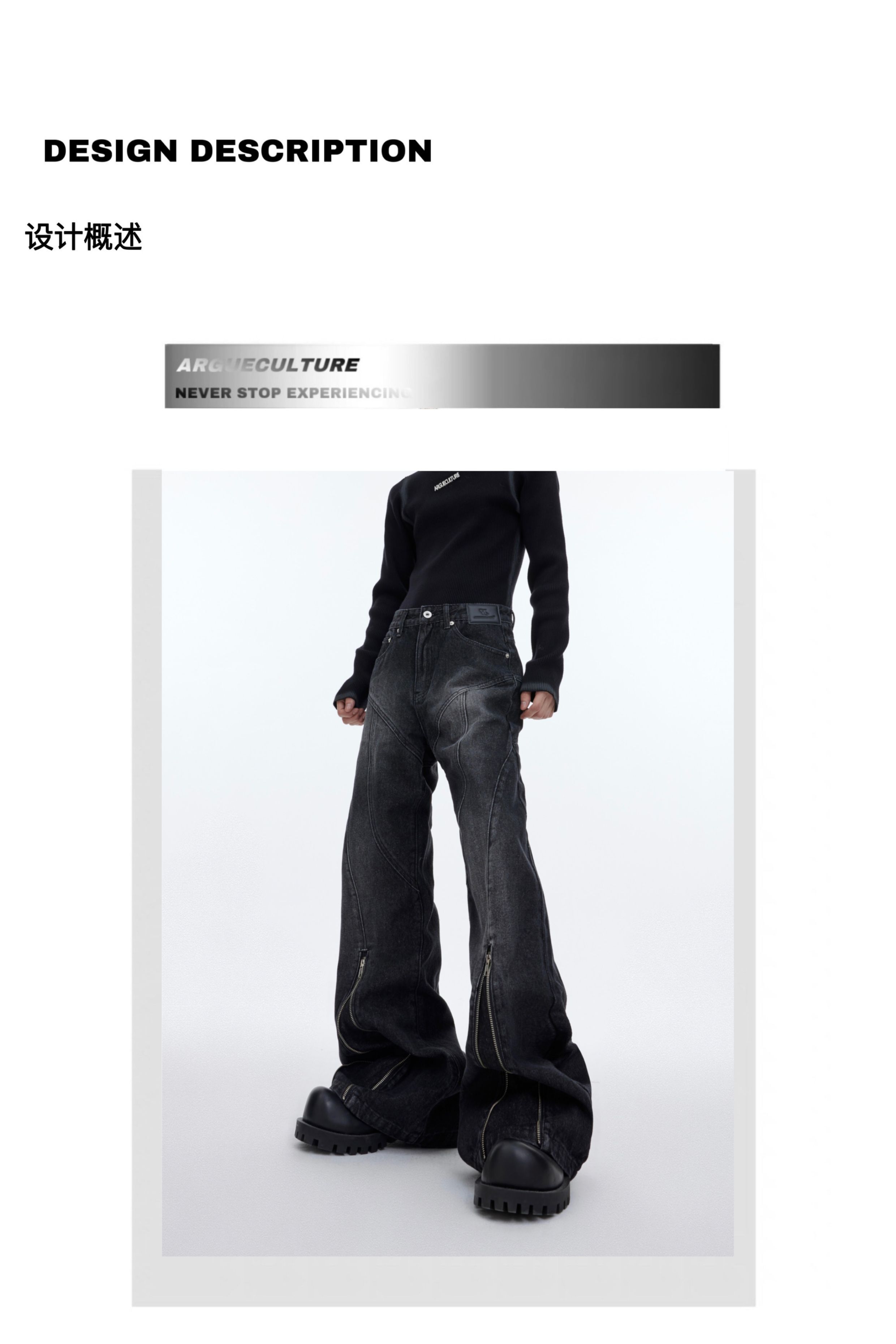 Culture Heavyweight Niche Washed Vintage Structured Line Micro-Flared Jeans with Metal Zipper Design Long Pants