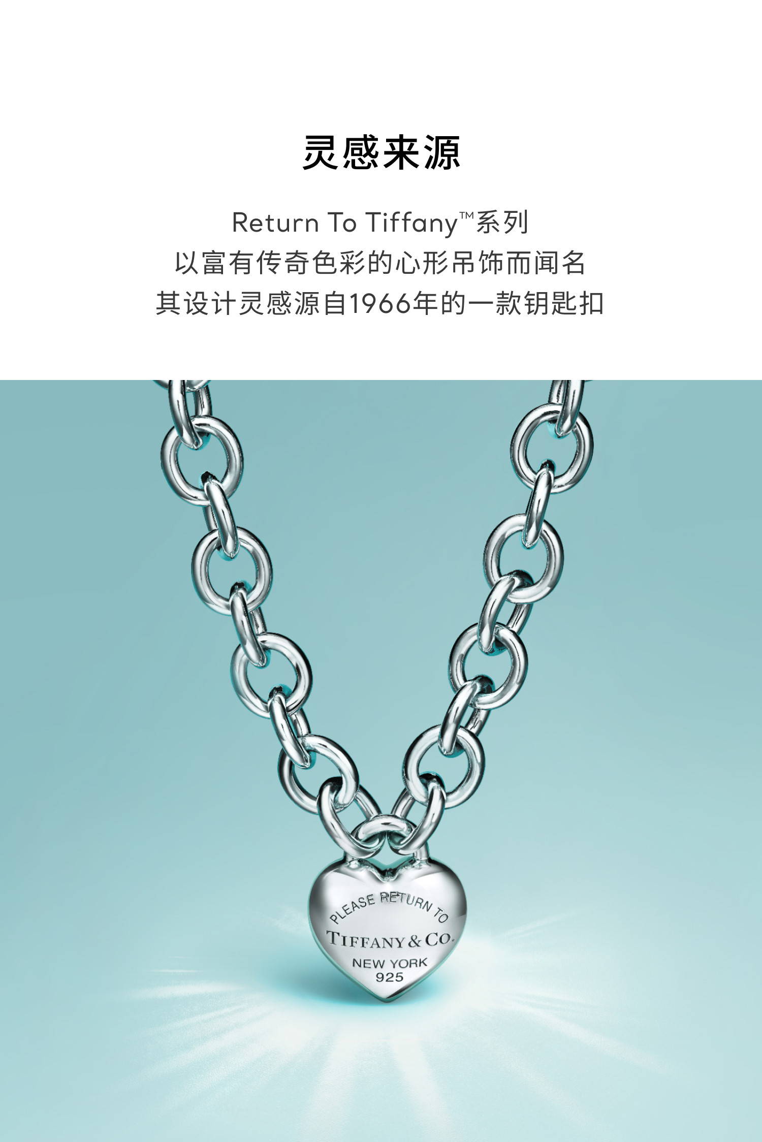 Return to Tiffany™ 系列灵感源自 1969 年问世的标志性钥匙扣,经典标志诠释蒂芙尼的卓尔不凡。简约的项链设计配以精致镌刻的双心形吊饰项链,散发精致优雅气息。