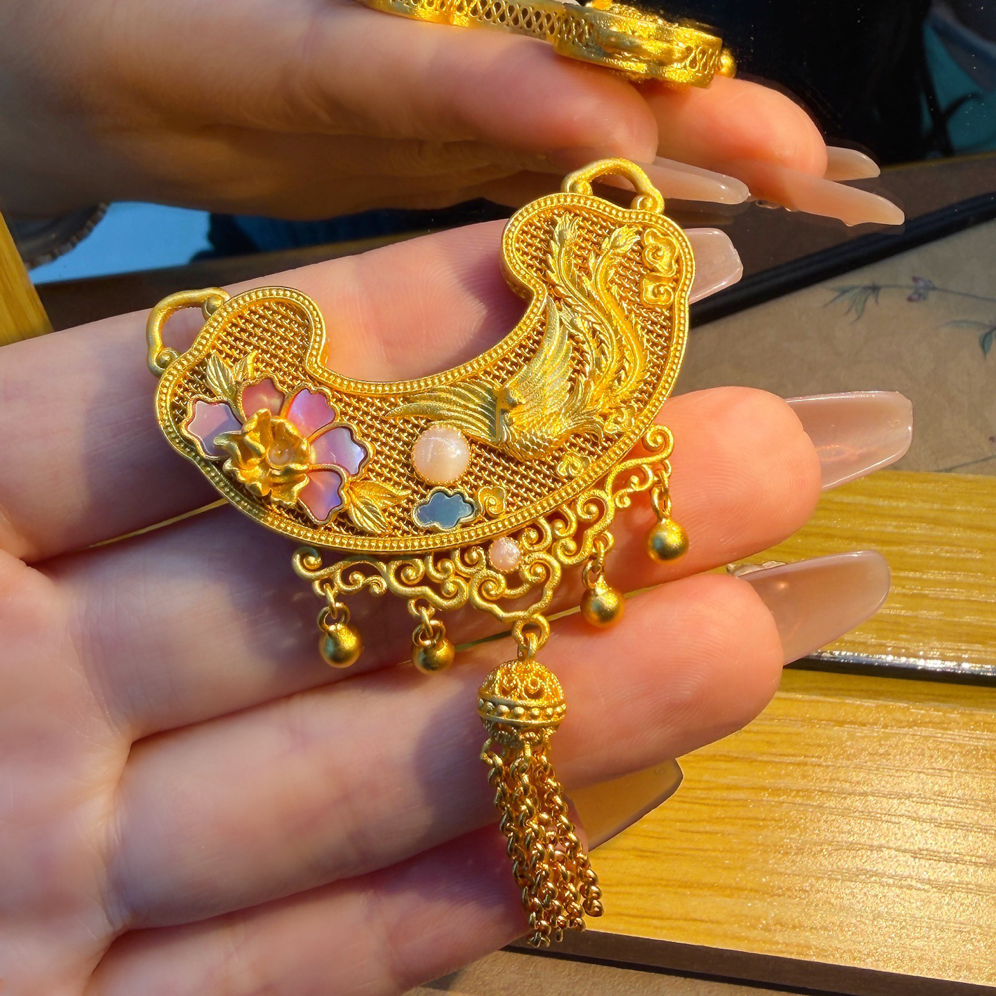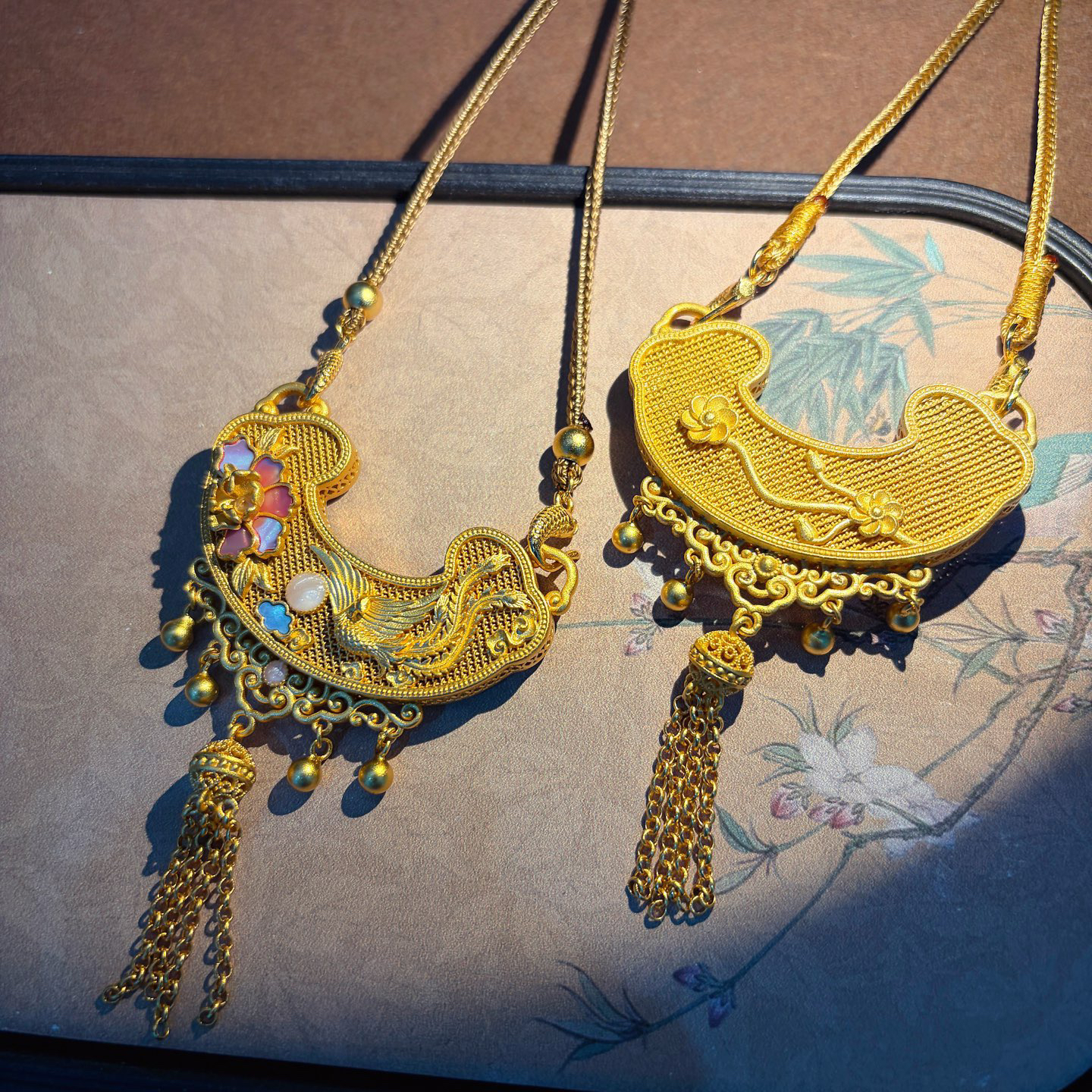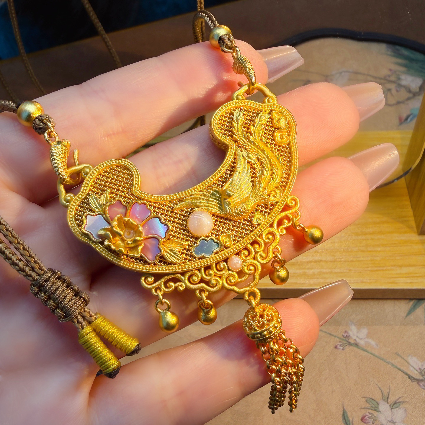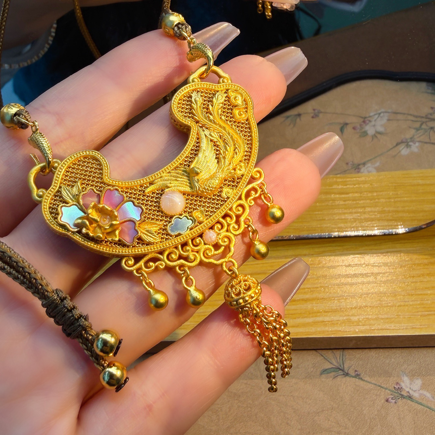 Phoenix Peony Pisces Electroplated Gold Pendant Pure Silver 999 New Chinese Style Mother-Of-Pearl Tassel Women's Lock Bag Pendant Necklace Set