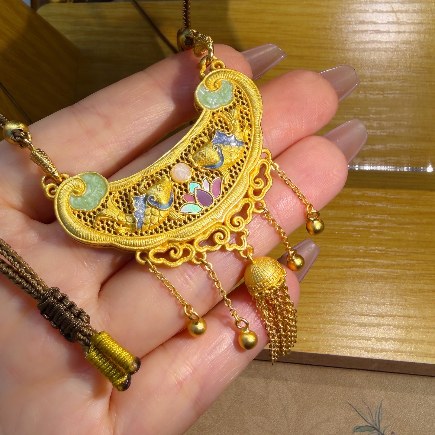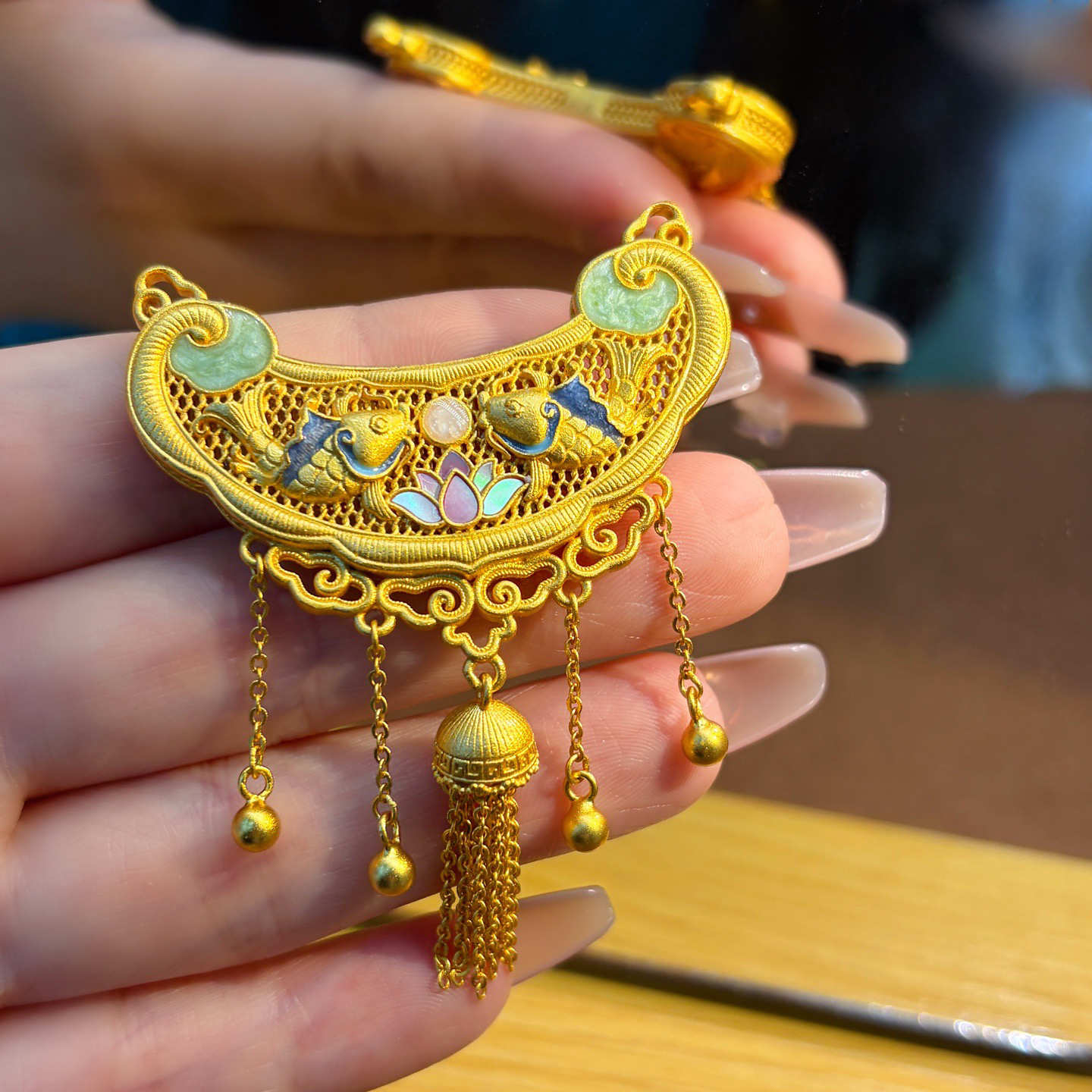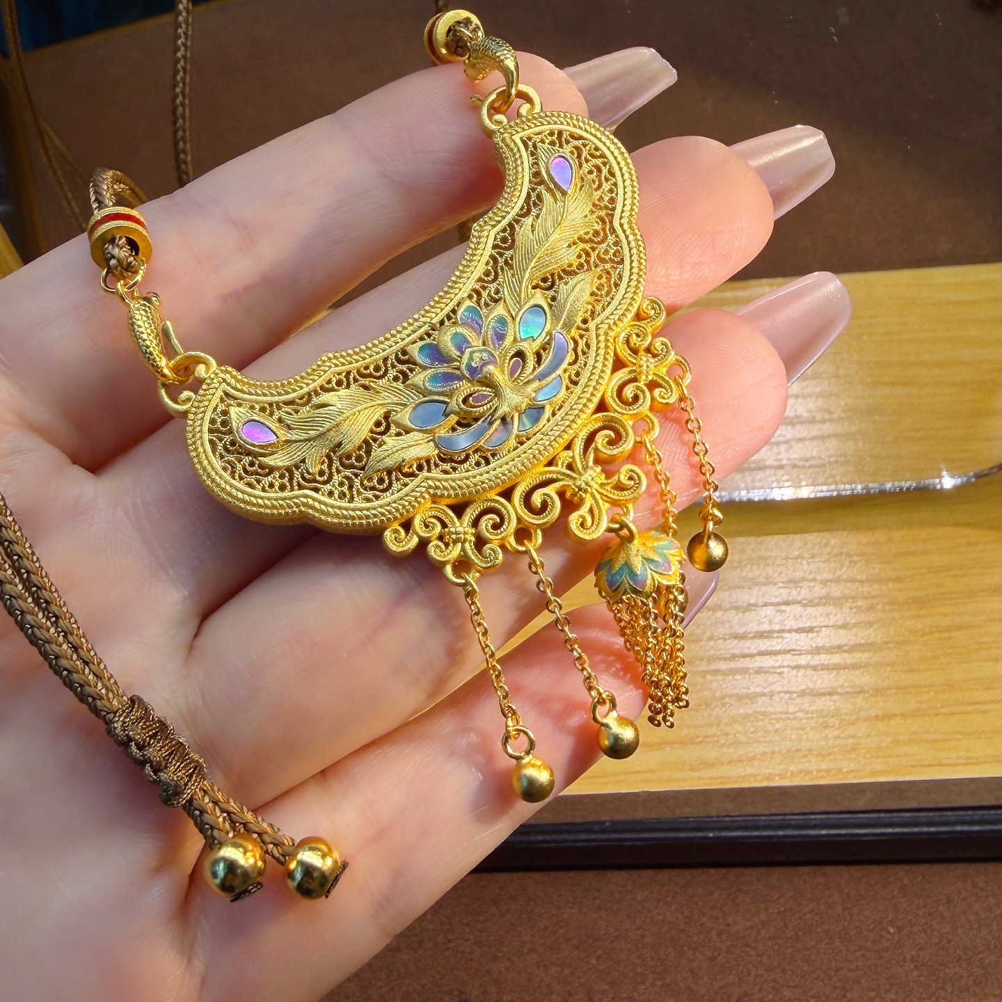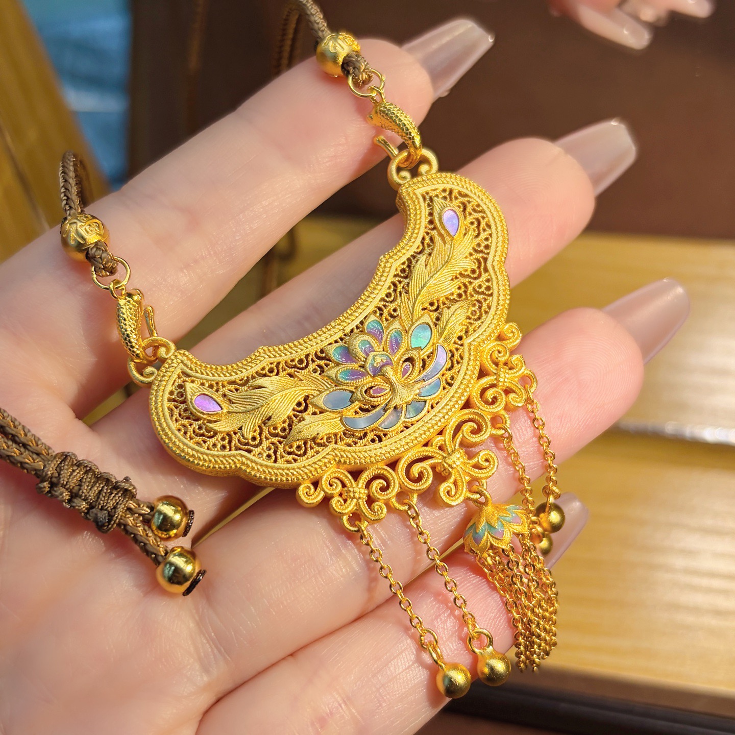 Phoenix Peony Pisces Electroplated Gold Pendant Pure Silver 999 New Chinese Style Mother-Of-Pearl Tassel Women's Lock Bag Pendant Necklace Set
