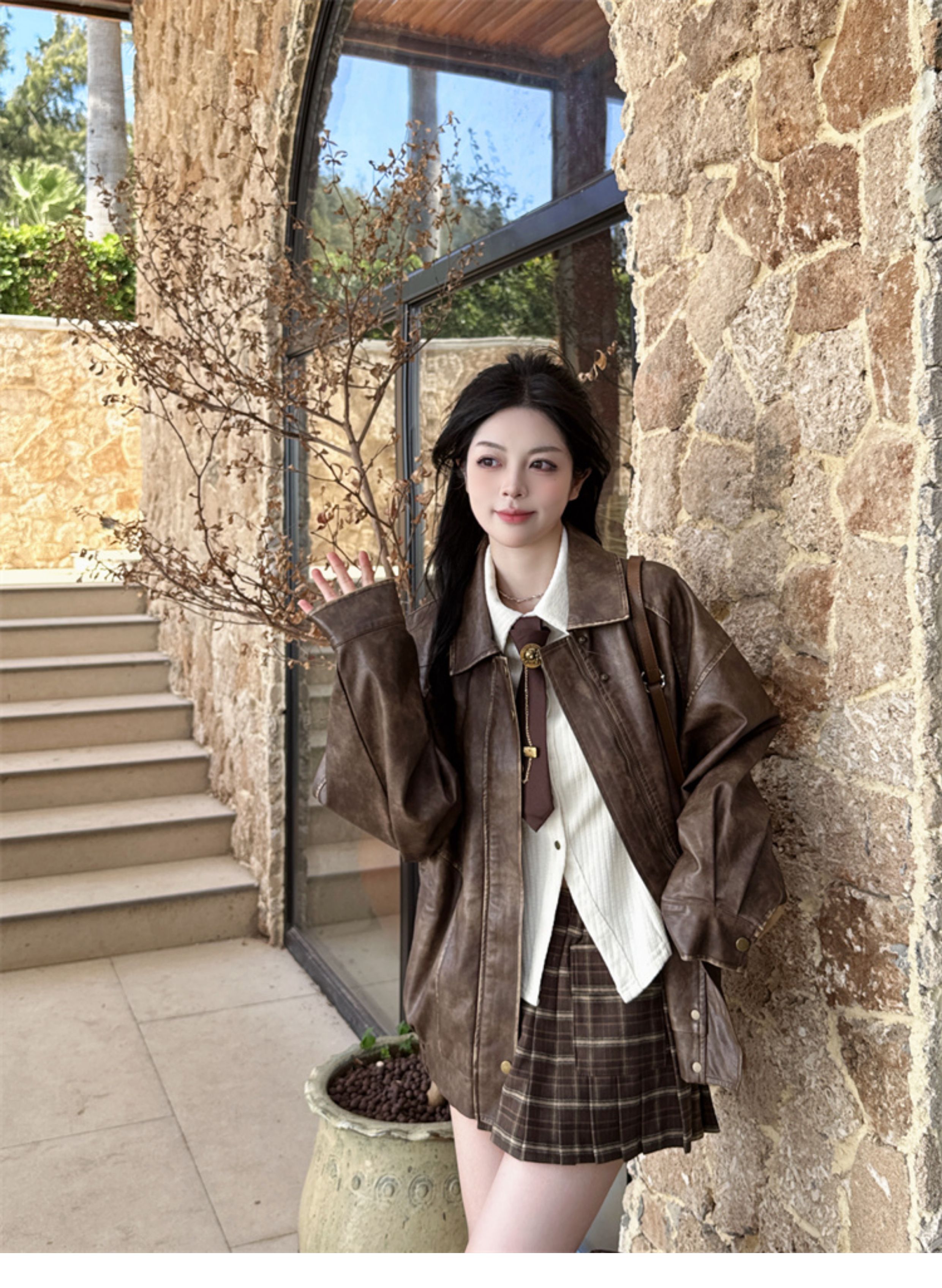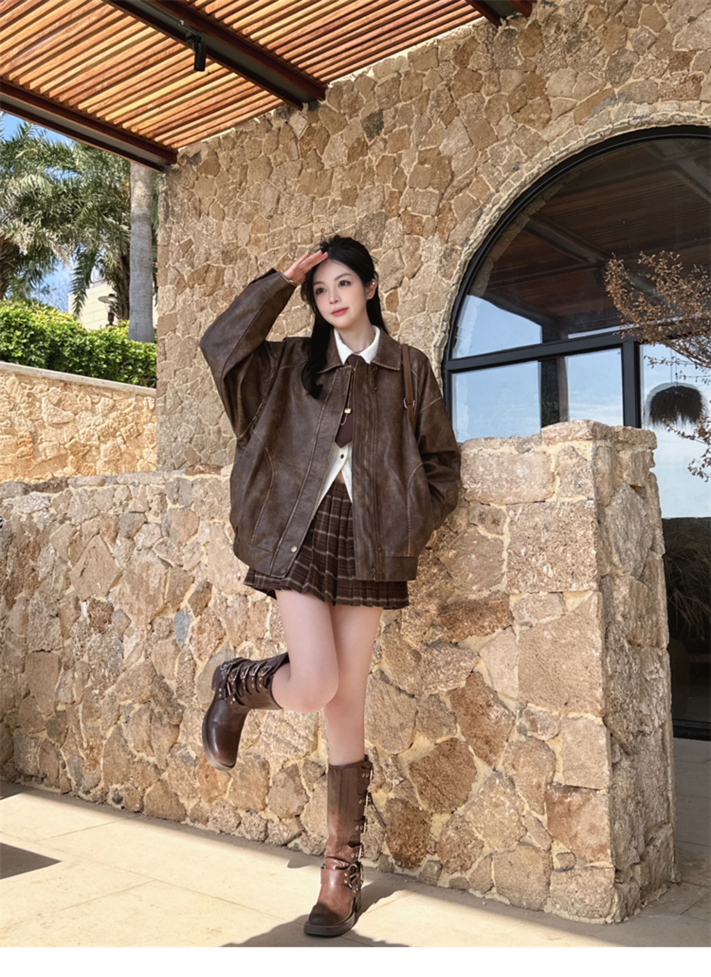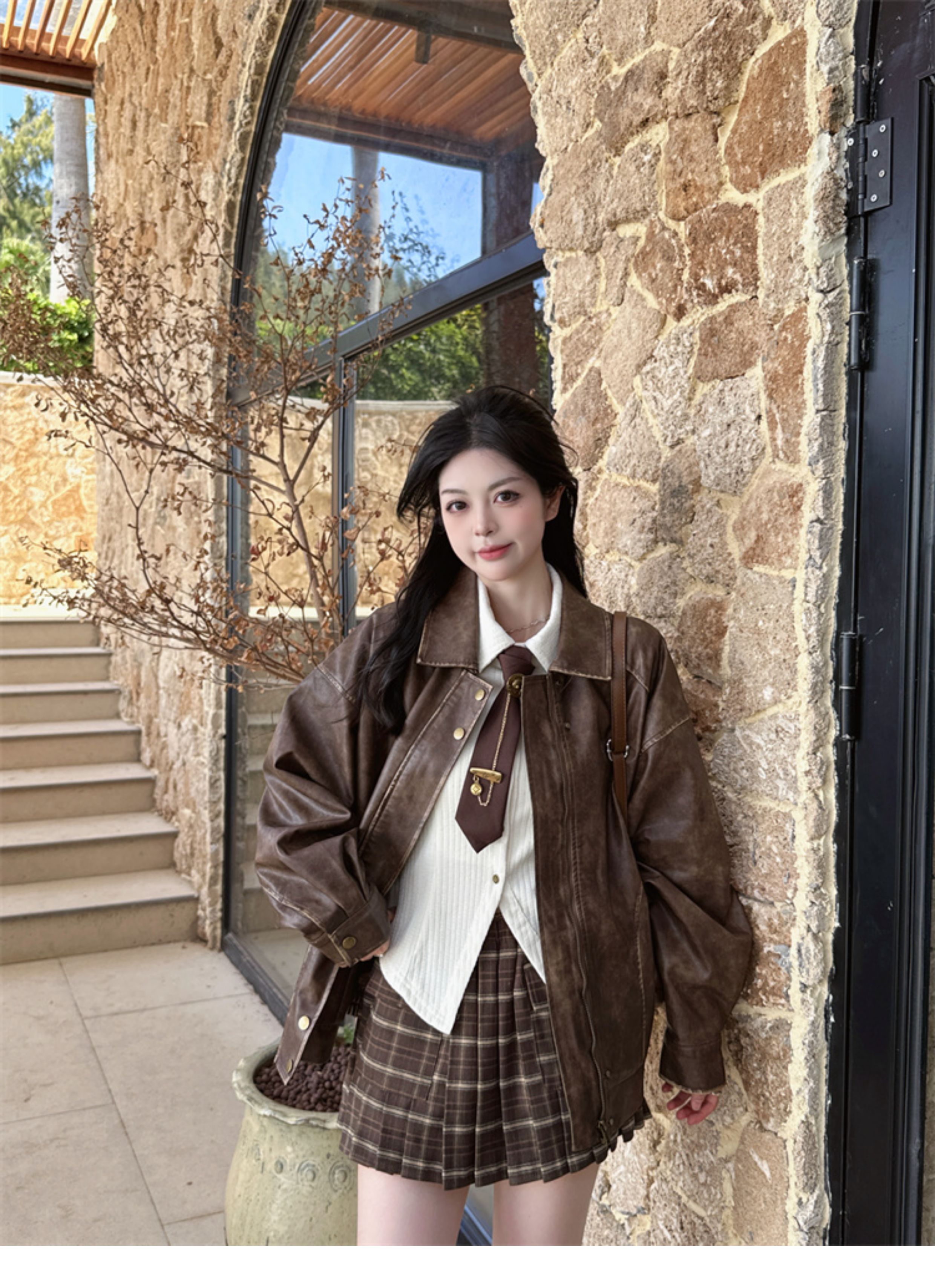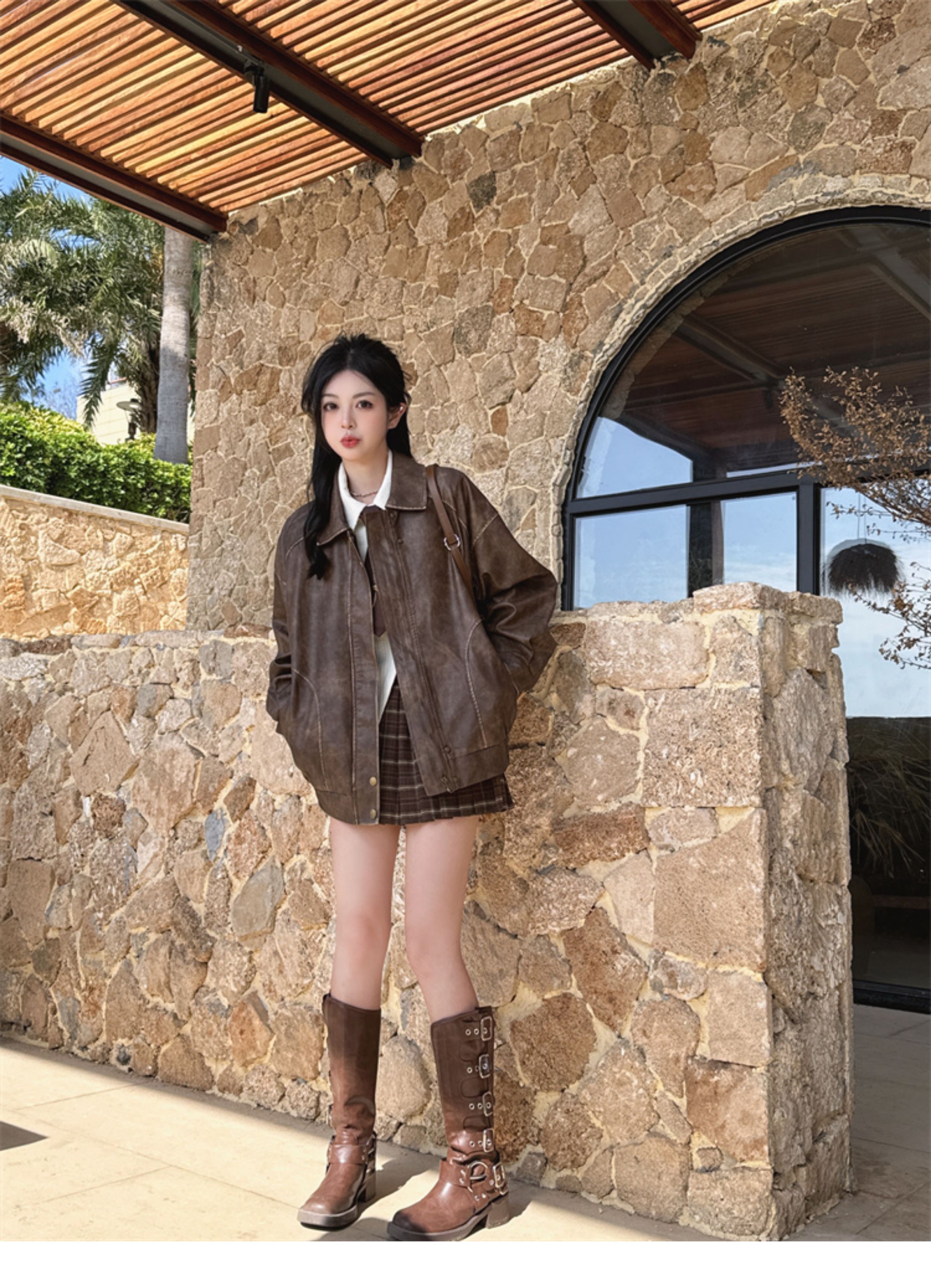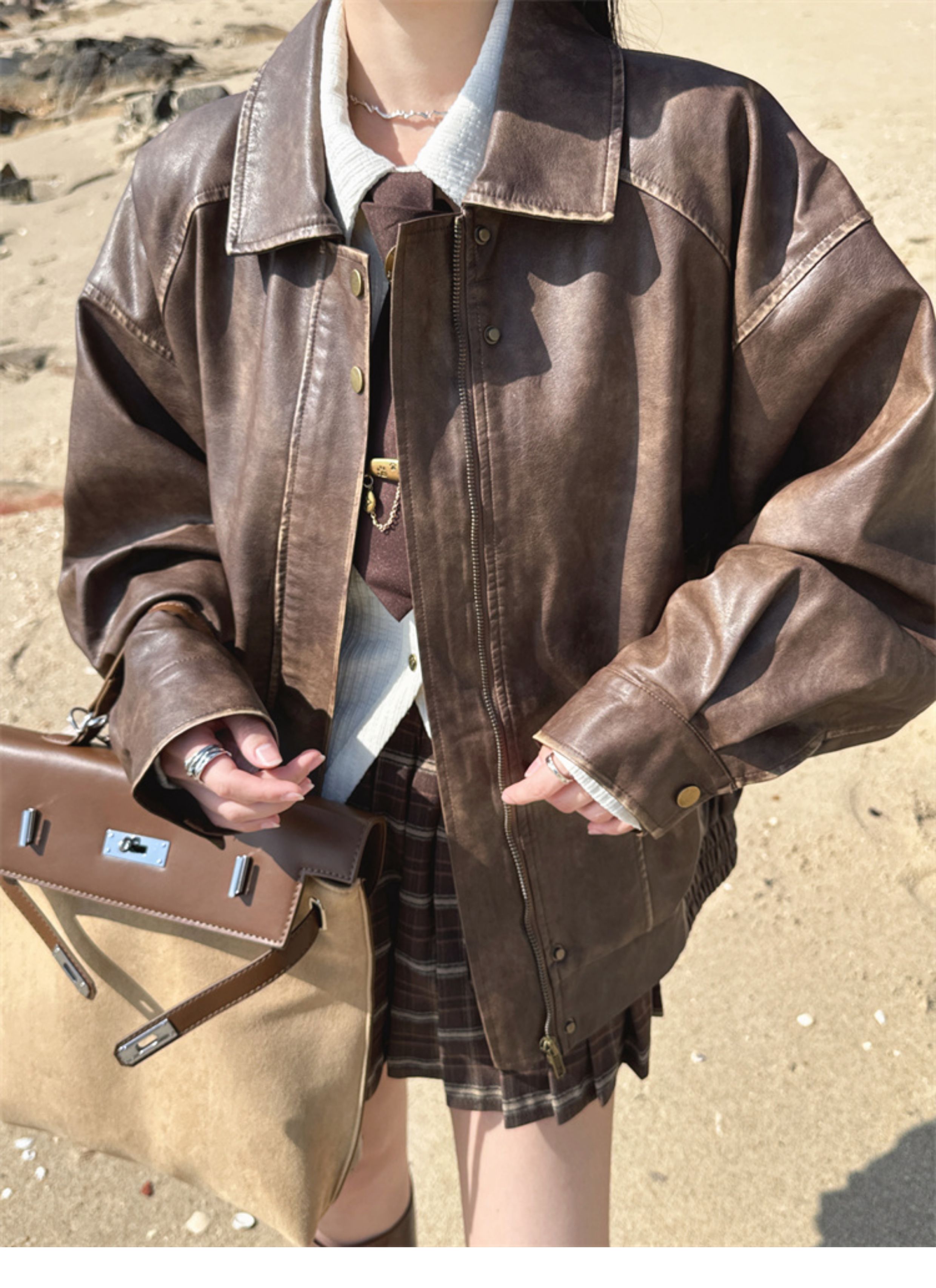 Brown Leather Jacket for Women, Spring and Autumn 2025 New Style, Pu Leather Jacket, American Retro Cool Style, Same Style as Zhong Chuxi
