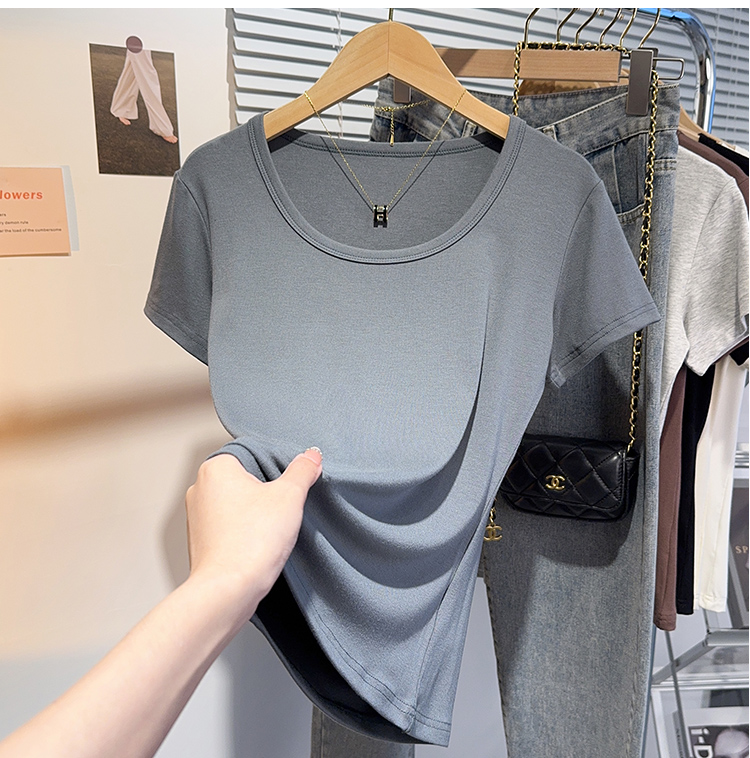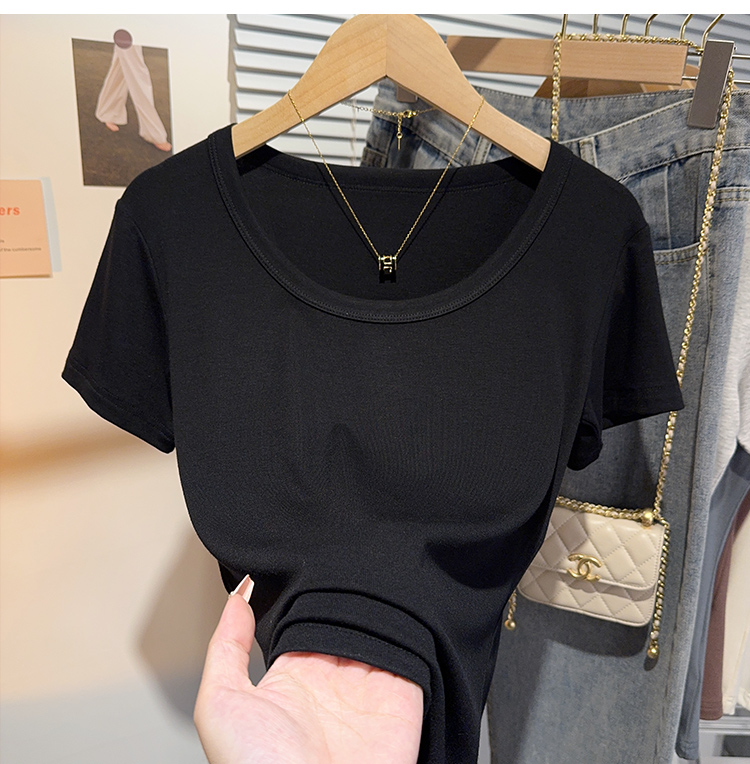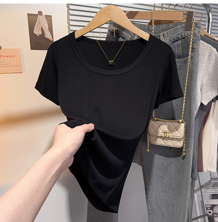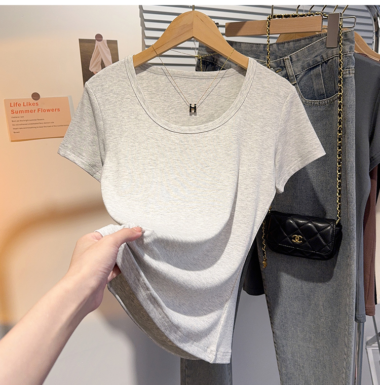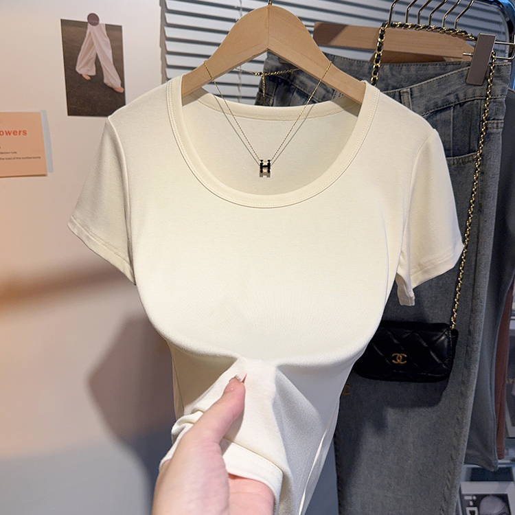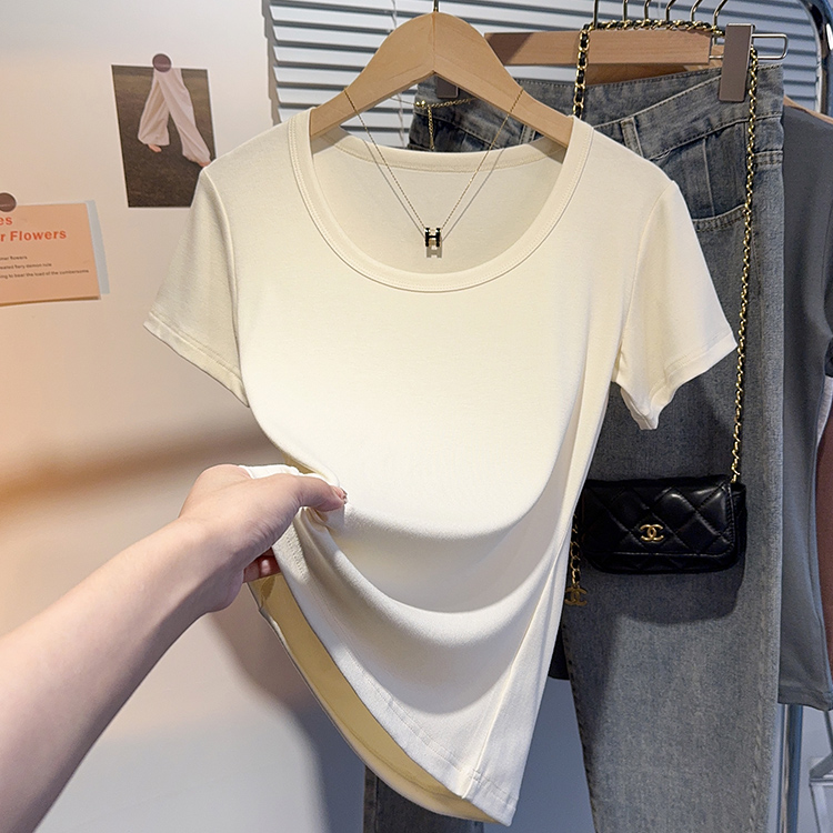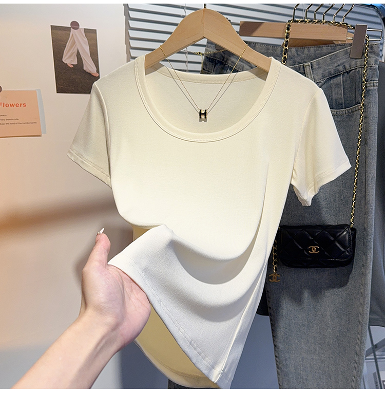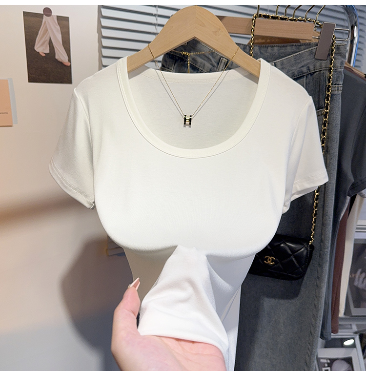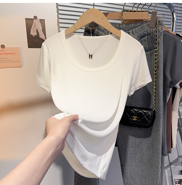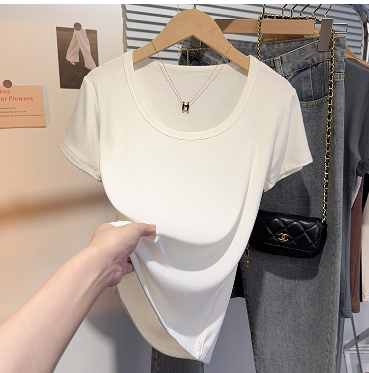 Right-Shoulder Slim-Fit Short-Sleeve U-Neck T-Shirt for Women, 2025 Summer New Style, Large-Neck Small Top, Basic Style, Petite White Top