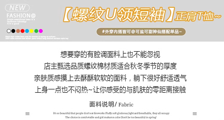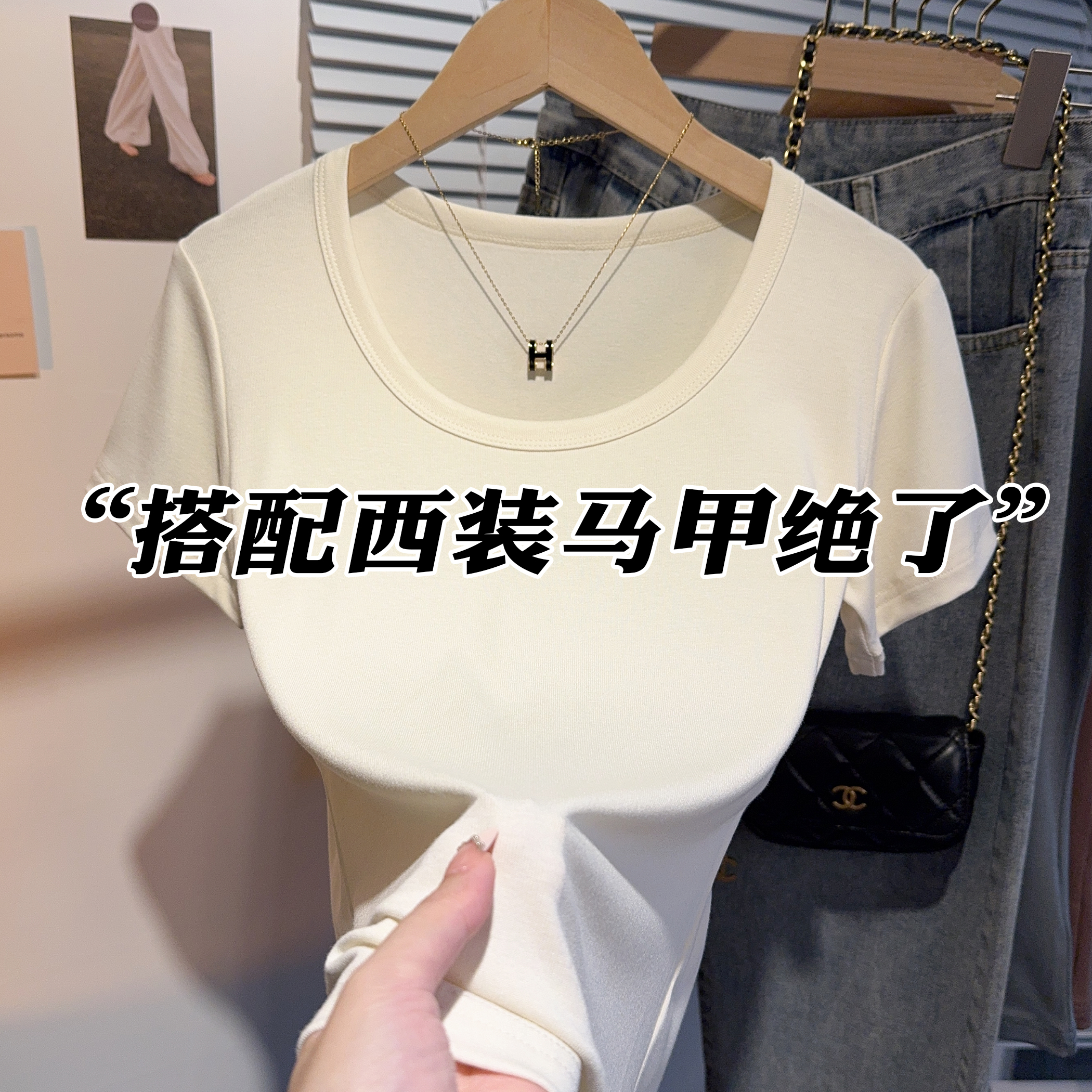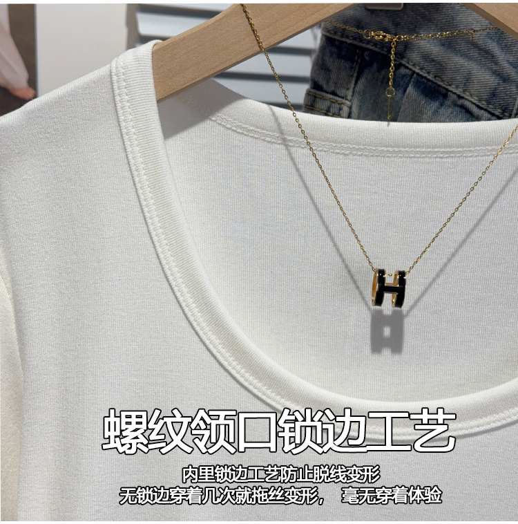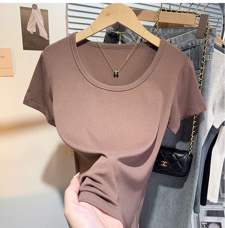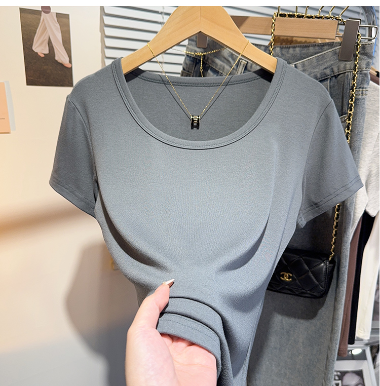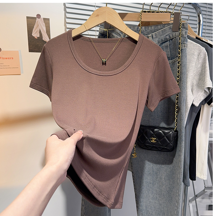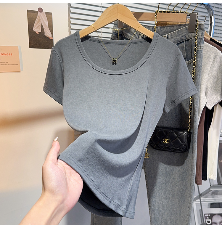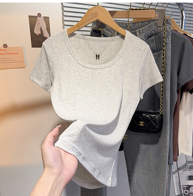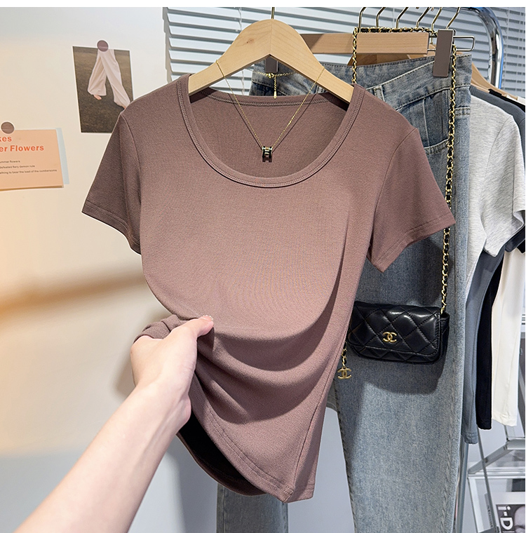 Right-Shoulder Slim-Fit Short-Sleeve U-Neck T-Shirt for Women, 2025 Summer New Style, Large-Neck Small Top, Basic Style, Petite White Top