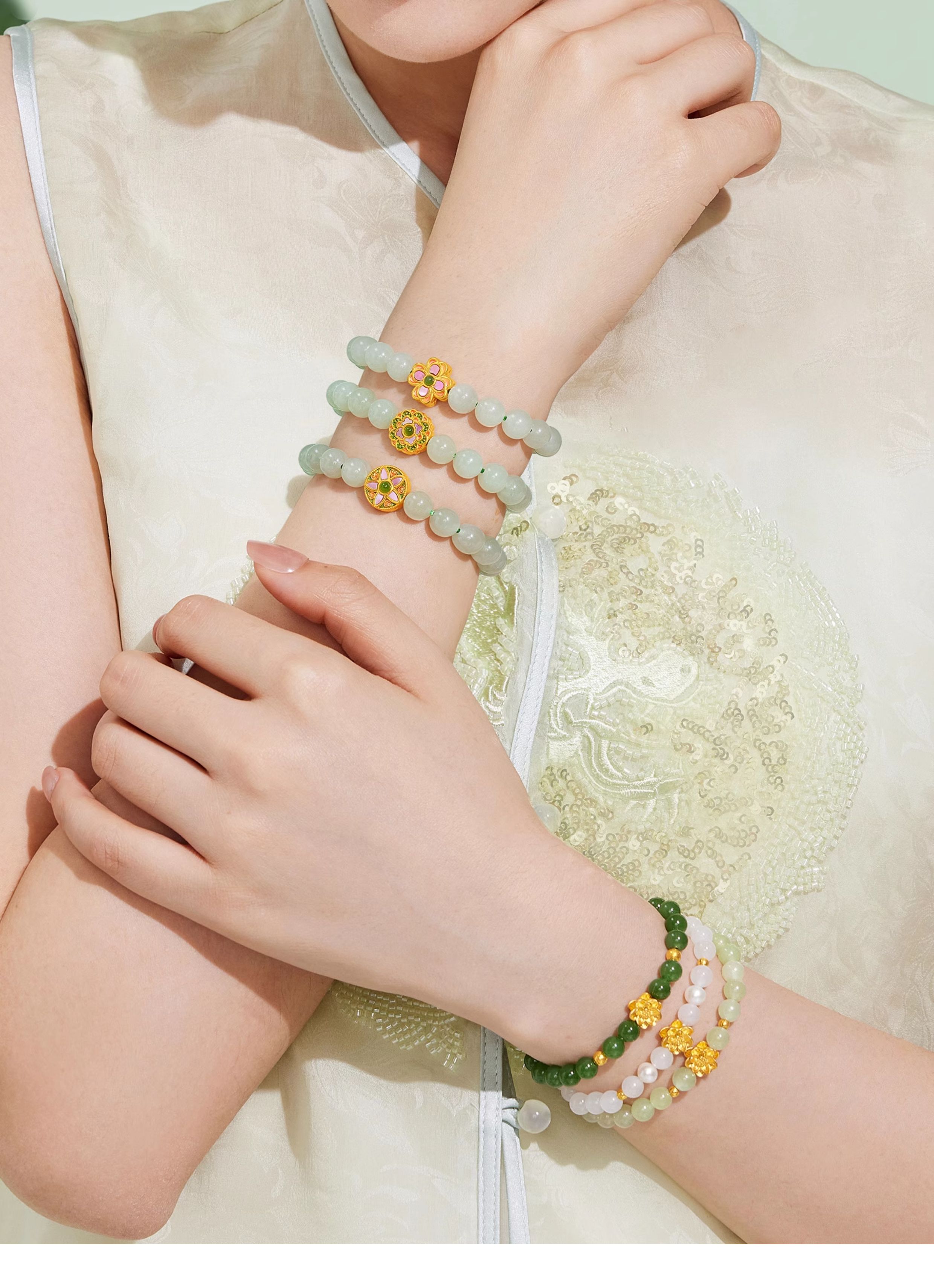 Liu Fu Jewelry Hundred Flowers Blessing Lotus Gold Bracelet Fortune Bead 6mm Hetian Jade Bracelet G31Tba1B0011