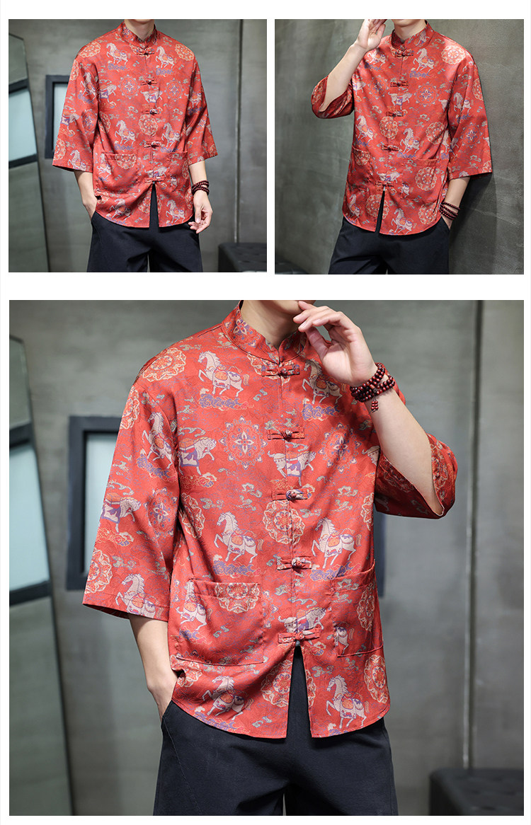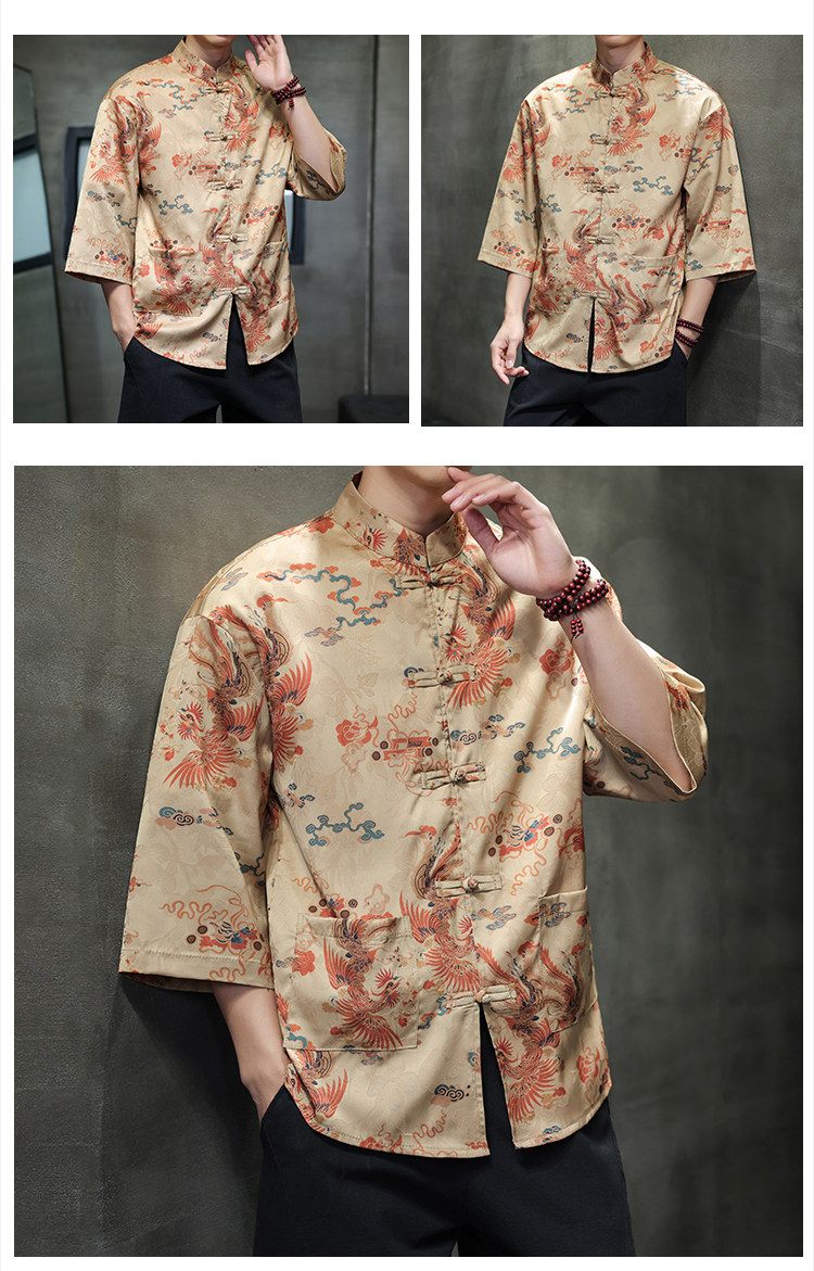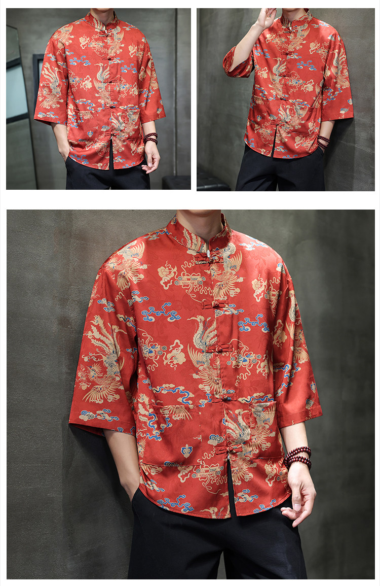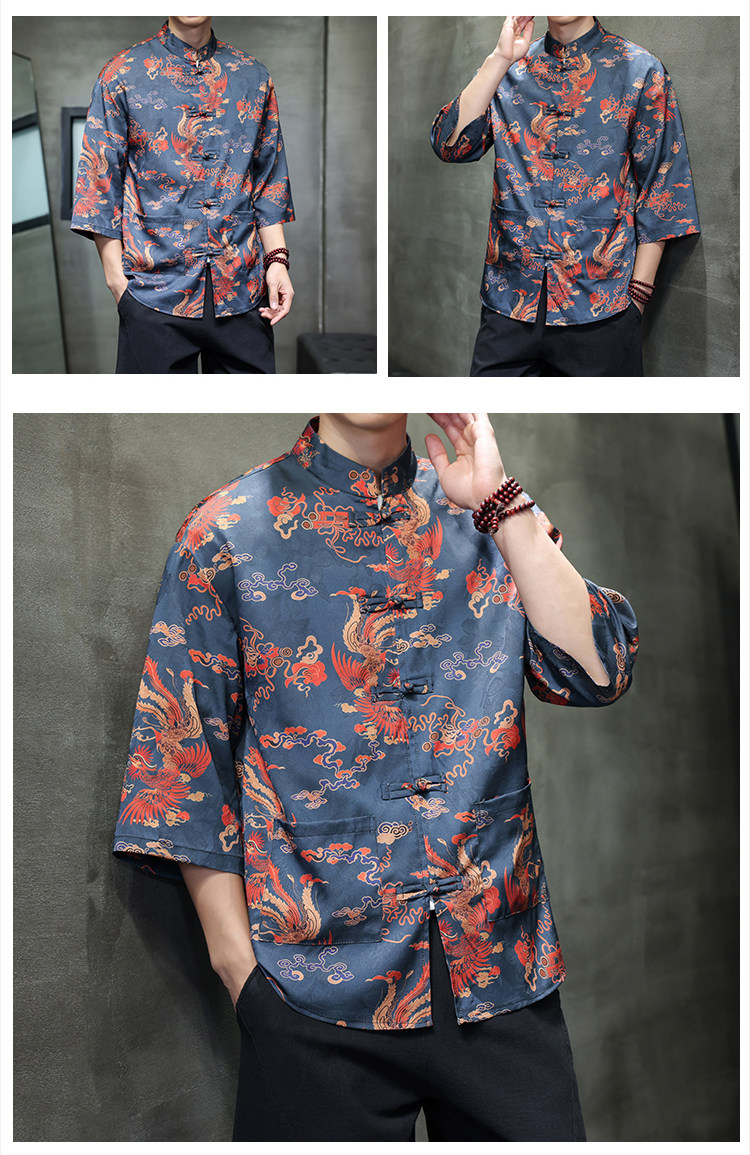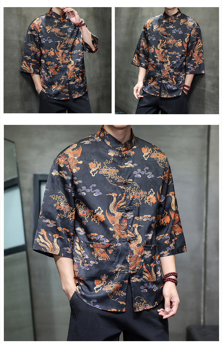 Chinese Style Tang Suit Men's Retro Hanfu Men's Short-Sleeved Shirt with Button Placket New Chinese Style Three-Quarter Sleeve Floral Shirt Jacket