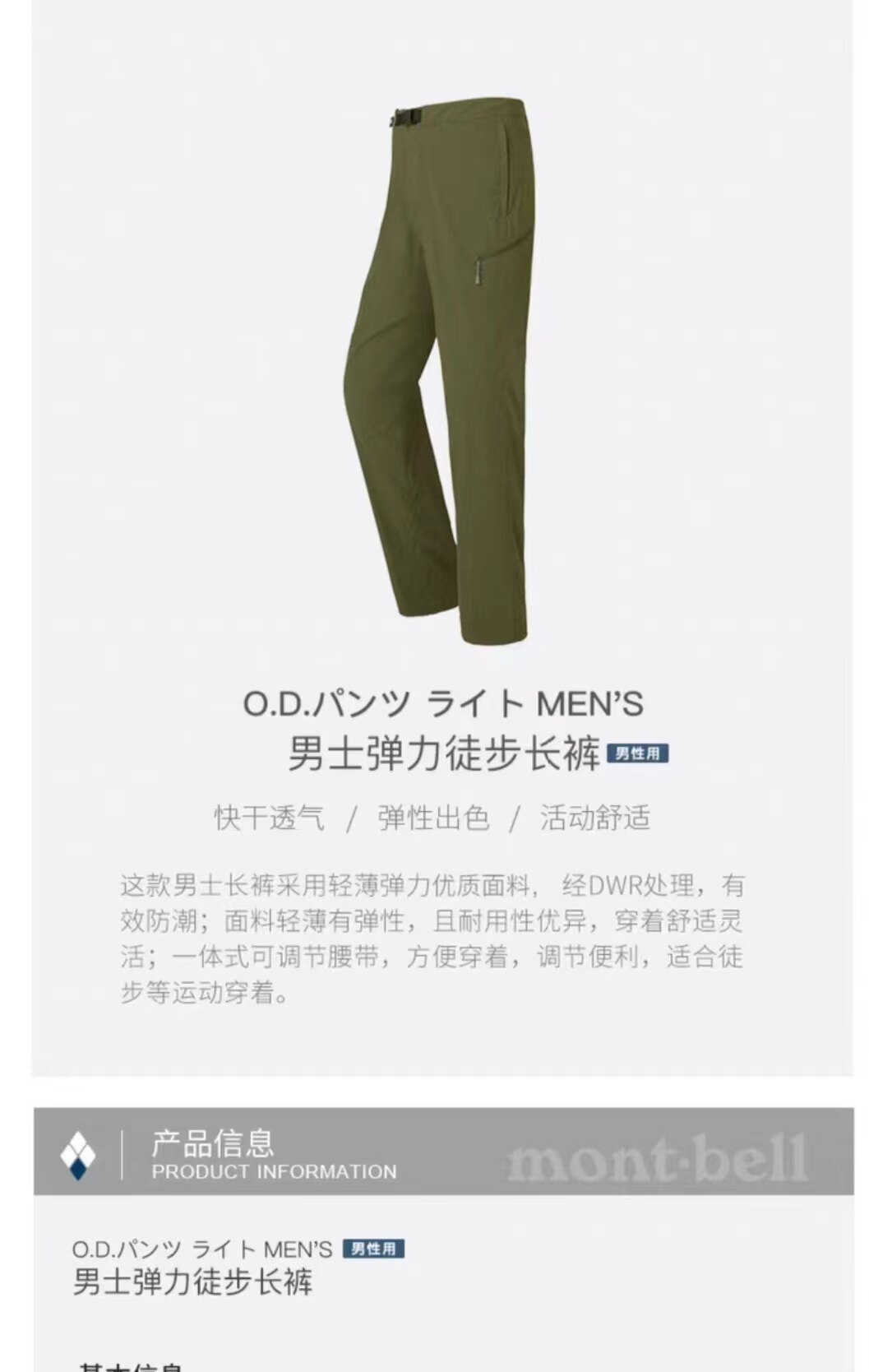 Montbell New Men's Summer Ultra-Light Elastic Outdoor Sports Camping Od Quick-Drying Pants 1105661