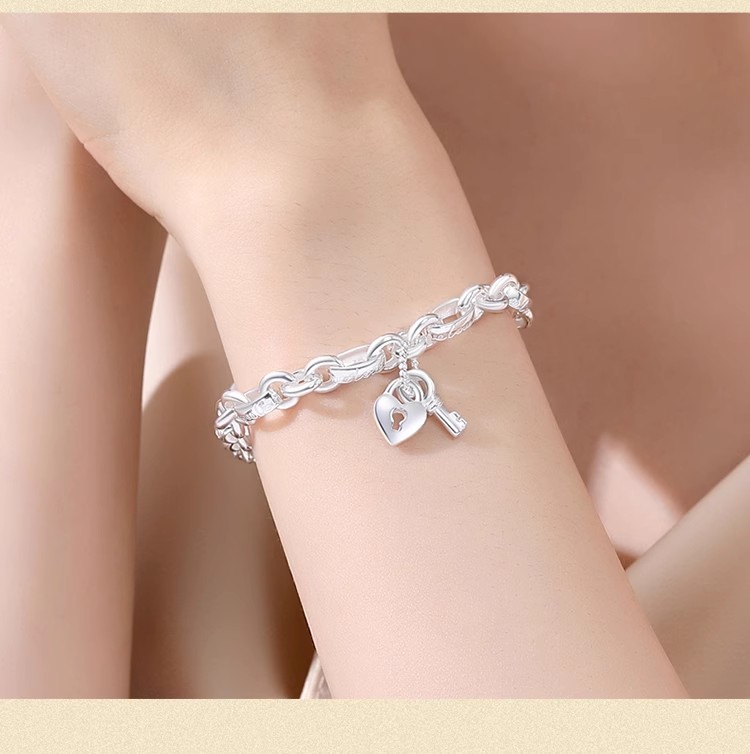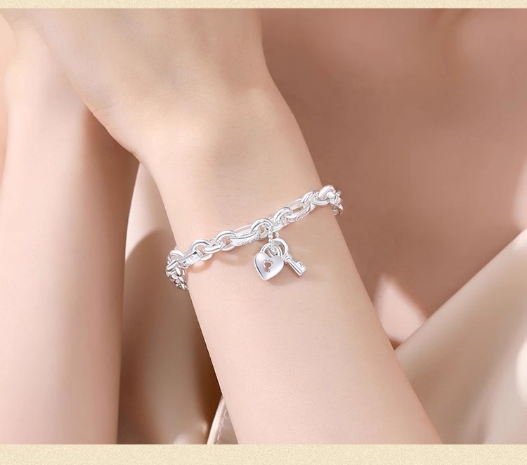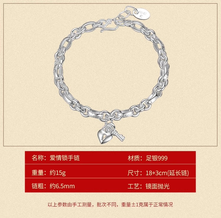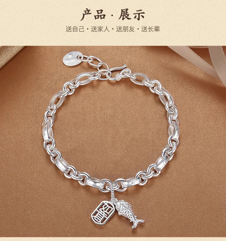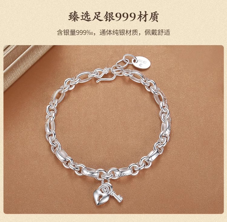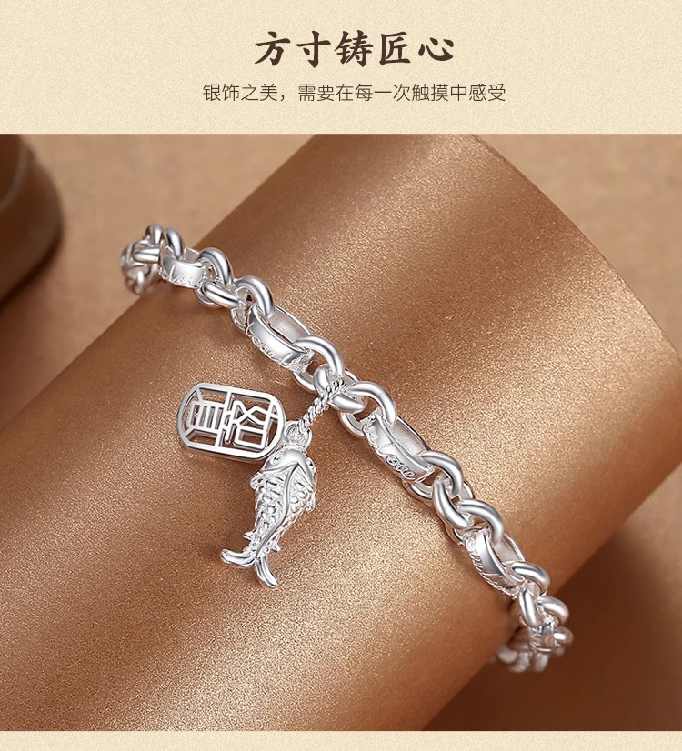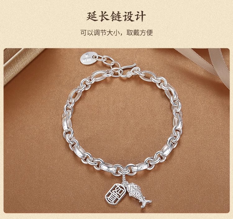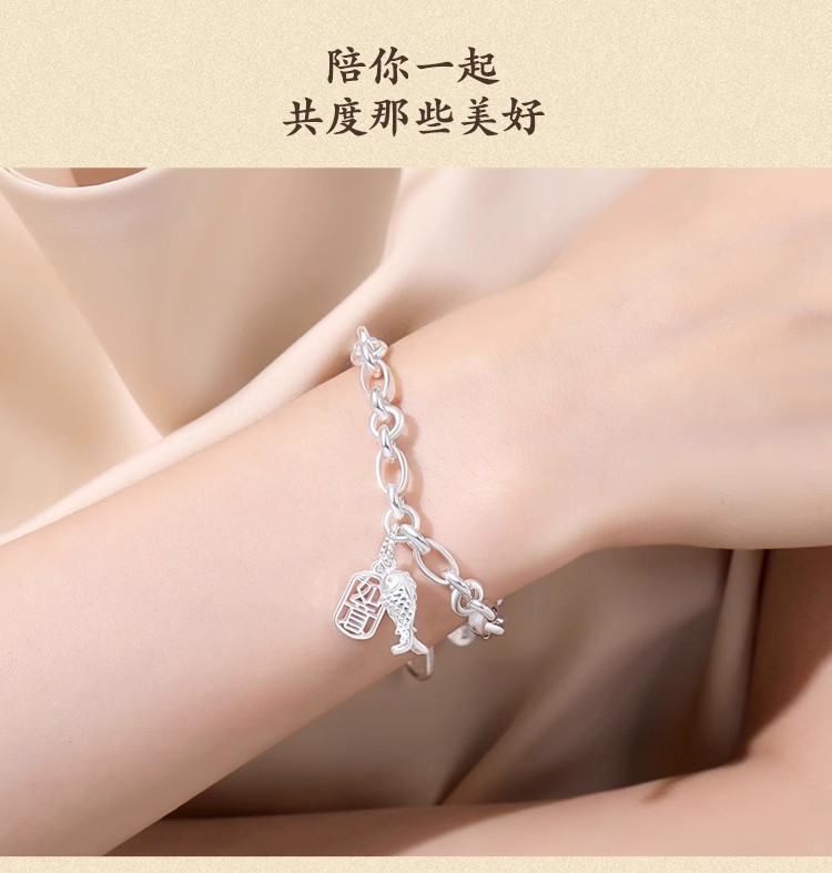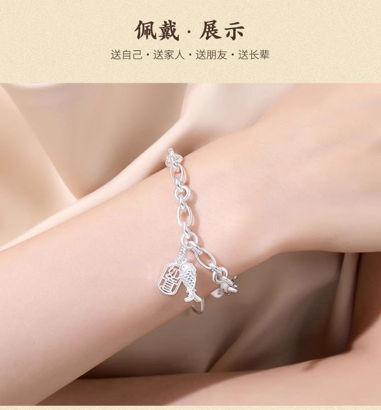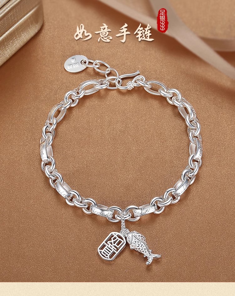 Silver Bracelet for Women 999 Pure Silver Ruyi Carp Fish Bracelet Ethnic Style Love Lock Birthday Gift Pure Silver Jewelry