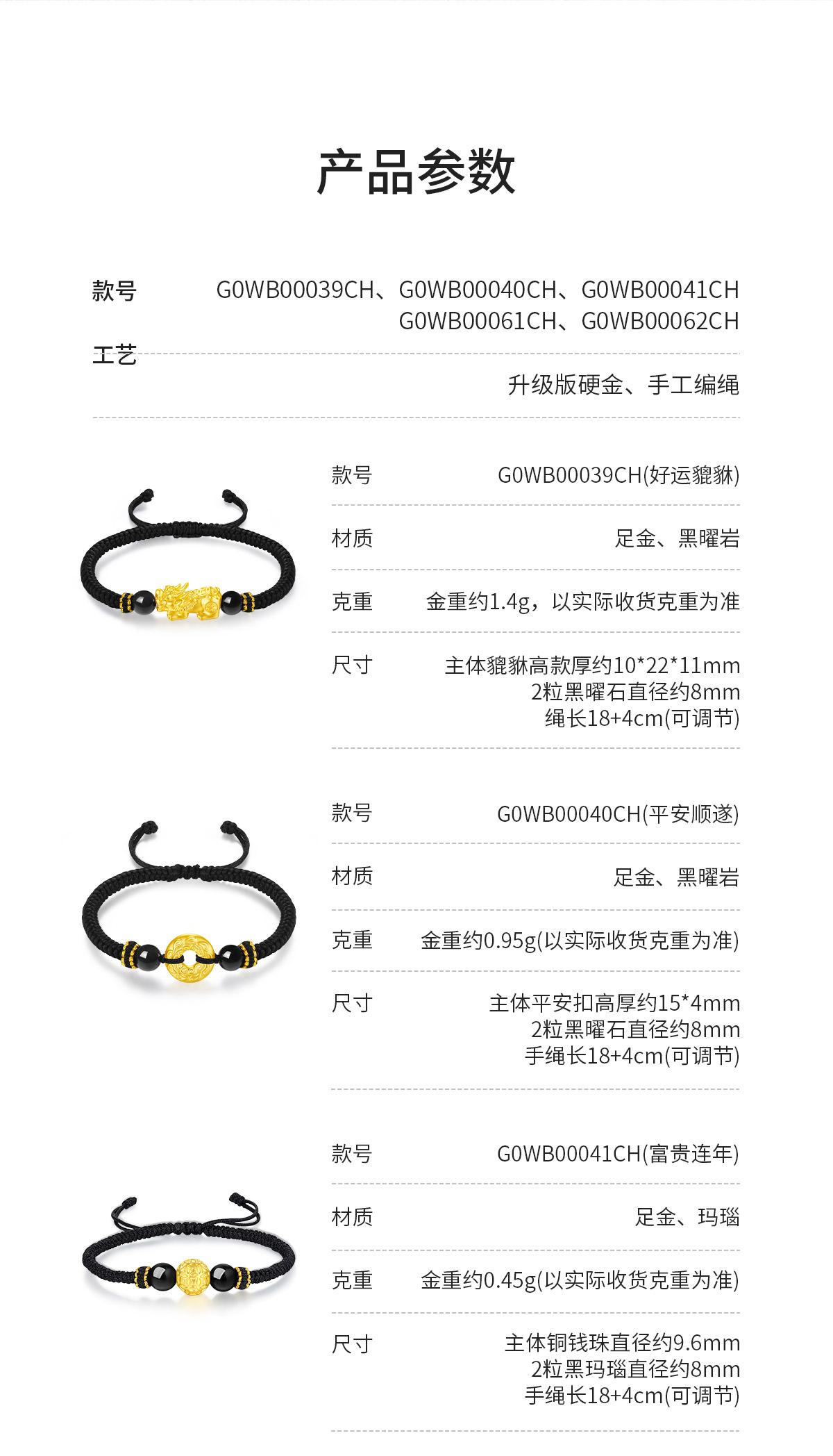 Chow Tai Sang Gold Bracelet Pure Gold Hard Gold Coin Pixiu Fortune Bead Bracelet Black Cord Gift for Boyfriend's Birthday