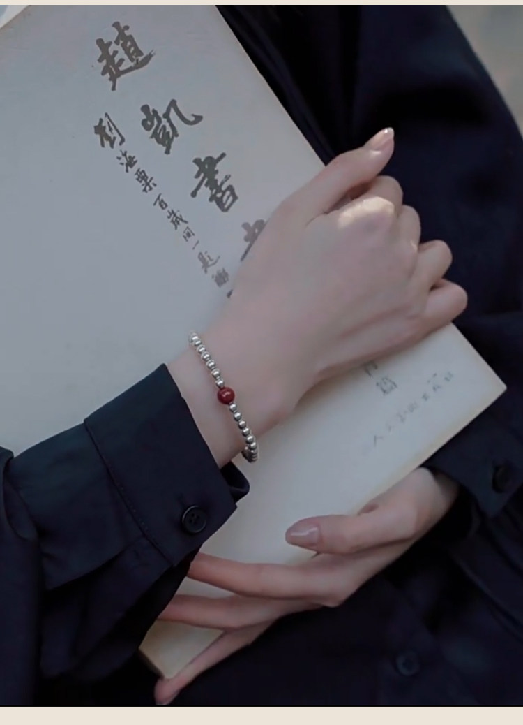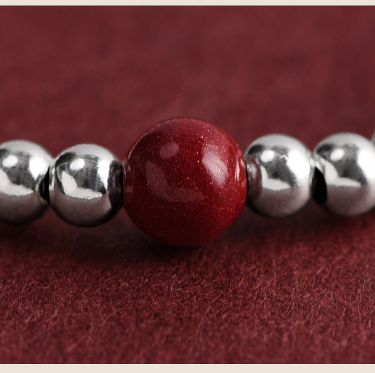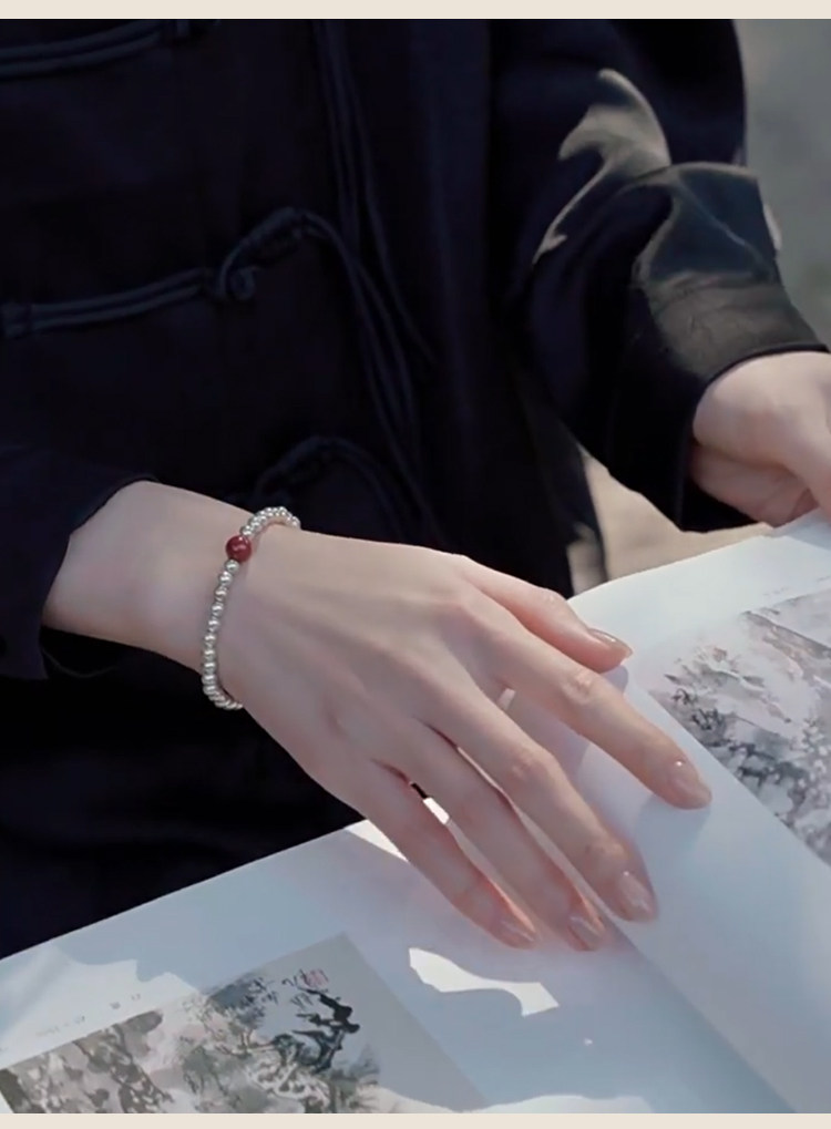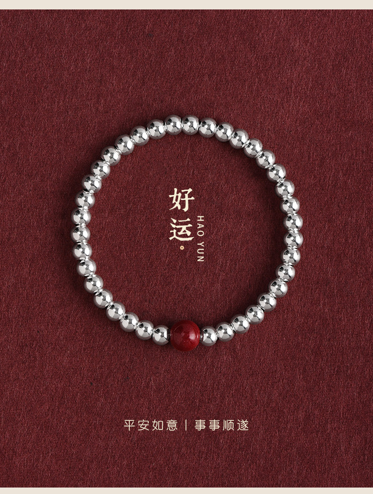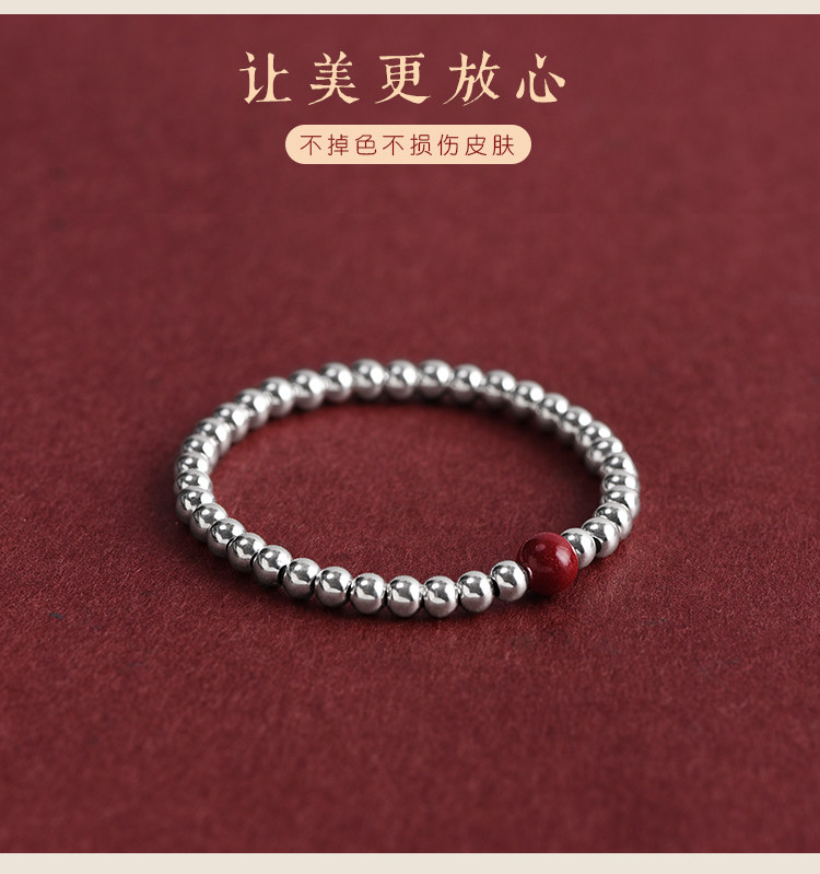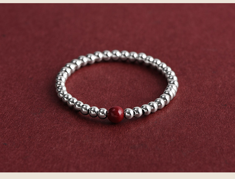 S925 Sterling Silver Fortune Bead Bracelet for Women, Plain Ring with Natural Cinnabar, Simple and Versatile Beaded Bracelet, Niche and Unique