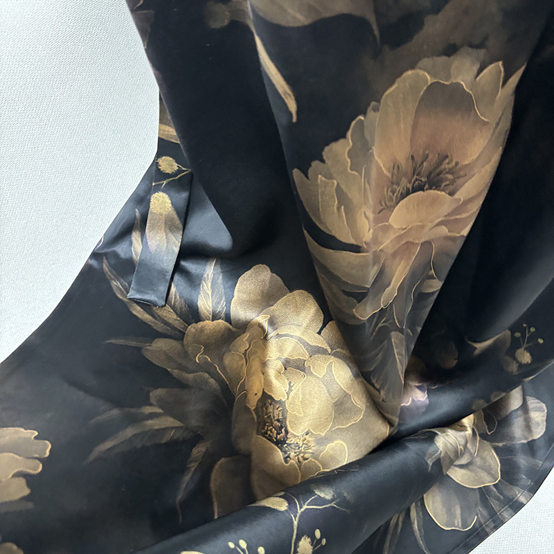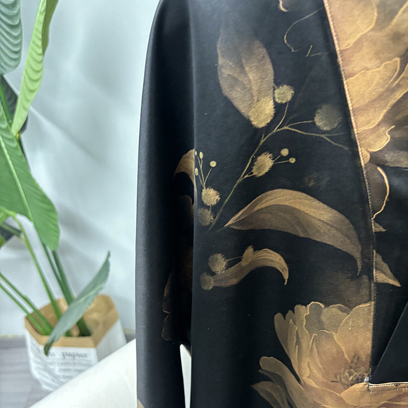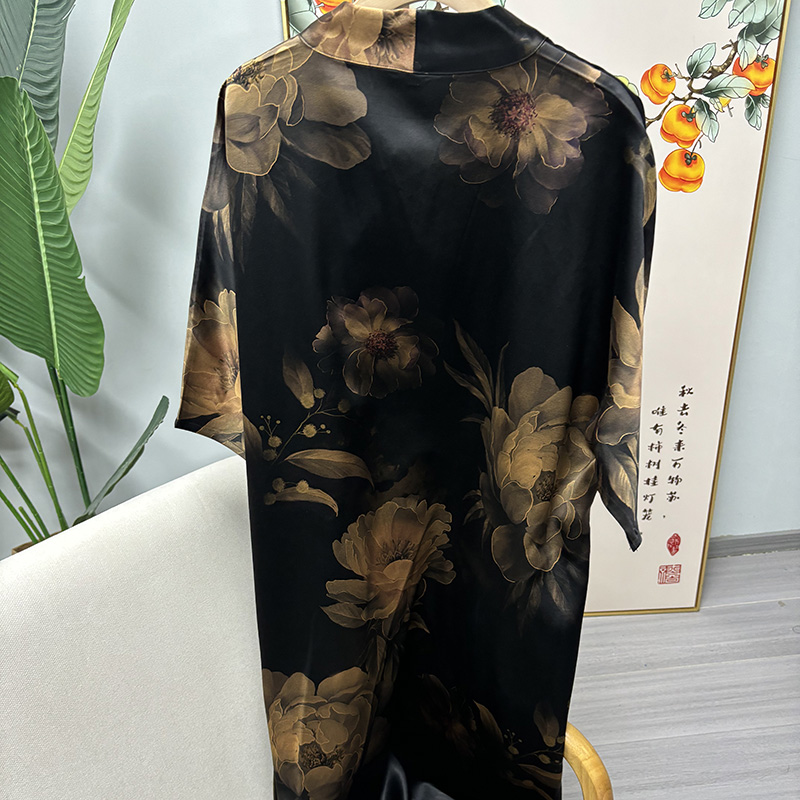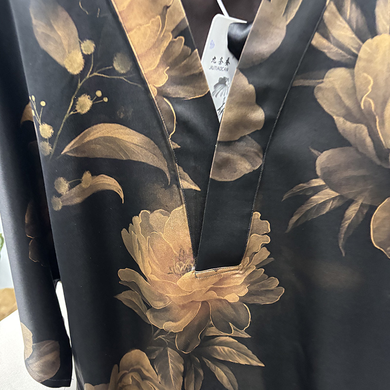 Pre-Nine Silkworm Mulberry Silk Fragrant Cloud Yarn 60 Lady Black Gold Peony Overlapping V Neck Off-Shoulder Robe