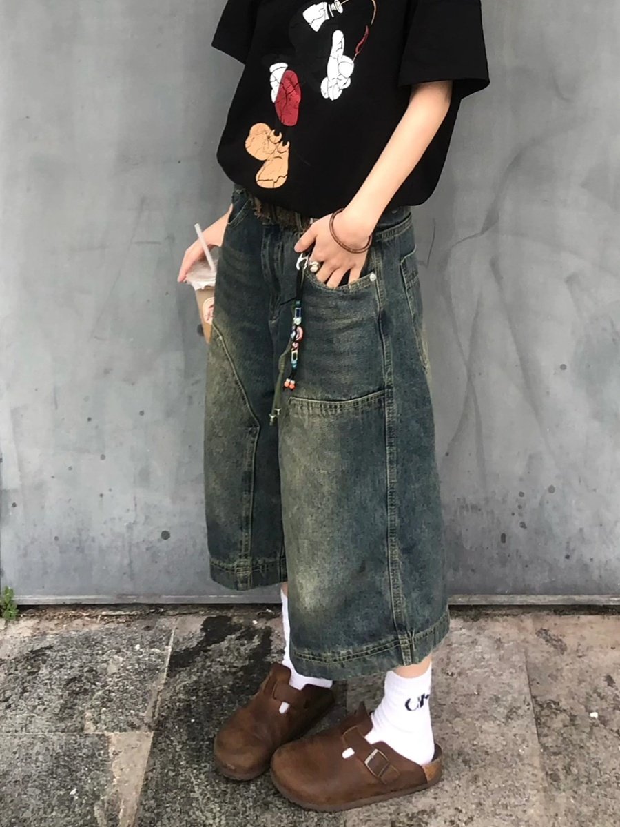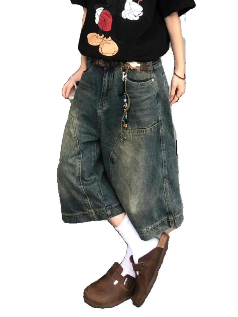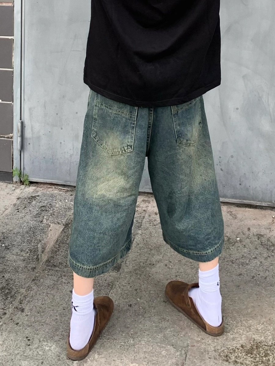 American Street Style Vintage Washed Distressed Denim Shorts Unisex Versatile Casual Loose Mid-Length Pants Wide-Leg Cropped Pants Trendy