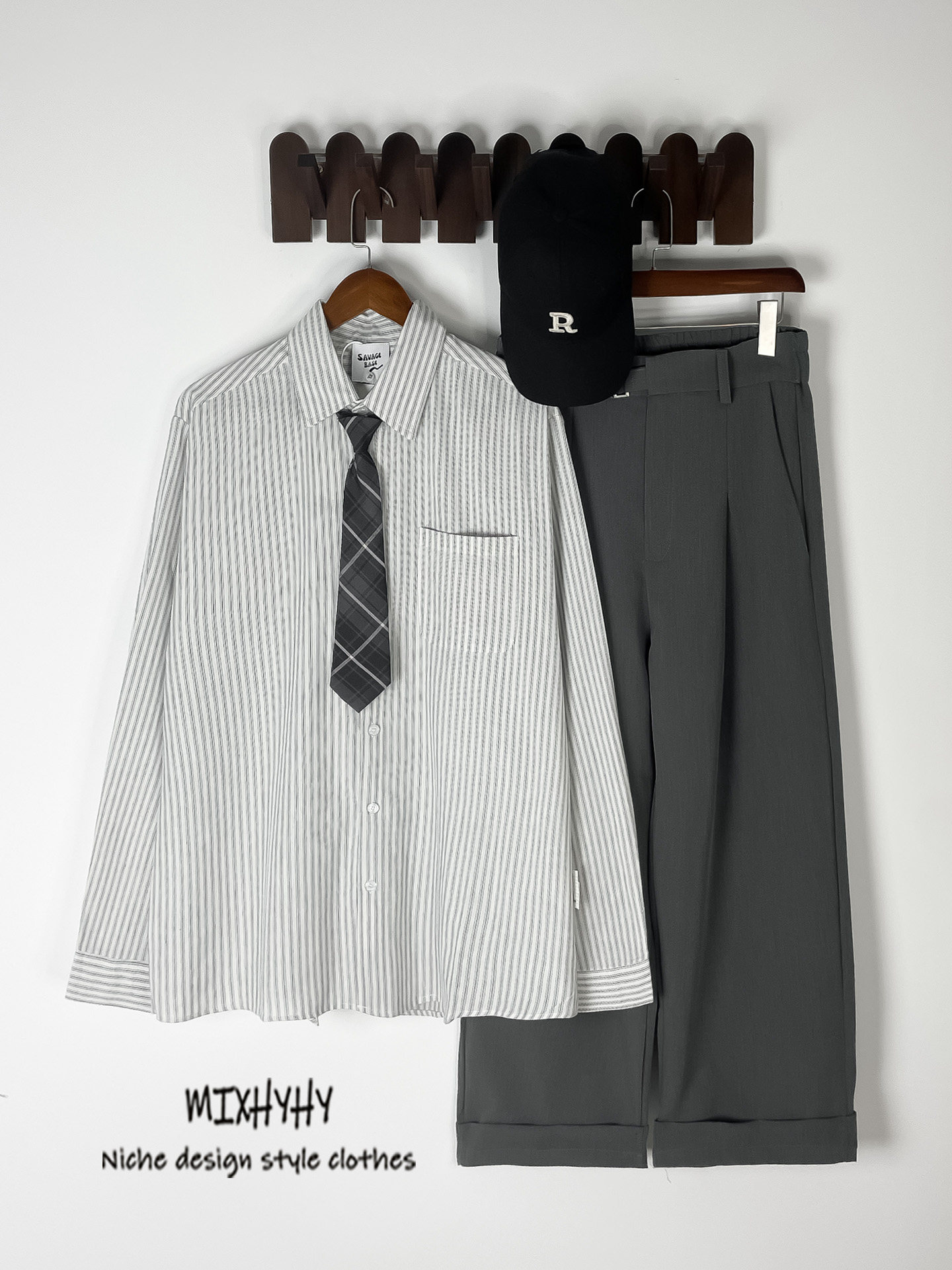 Mixhyhy Gray Japanese Retro Vertical Striped Long-Sleeve Shirt Unisex College Style Versatile Loose Shirt