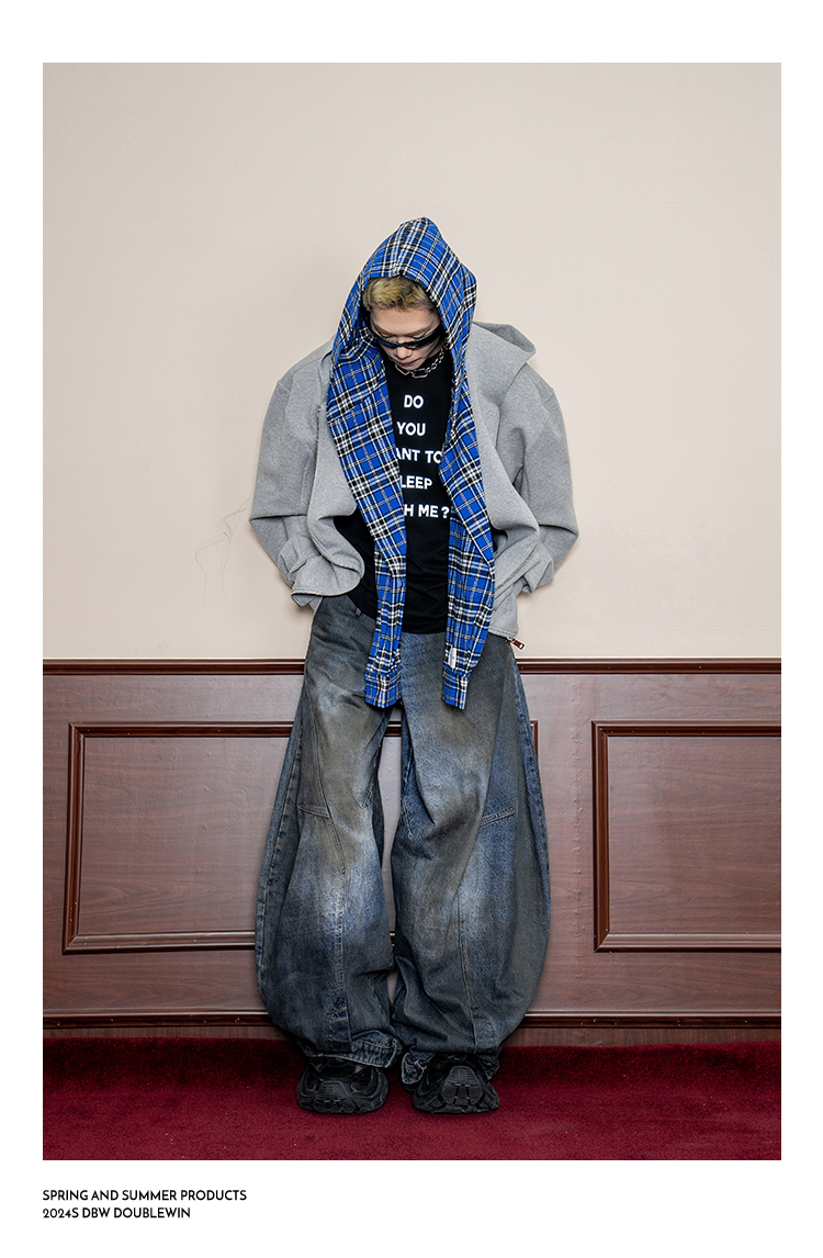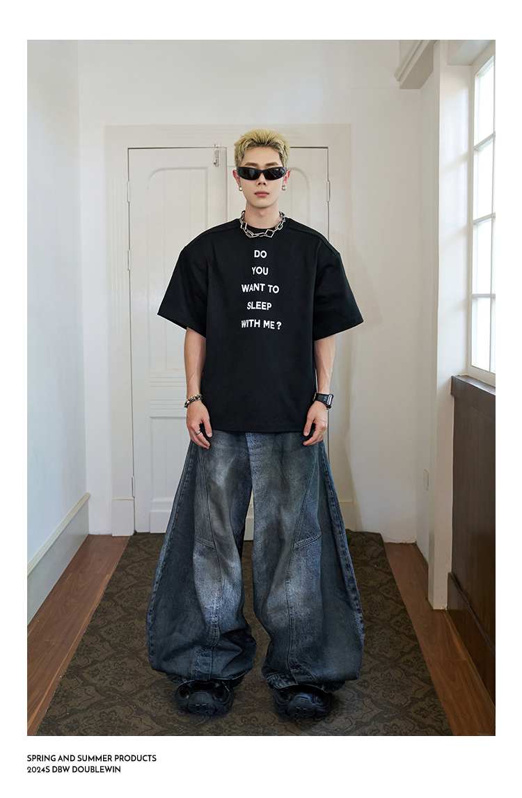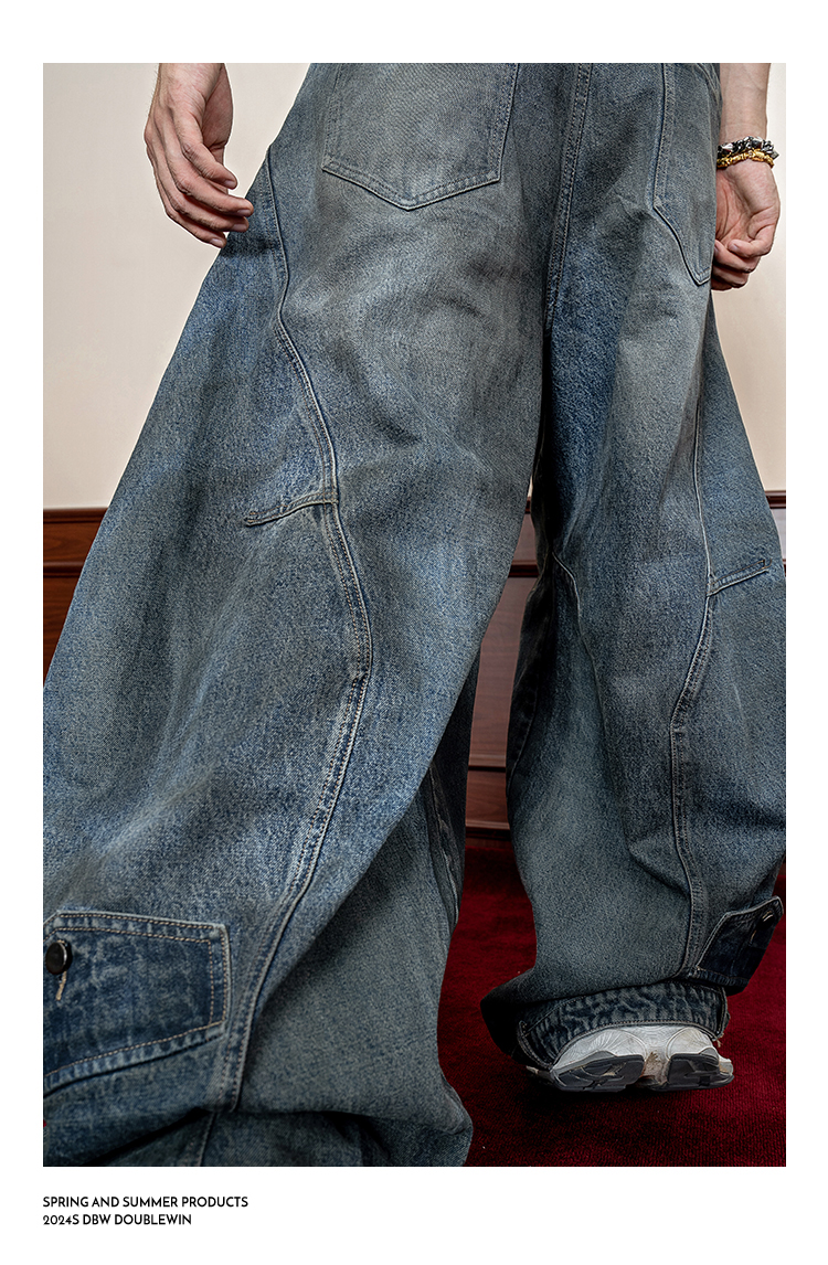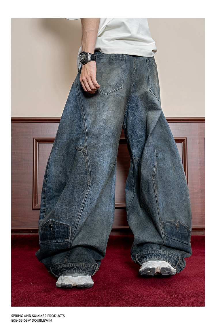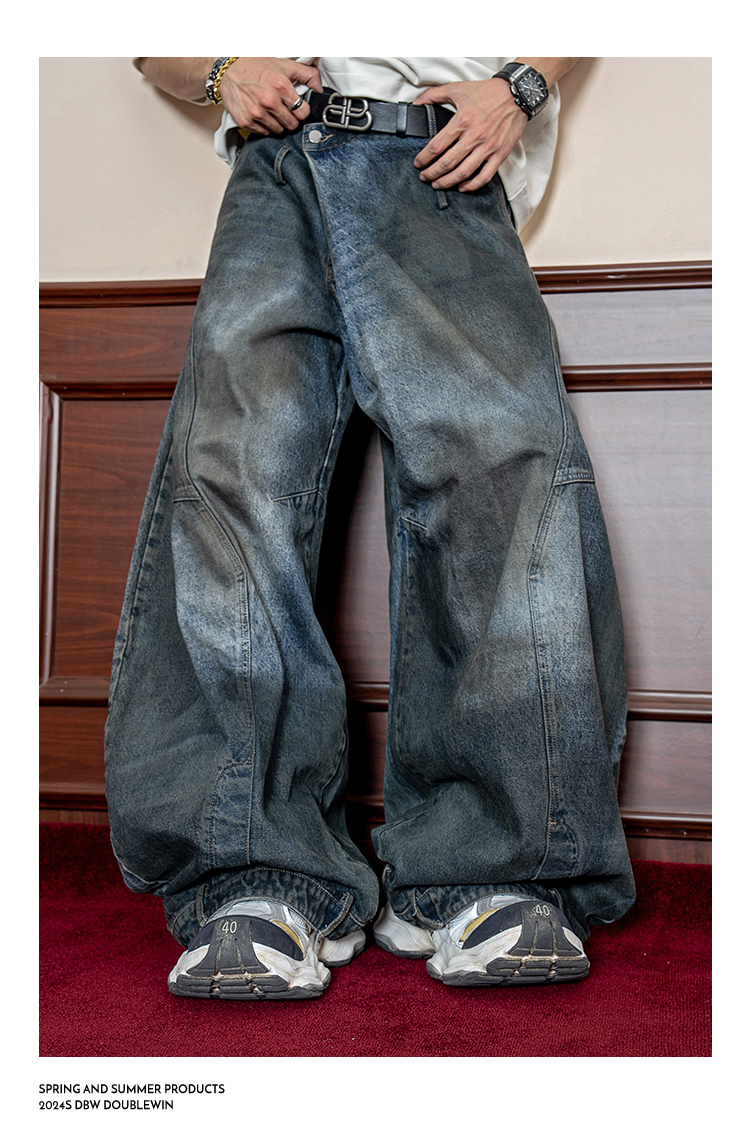 Dbw Doublewin Distressed Faded Denim Jeans for Men, Summer Street Style, Heavy Design, Reversible Waistband, Wide-Leg Pants