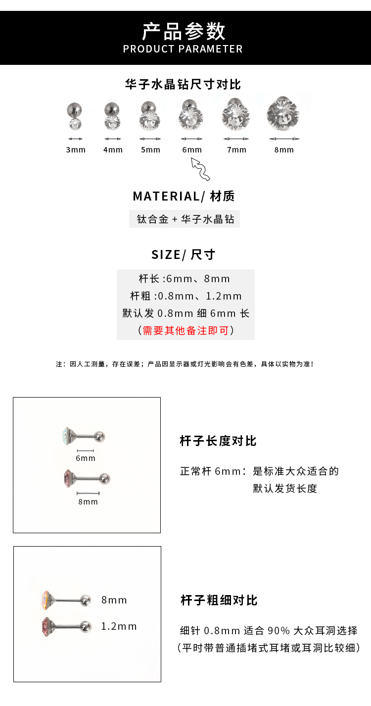 F136 Titanium Alloy Earrings 6mm Colored Diamond Dazzling Ear Studs Unique Ear Cartilage Studs