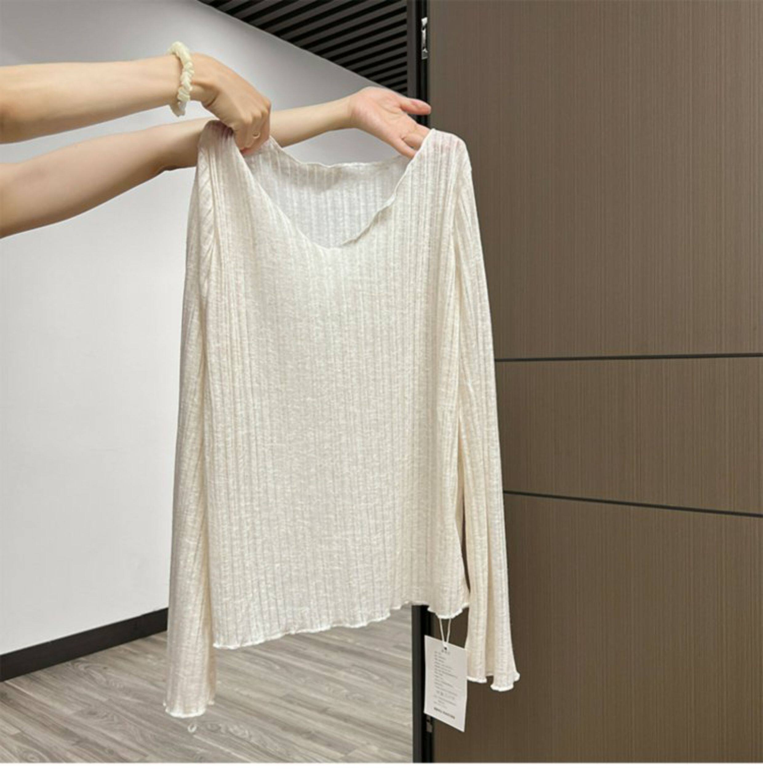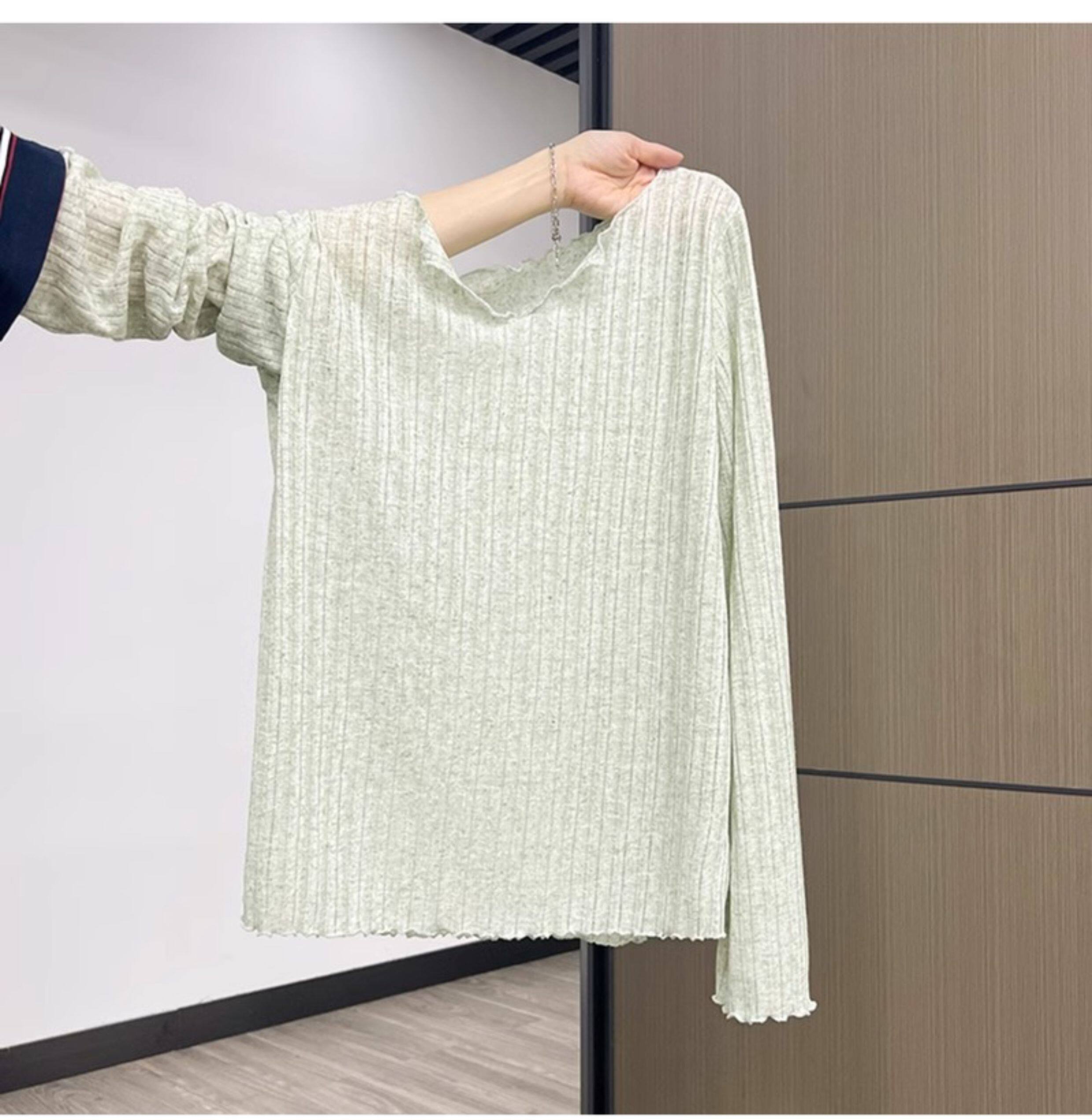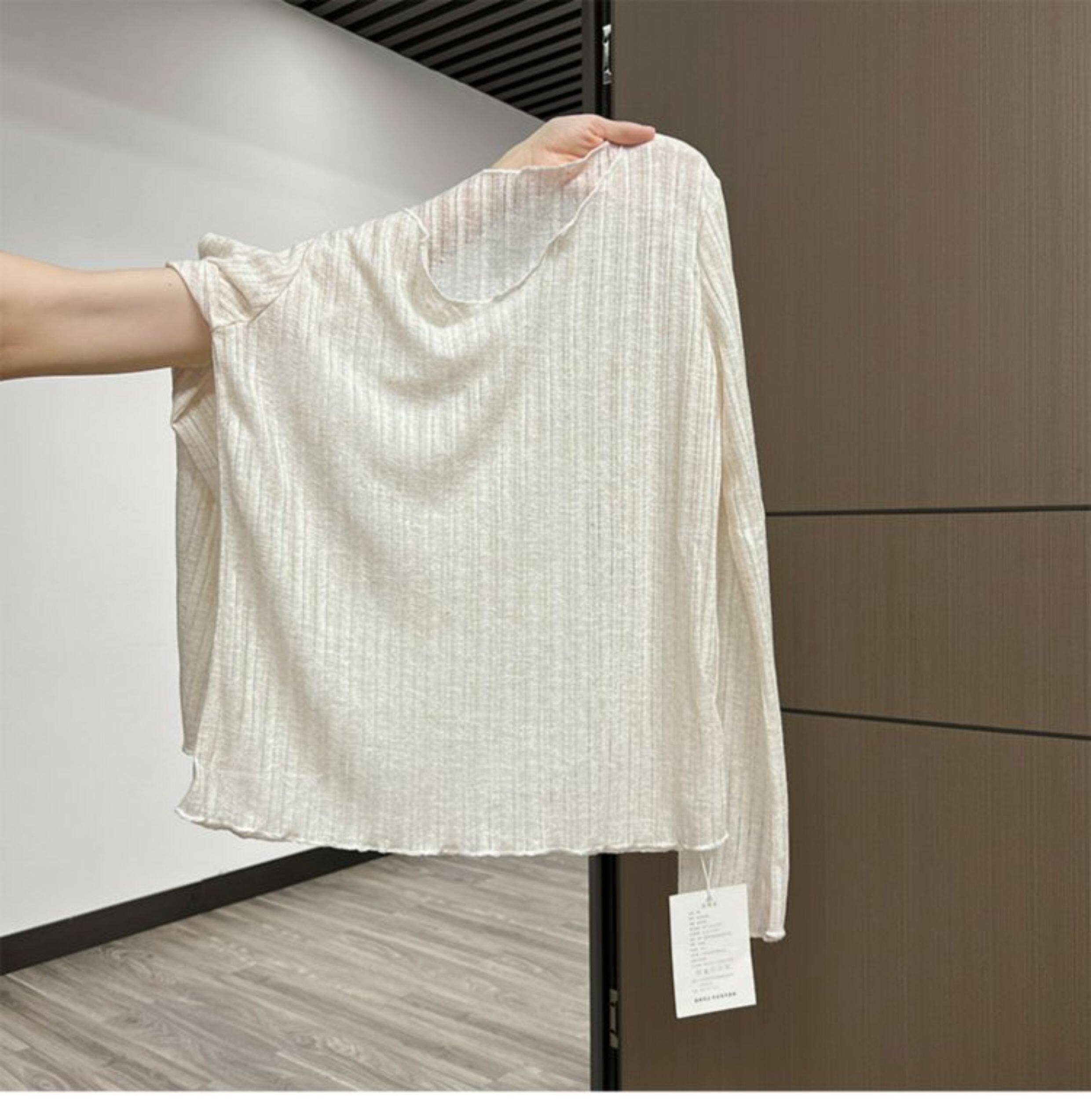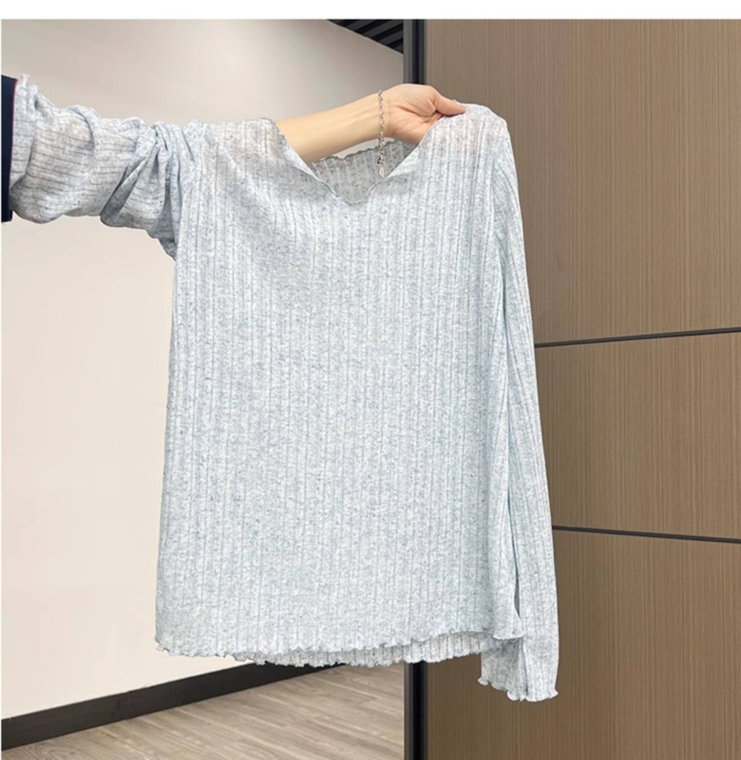 Spring and Summer Apricot-Colored Semi-Sheer Ruffled V-Neck Long-Sleeve Base Shirt for Women, Thin Air-Conditioning Cover-Up, Loose T-Shirt with a High-End Feel