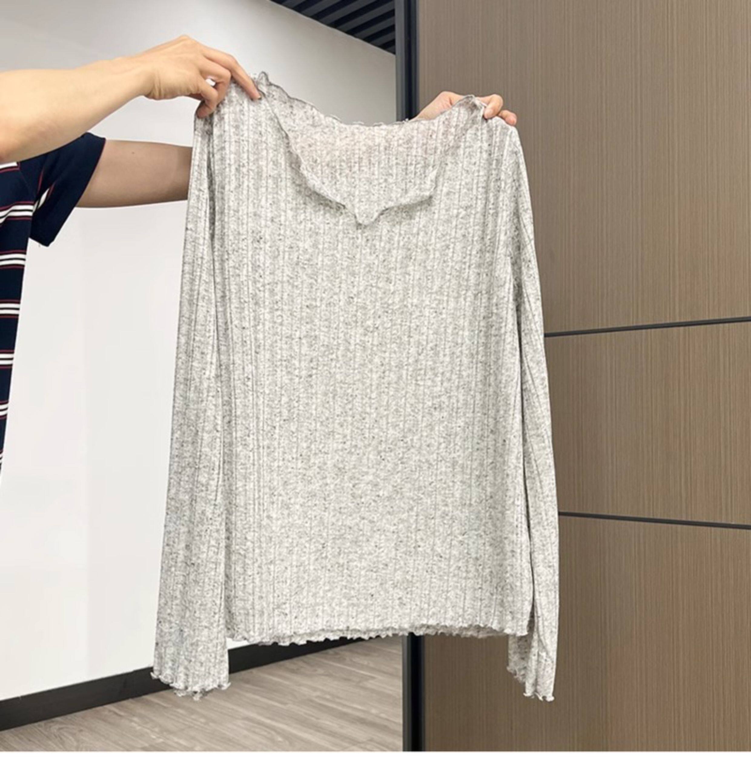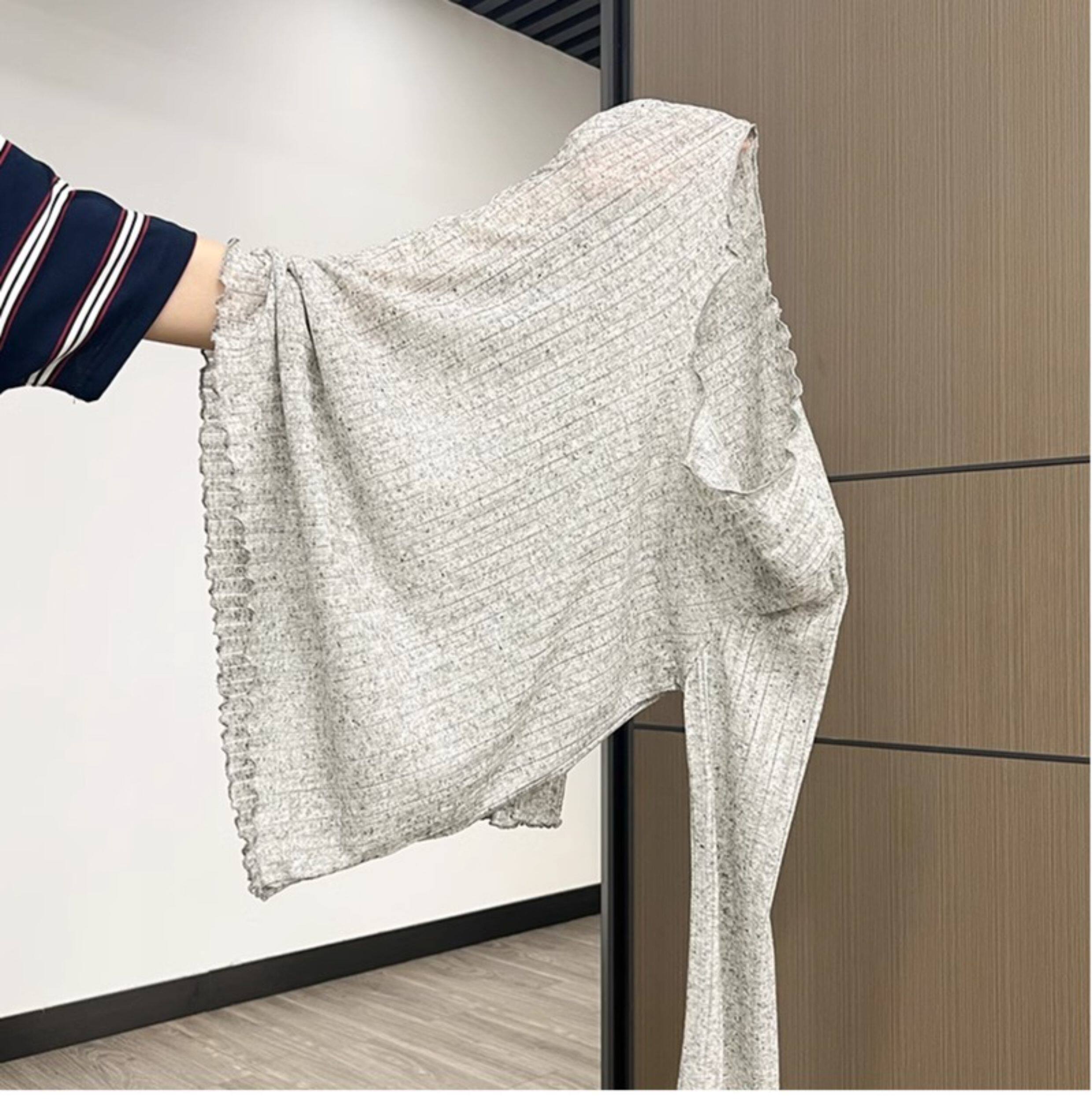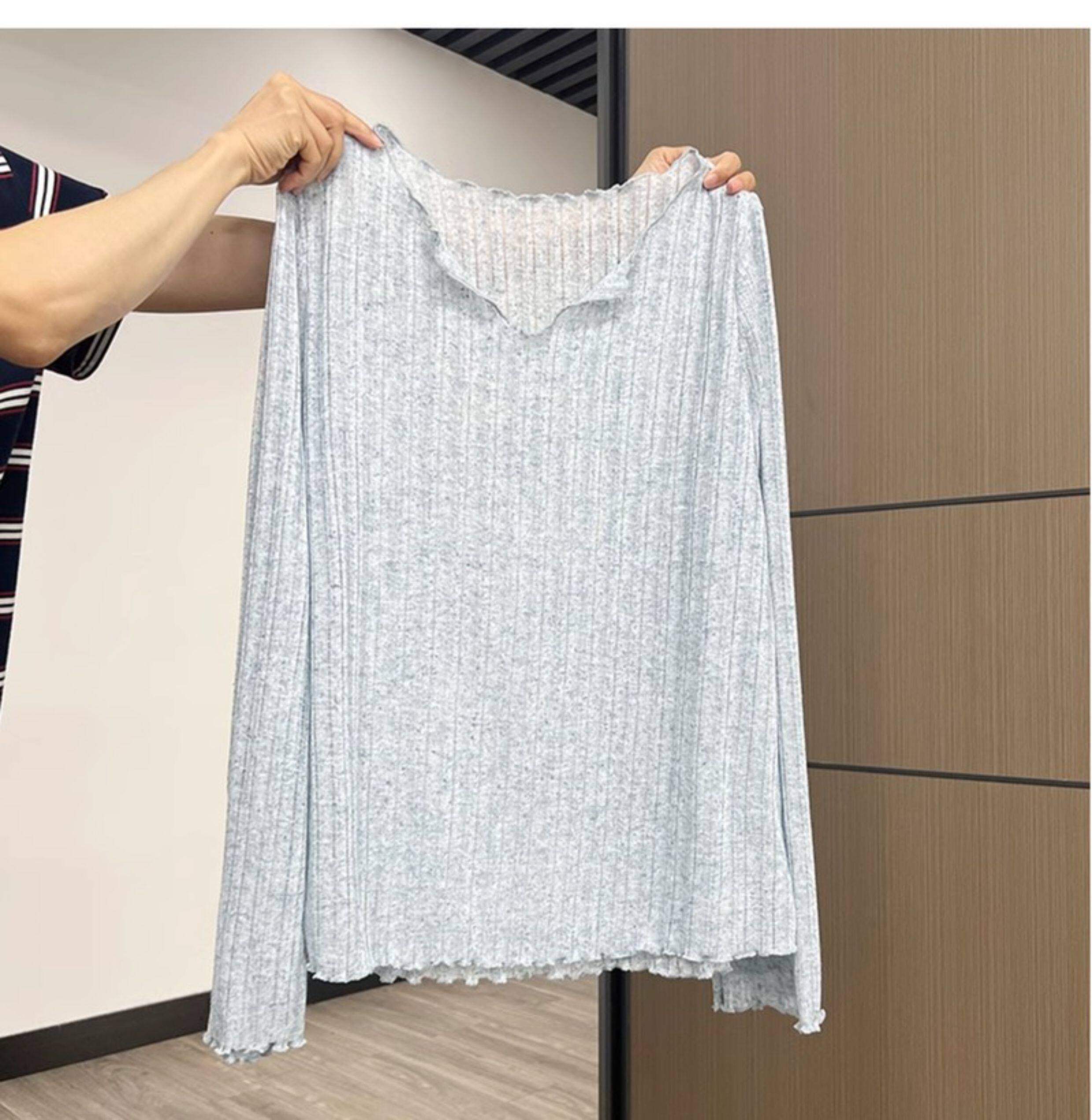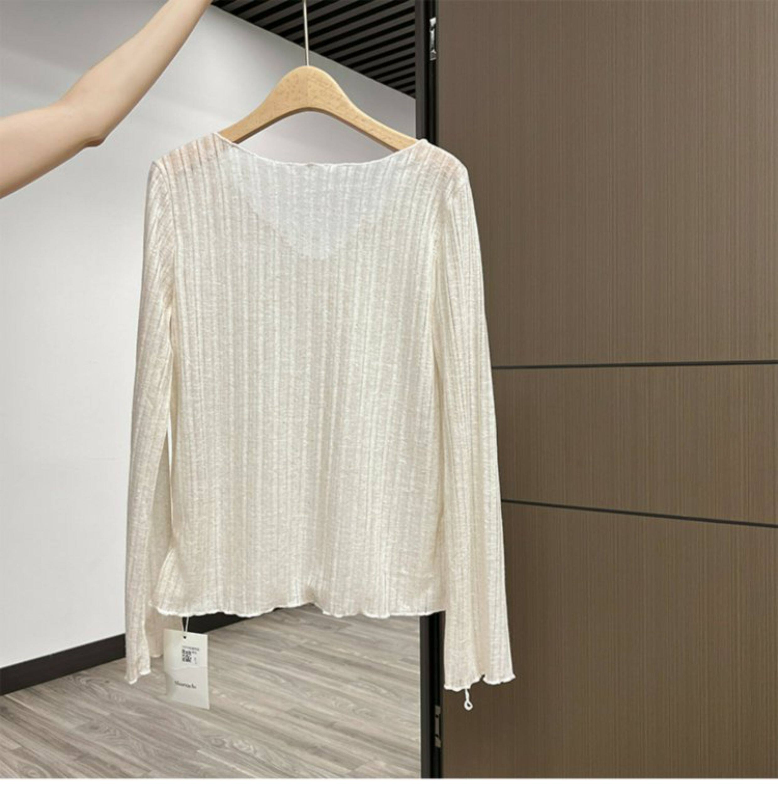 Spring and Summer Apricot-Colored Semi-Sheer Ruffled V-Neck Long-Sleeve Base Shirt for Women, Thin Air-Conditioning Cover-Up, Loose T-Shirt with a High-End Feel
